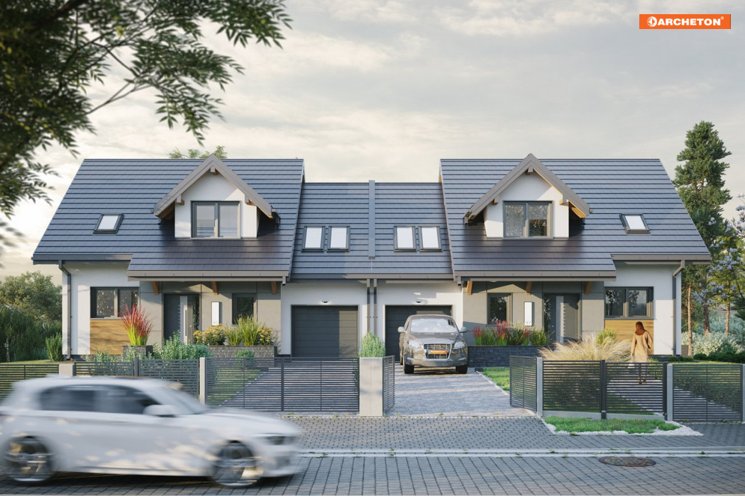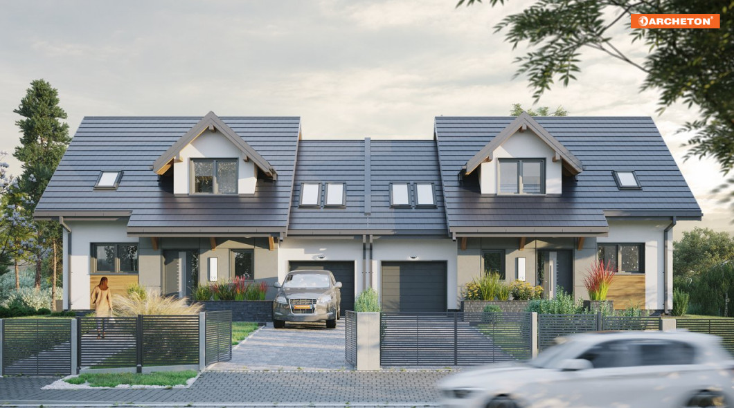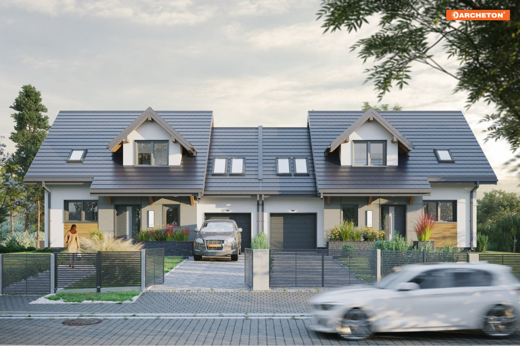 Tosia Nano Duo to projekt bliźniaków połączonych garażem. Już z daleka budynek przykuwa wzrok nietuzinkowym kształtem i dynamiczną bryłą.