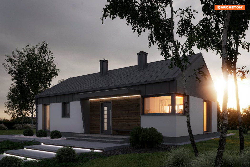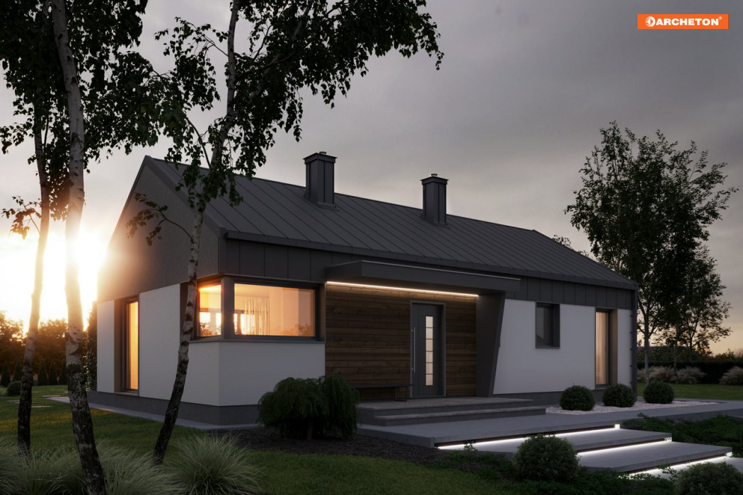 Na projekt Jaskier Alfa powinni zwrócić uwagę miłośnicy nowoczesnych, minimalistycznych budynków, w których nawet elementy pełniące praktyczną funkcję (np. zadaszenie nad drzwiami tarasowymi) podporządkowane są zasadom umiaru, geometrii i prostoty. Uwagę przykuwa zarówno konstrukcja budynku, jak i kolorystyka – szary odcień zdominował tu stolarkę okienną, drzwiową, jak i dach bezokapowy. Dom Jaskier Alfa będzie idealny dla czteroosobowej rodziny, która do dyspozycji ma 81,3 m². Oprócz pokoju dziennego (połączonego z kuchnią i jadalnią) są tu trzy dodatkowe pokoje oraz dwie łazienki, rozmieszczone tak, by jedna pełniła funkcję prywatną, a druga – gościnną. Liczne okna: duże, sięgające aż do podłogi w pokojach usytuowanych od strony ogrodu oraz na jednej ze ścian szczytowych, a także okno narożne w kuchni i przeszklenia w salonie prowadzące na taras sprawiają, że przestrzeń jest doskonale doświetlona.
