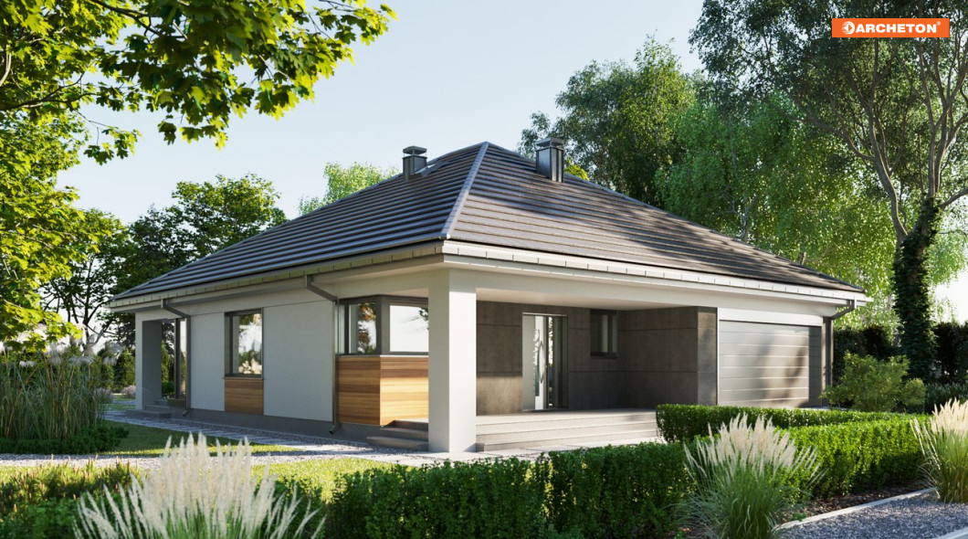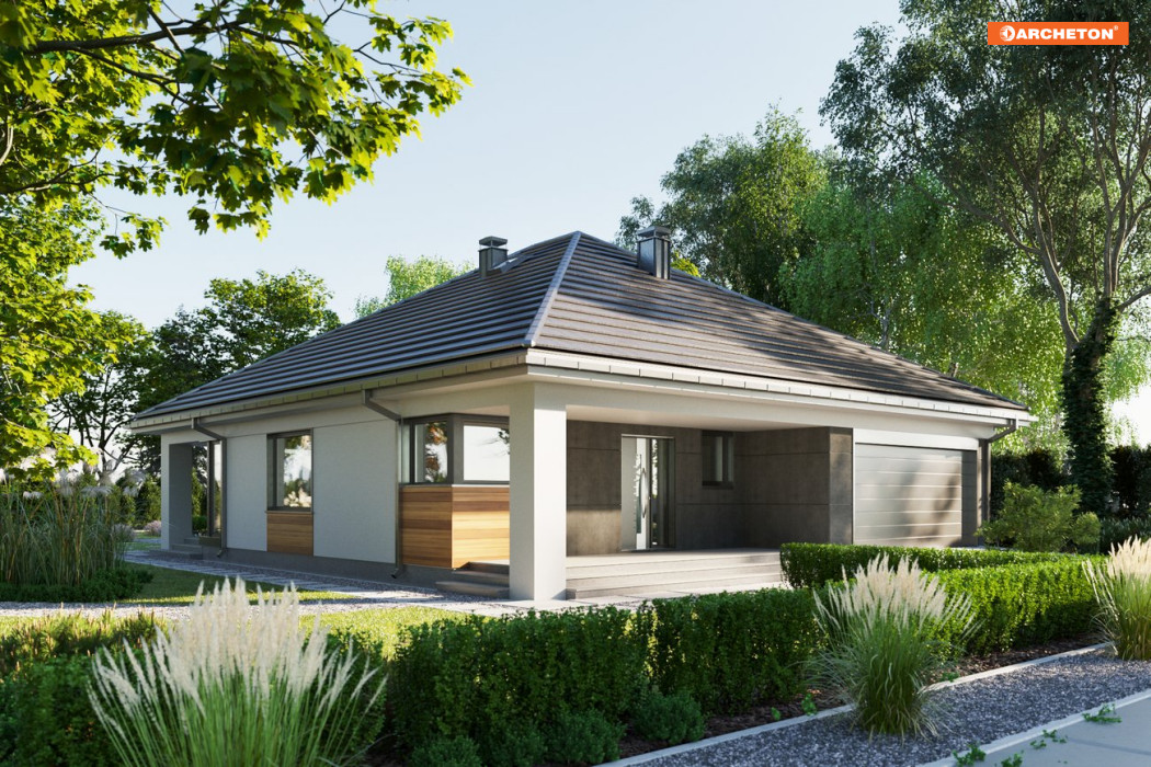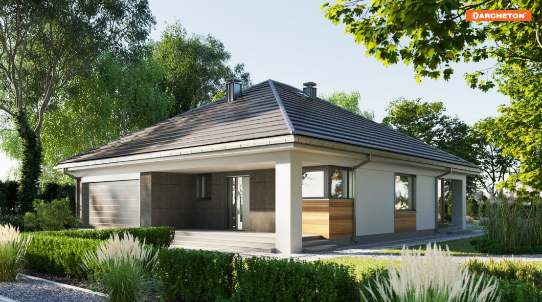 Kordian Nano to nowoczesny dom parterowy z garażem dwustanowiskowym. Czterospadowy dach z kalenicą i dwa tarasy mieszczące się w obrysie budynku to główne wyróżniki tego projektu. Układ pomieszczeń w środku rozplanowano tak, aby zaspokoić potrzeby 4-osobowej rodziny.