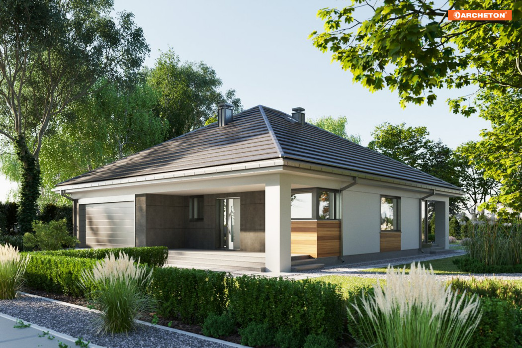 Nowoczesny dom parterowy z garażem dwustanowiskowym ma zwartą bryłę, która daje wrażenie solidności i trwałości, a lekkości nadają jej detale: jasna elewacja, szare akcenty wokół wejścia i bramy garażowej, czy ocieplające wstawki drewnopodobne (m.in. od strony tarasu czy pod oknami kuchennymi).