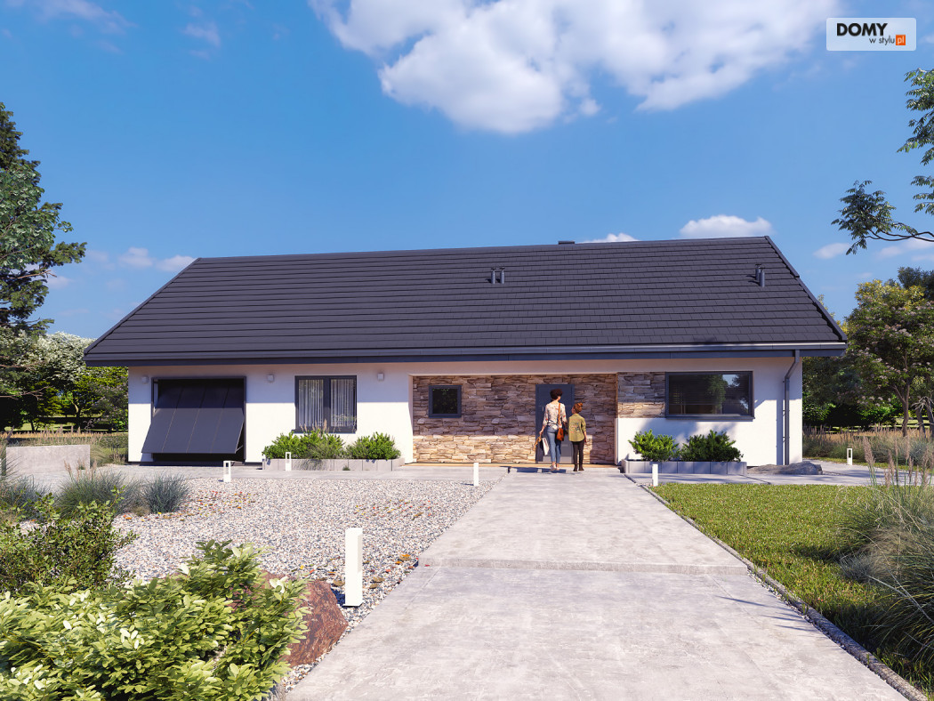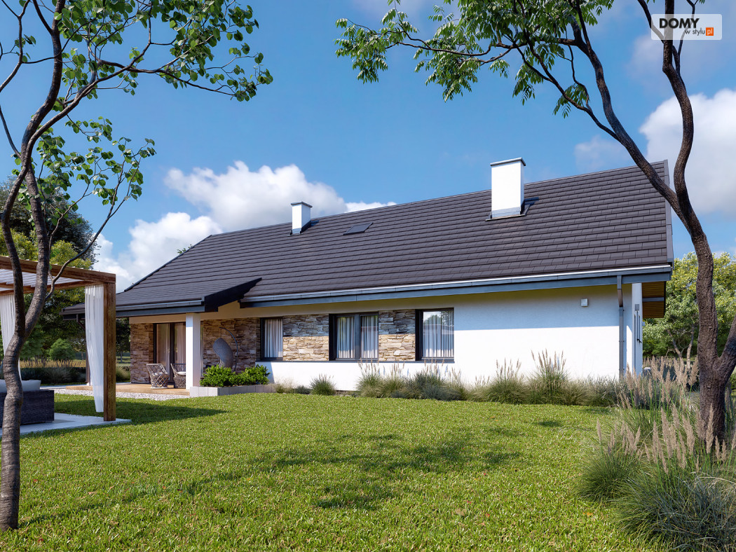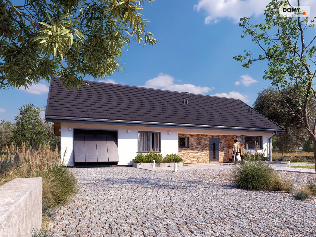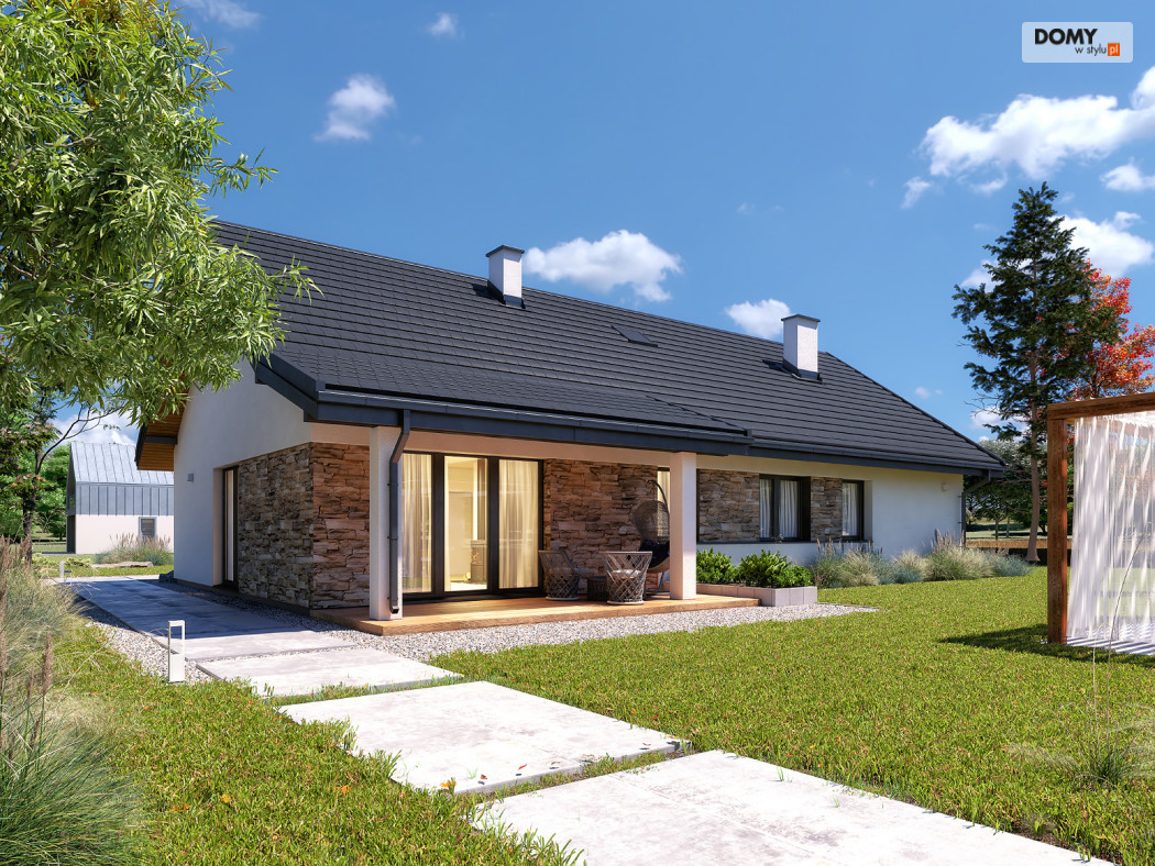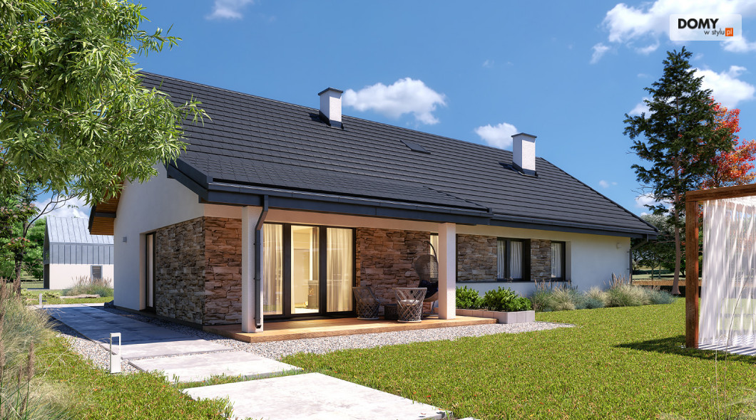 Awokado 4 to projekt domu parterowego z jednostanowiskowym garażem. Układ funkcjonalny został podzielony na strefę dzienną, nocną i gospodarczą. Strefa dzienna to otwarta kuchnia ze spiżarnią i przestronny salon z miejscem na duży stół jadalniany. Strefa nocna to ogólnodostępna łazienka, trzy sypialnie, w tym jedna z prywatną łazienką i garderobą. W strefie gospodarczej znajduje się niewielkie pomieszczenie gospodarcze, które pełni funkcję przejścia do garażu oraz kotłowni. Z kotłowni zaprojektowano oddzielne wejście z zewnątrz do domu. Głównym atutem projektu jest zadaszony taras dostępny z salonu.