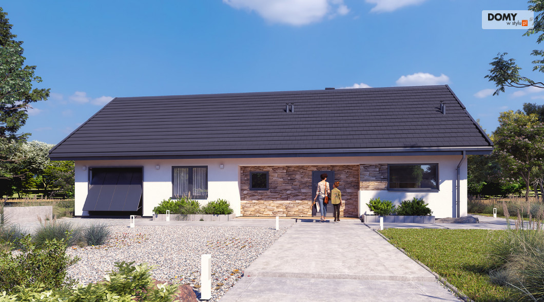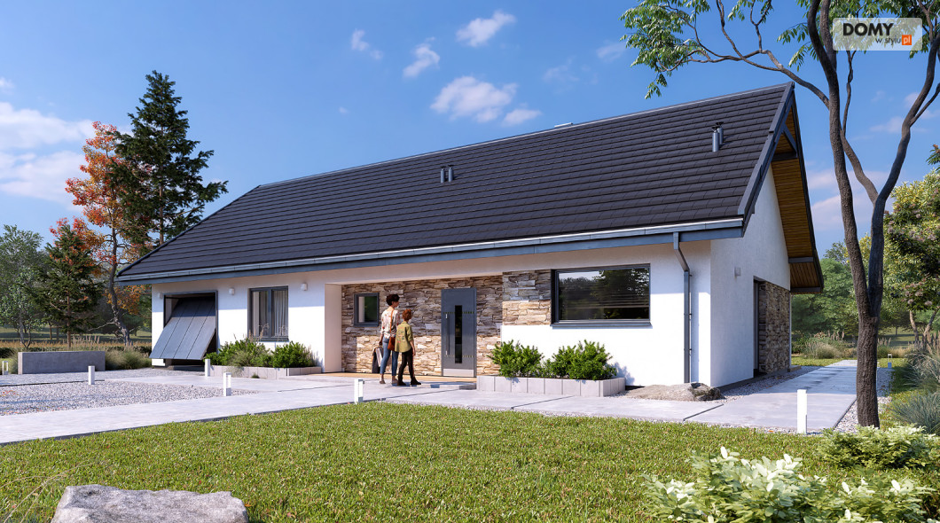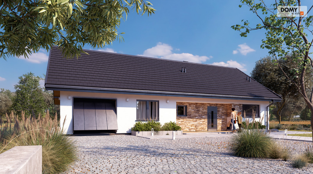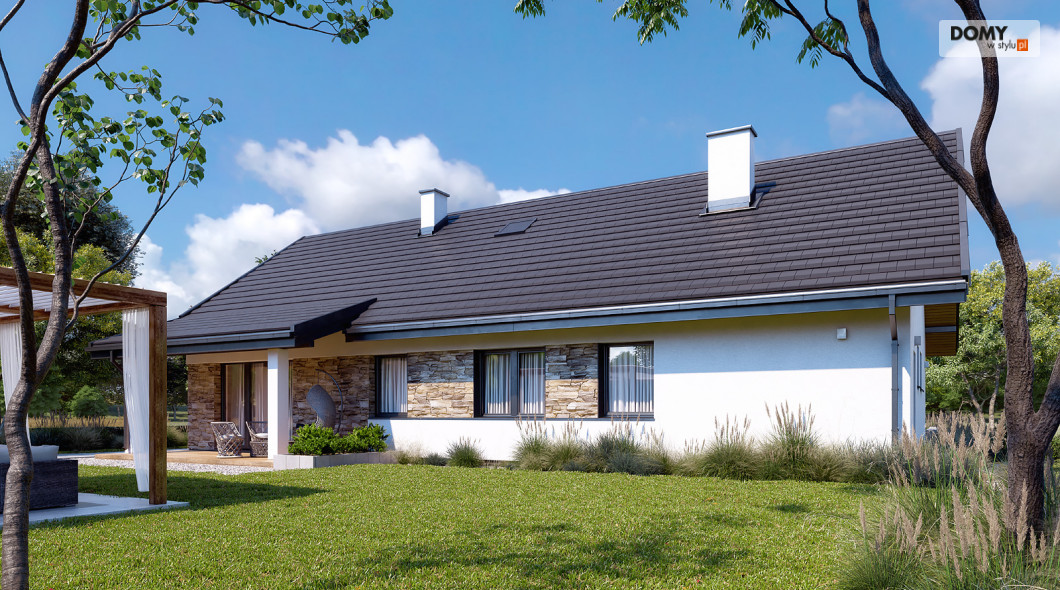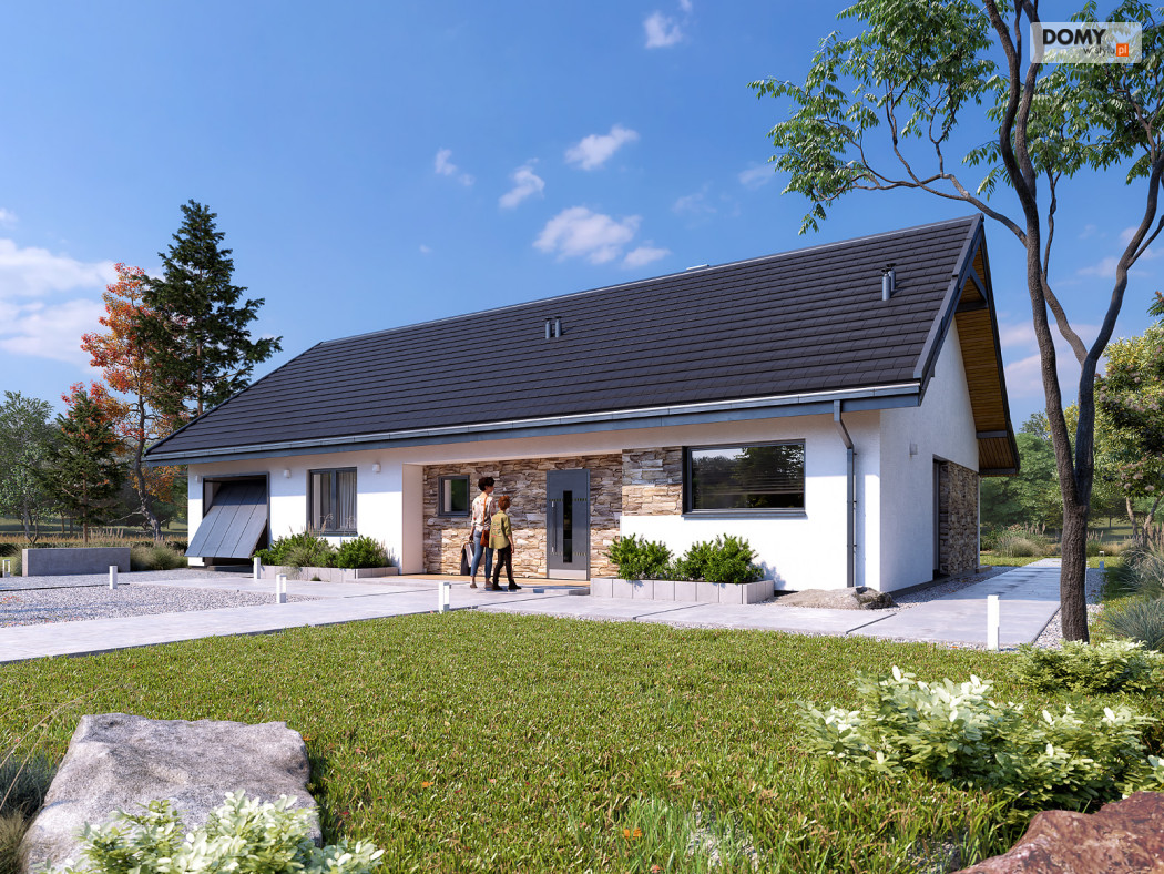 Awokado 4 to projekt domu parterowego z jednostanowiskowym garażem. Układ funkcjonalny został podzielony na strefę dzienną, nocną i gospodarczą. Strefa dzienna to otwarta kuchnia ze spiżarnią i przestronny salon z miejscem na duży stół jadalniany. Strefa nocna to ogólnodostępna łazienka, trzy sypialnie, w tym jedna z prywatną łazienką i garderobą. W strefie gospodarczej znajduje się niewielkie pomieszczenie gospodarcze, które pełni funkcję przejścia do garażu oraz kotłowni. Z kotłowni zaprojektowano oddzielne wejście z zewnątrz do domu. Głównym atutem projektu jest zadaszony taras dostępny z salonu.