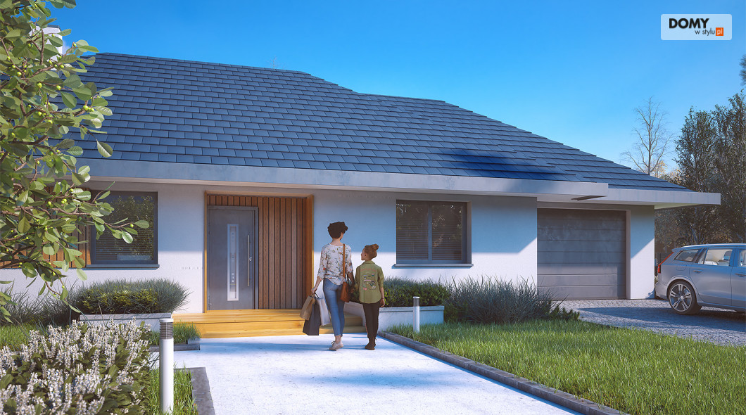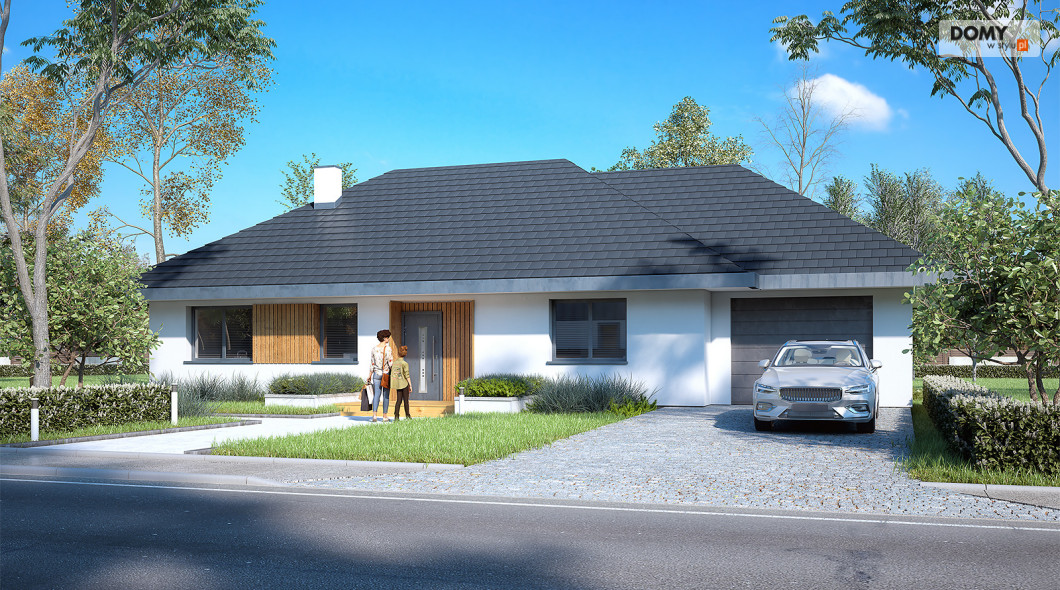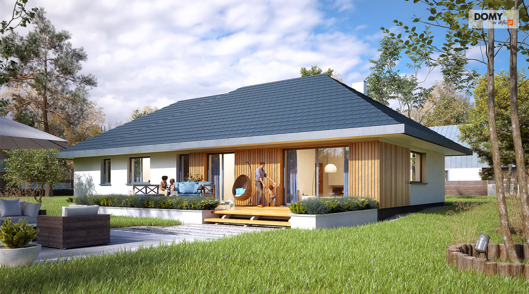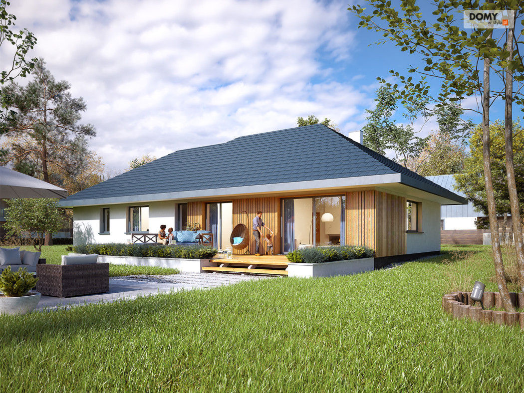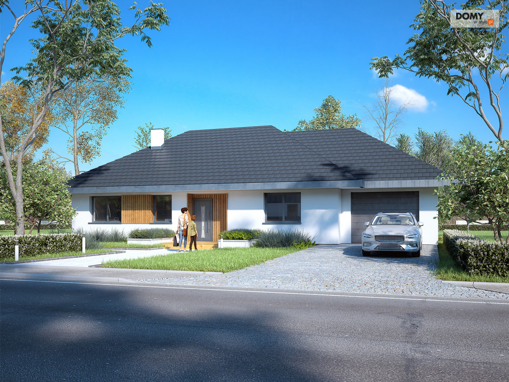 Gwiazdka to projekt domu parterowego o powierzchni 114 m2. To odpowiedź na potrzeby inwestorów, którzy szukają prostoty i funkcjonalności w budynku mieszkalnym. Układ budynku podzielono na trzy strefy użytkowe. Część dzienna to salon z jadalnią i otwarta kuchnia. W części nocnej zaprojektowano trzy wygodne sypialnie oraz rodzinną łazienkę. Część gospodarczą stanowi jednostanowiskowy garaż oraz duża kotłownia.