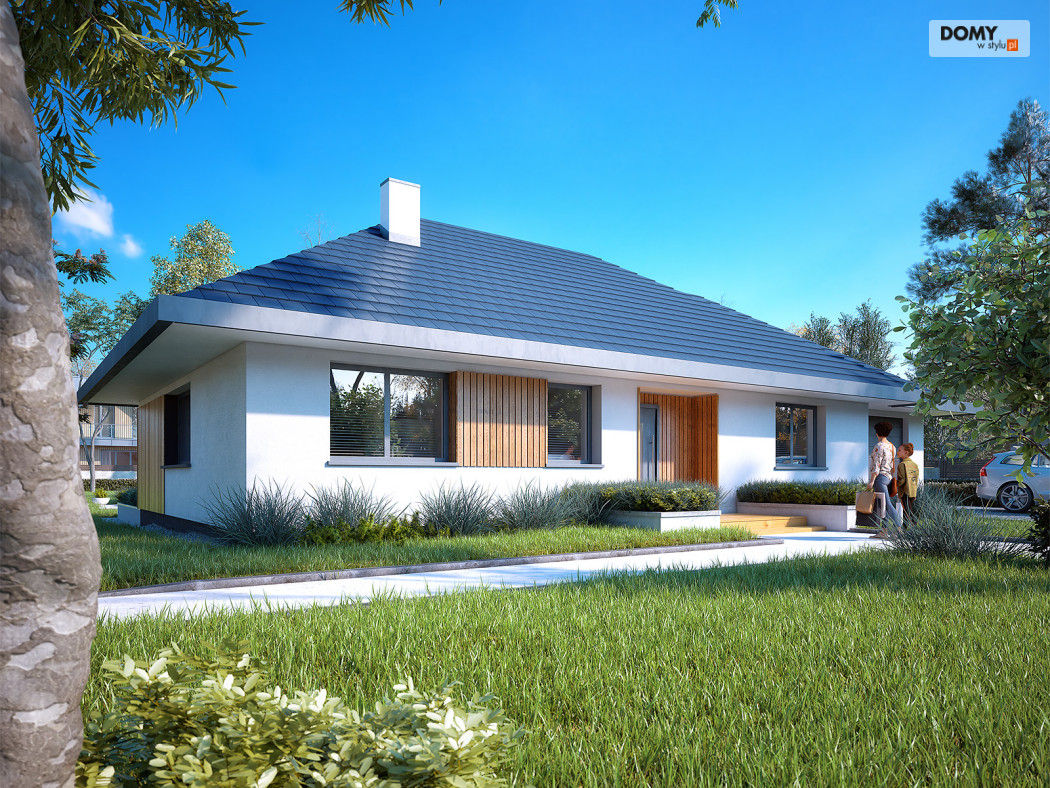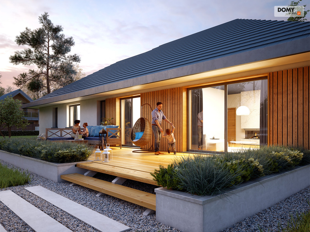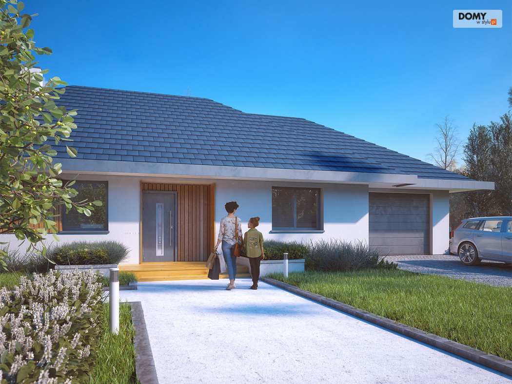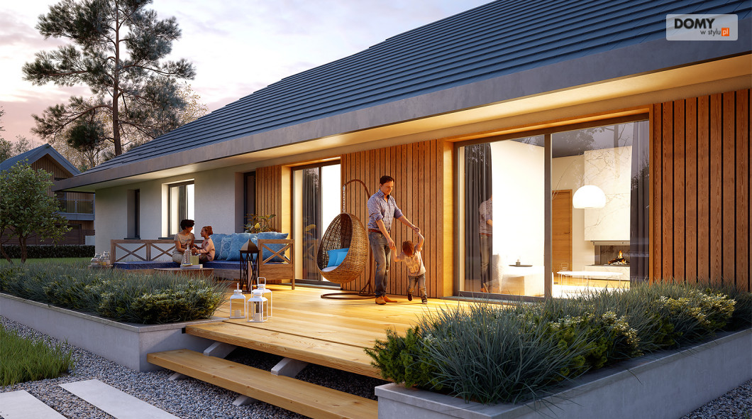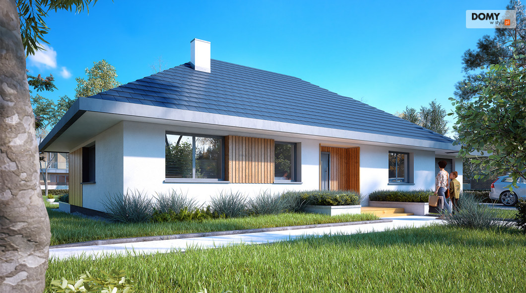 Gwiazdka to projekt domu parterowego o powierzchni 114 m2. To odpowiedź na potrzeby inwestorów, którzy szukają prostoty i funkcjonalności w budynku mieszkalnym. Układ budynku podzielono na trzy strefy użytkowe. Część dzienna to salon z jadalnią i otwarta kuchnia. W części nocnej zaprojektowano trzy wygodne sypialnie oraz rodzinną łazienkę. Część gospodarczą stanowi jednostanowiskowy garaż oraz duża kotłownia.