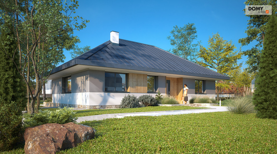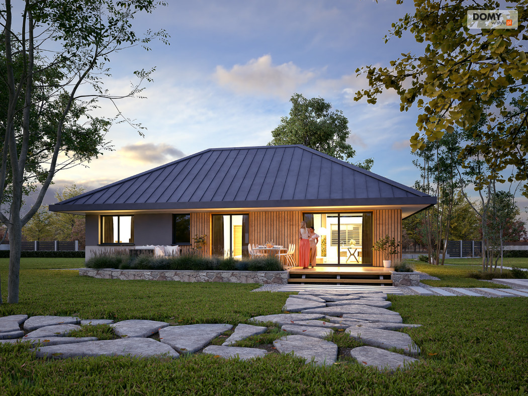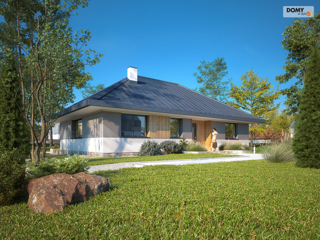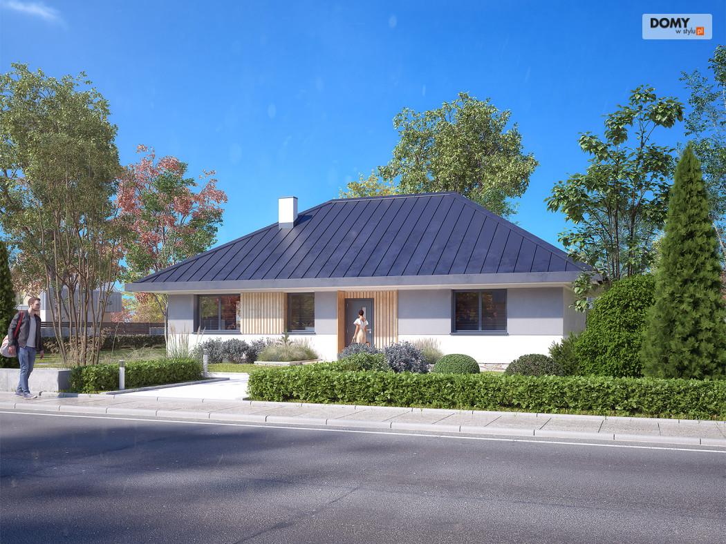 Gwiazdka 2 to projekt domu parterowego o powierzchni 106 m2. To propozycja projektowa dla 4-osobowej rodziny. Projekt posiada otwarta część dzienna z licznymi przeszkleniami. Zaprojektowano tu salon, dużą jadalnię i otwartą kuchnię. Mieszkańcy do dyspozycji mają trzy wygodne sypialnie oraz rodzinną łazienkę. Układ funkcjonalny domu dopełnia dodatkowy pokój przewidziany jako gabinet do pracy lub nauki oraz wiatrołap z miejscem na pojemna szafę. Projekt utrzymany został w nowoczesnym stylu.