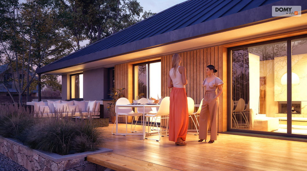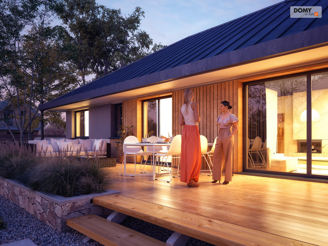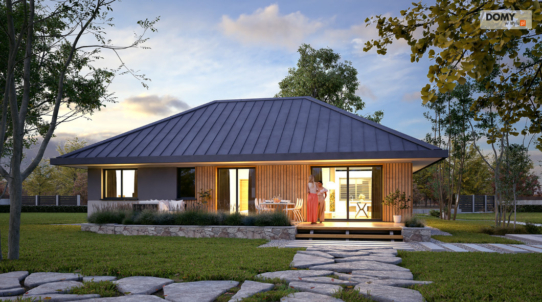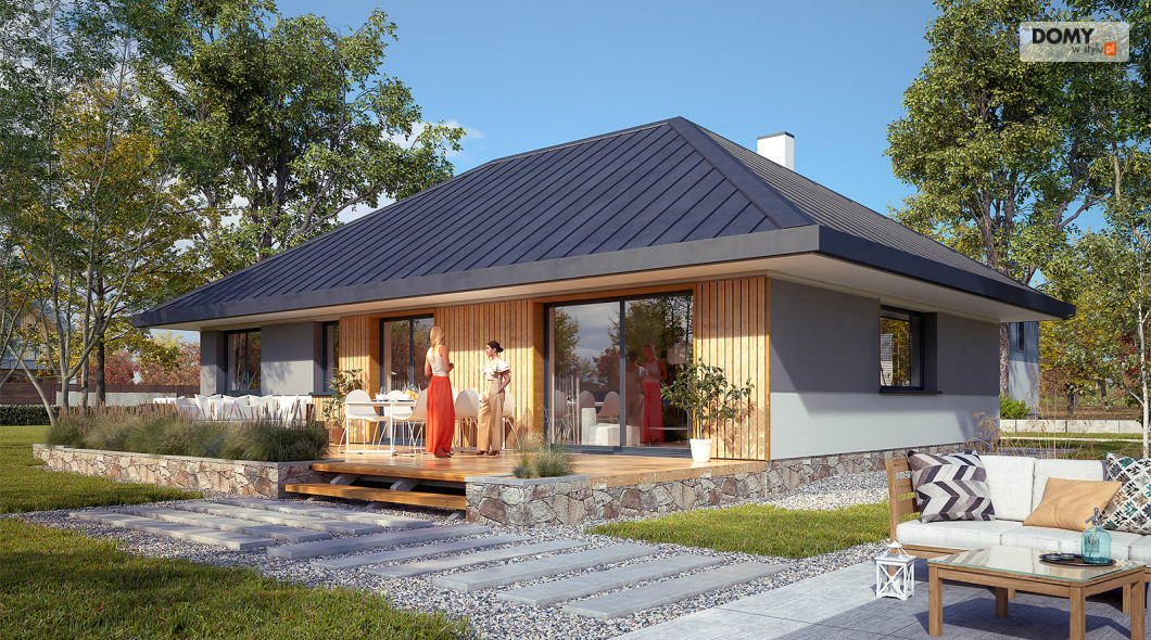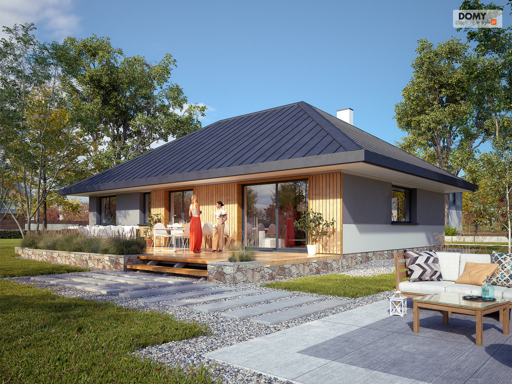 Gwiazdka 2 to projekt domu parterowego o powierzchni 106 m2. To propozycja projektowa dla 4-osobowej rodziny. Projekt posiada otwarta część dzienna z licznymi przeszkleniami. Zaprojektowano tu salon, dużą jadalnię i otwartą kuchnię. Mieszkańcy do dyspozycji mają trzy wygodne sypialnie oraz rodzinną łazienkę. Układ funkcjonalny domu dopełnia dodatkowy pokój przewidziany jako gabinet do pracy lub nauki oraz wiatrołap z miejscem na pojemna szafę. Projekt utrzymany został w nowoczesnym stylu.