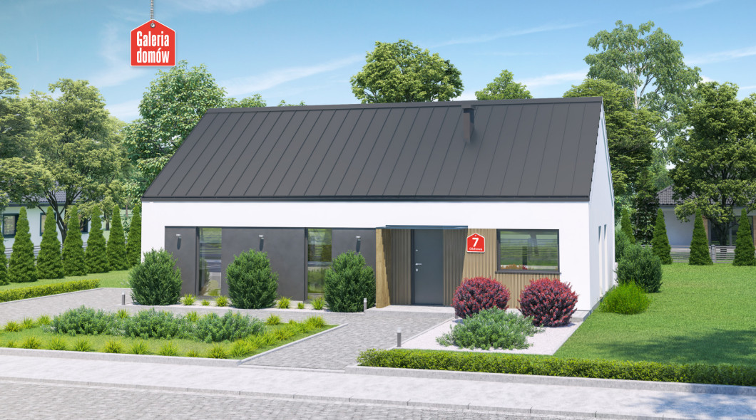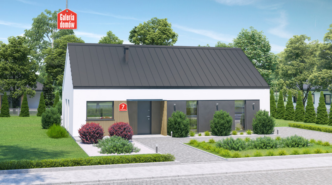 Gotowy projekt Dom przy Olchowej 7 to dom parterowy o powierzchni 95 m². Prosta bryła, symetryczny dach dwuspadowy, kalenica równoległa do drogi. Wnętrze mieści 4 pokoje, otwartą kuchnię, łazienkę, toaletę i kotłownię połączoną z pralnią. Dom utrzymany w stylistyce nowoczesnej stodoły, minimalistycznie wykończony w oparciu o kontrast bieli i czerni. Olchowa 7 spełnia aktualne normy WT 2021, a jej konstrukcje zostały opracowane zgodnie ze standardami Eurokod. Dom przy Olchowej 7 można w przystępny sposób dostosować do planowanych założeń dotyczących zeroemisyjności budynków. Budynek został zaprojektowany w technologii tradycyjnej, murowanej. Prosty w budowie i ekonomiczny w użytkowaniu projekt, który z powodzeniem zapewni odpowiednio dużo miejsca 4-5 osobowej rodzinie ceniącej komfort i otwartość parterowego domu.