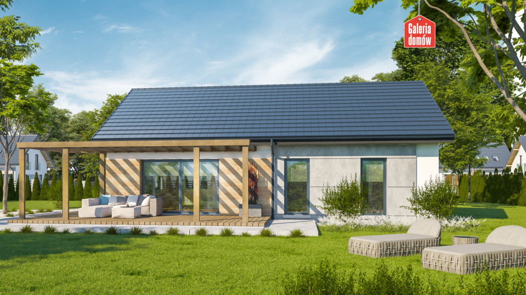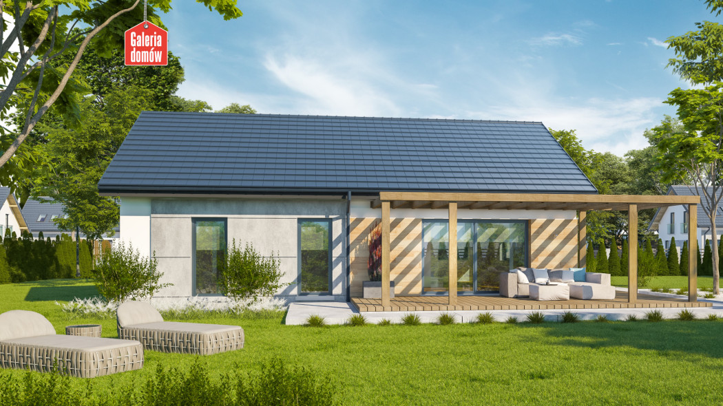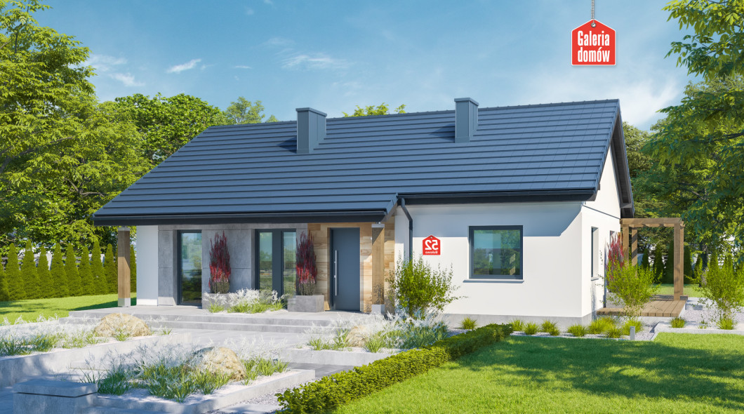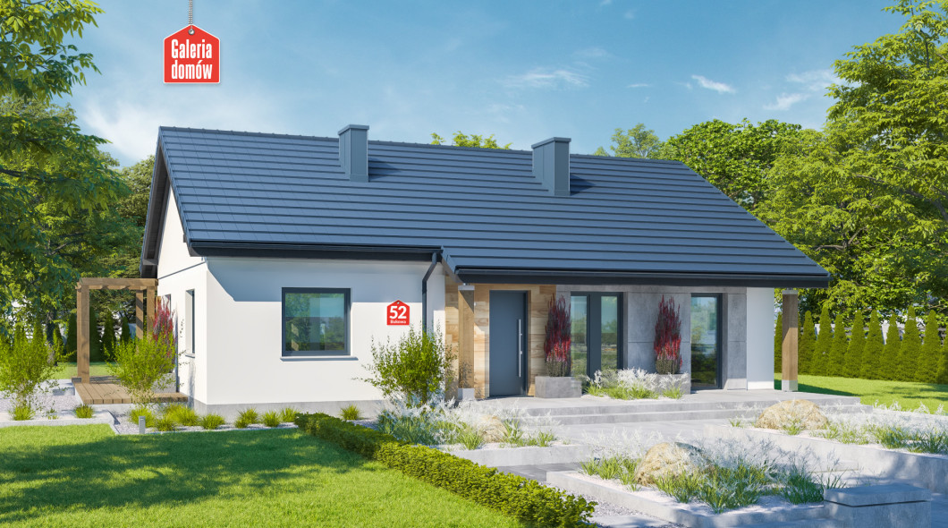Dom przy Bukowej 52 to projekt domu jednorodzinnego o niewielkich rozmiarach i prostej konstrukcji. Parterowy dom o powierzchni użytkowej 95m². Dach o kalenicy równoległej do drogi, symetryczny, dwuspadowy o kącie nachylenia 30 stopni. Ogrzewanie podłogowe pompą ciepła lub kotłem gazowym.