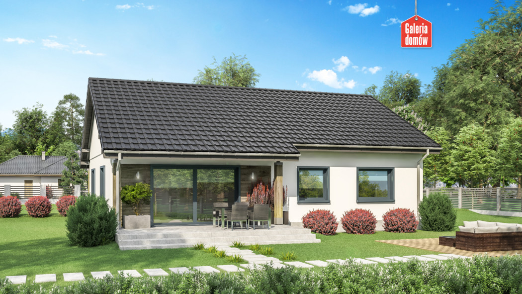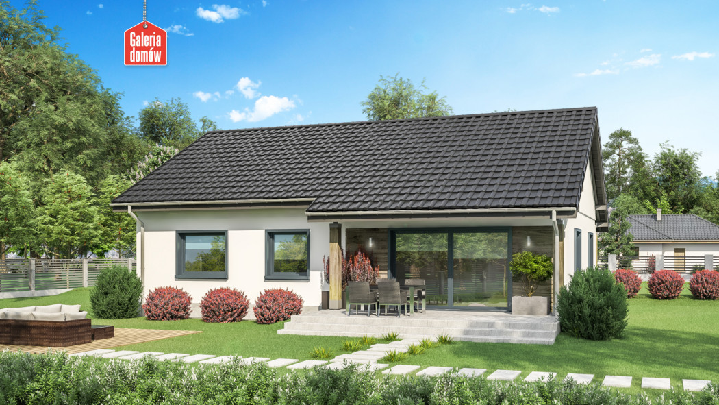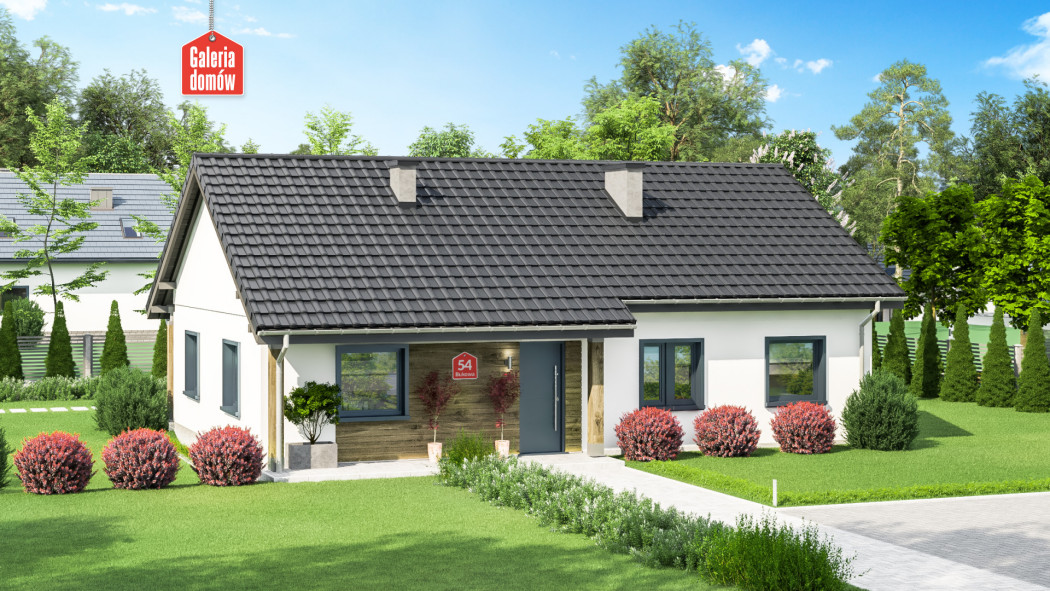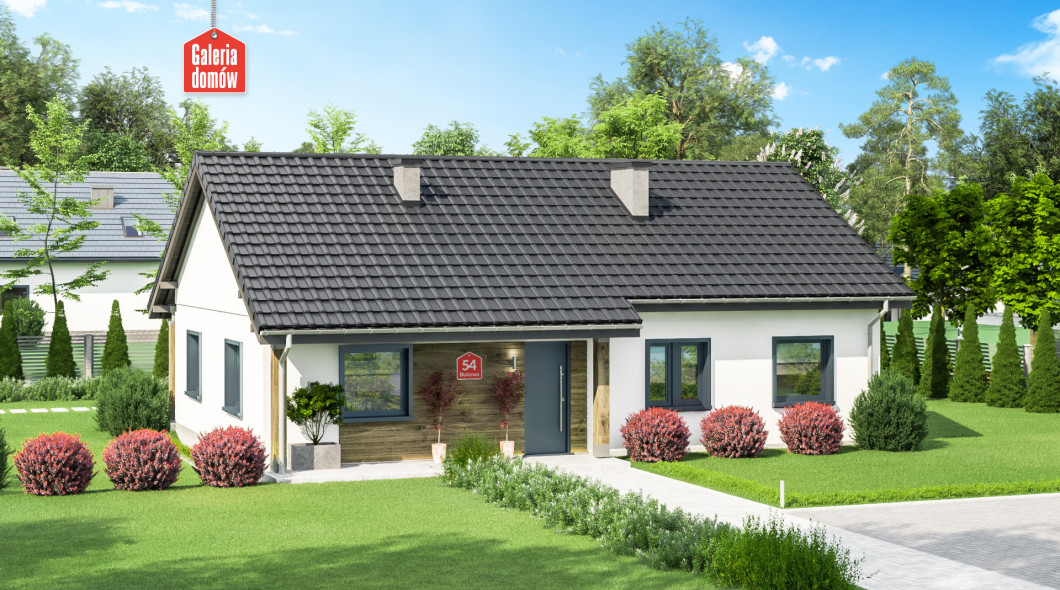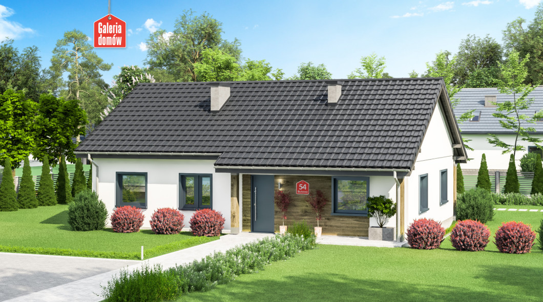 Dom przy Bukowej 54 to budynek parterowy o powierzchni użytkowej 95 m². Szybki i tani w budowie, ekonomiczny w użytkowaniu. Doskonałe rozwiązanie do realizacji niewielkich działkach. Wnętrze mieści 3 sypialnie, otwartą kuchnię, salon, 2 łazienki, oraz kotłownię z miejscem na pralnię. Wykończenie zewnętrzne zostało utrzymane w nowoczesnej stylistyce, przy użyciu wysokiej jakości materiałów. Bukowa 54 została opracowana w sposób umożliwiający dostosowanie do przyszłych wymagań dotyczących budynków zeroemisyjnych. Dom przy Bukowej 45 zawiera dodatkowe projekty wentylacji mechanicznej z rekuperacją oraz instalację solarną i fotowoltaiczną. Ekonomiczny w realizacji i tani w utrzymaniu projekt domu dla 4-5 osobowej rodziny.