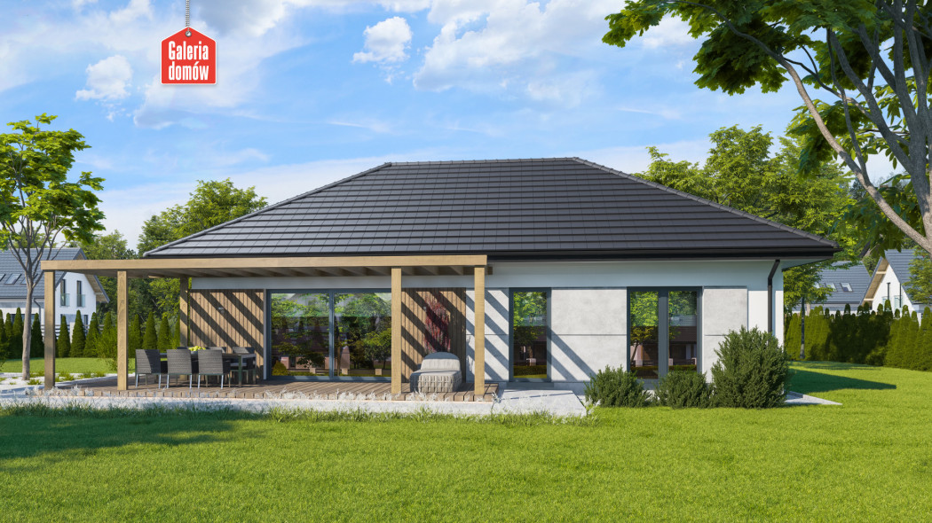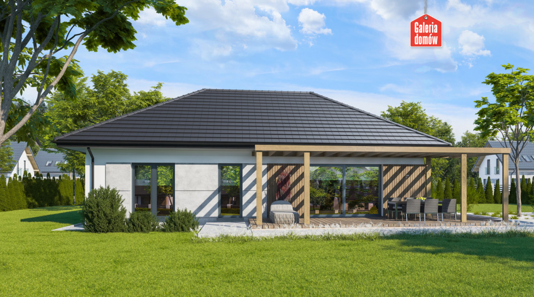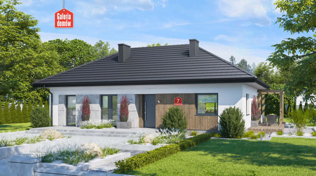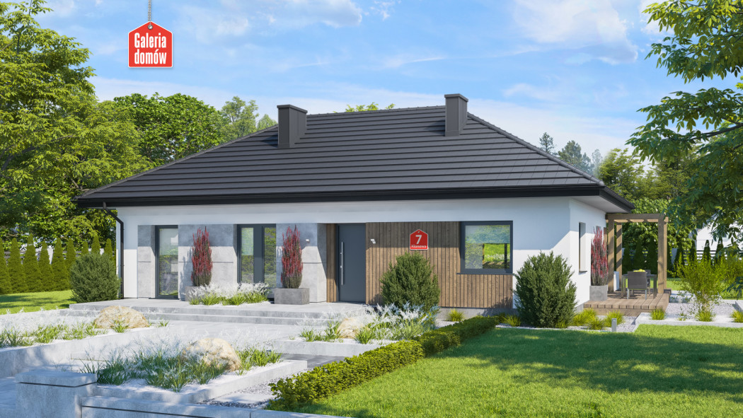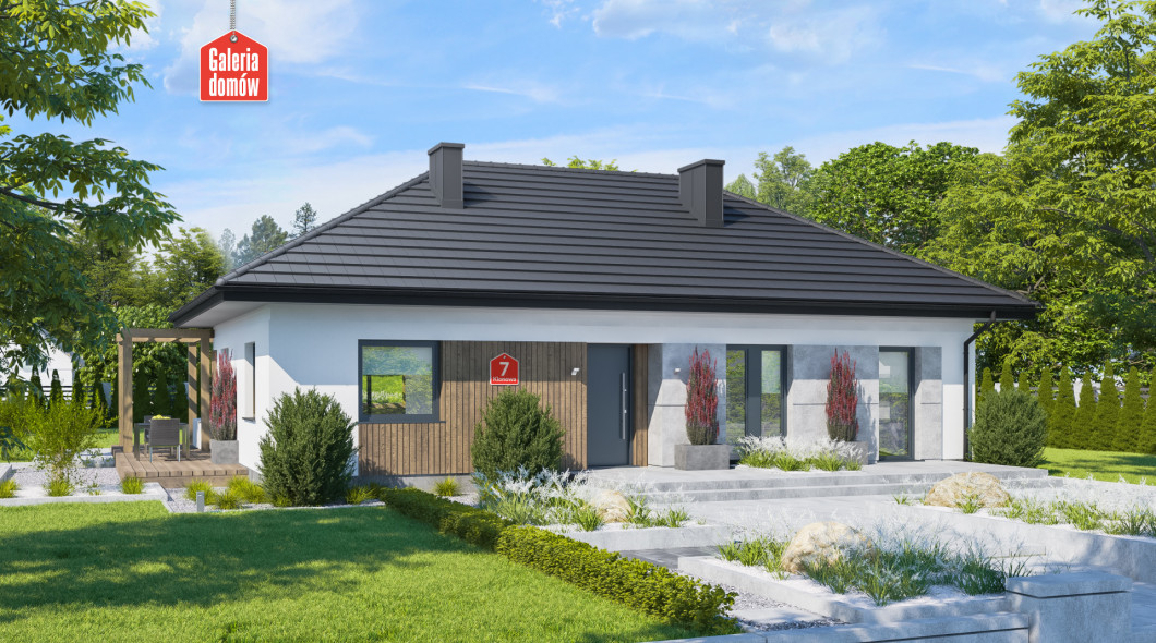 Dom przy Klonowej 7 to gotowy projekt parterowego domu z symetrycznym dachem czterospadowym. Budynek został zaprojektowany w technologii tradycyjnej, murowanej i dostosowany do warunków technicznych WT 2021. Powierzchnia użytkowa 100 m² mieści ciekawy układ funkcjonalny. Wnętrze mieści otwartą część dzienną, w skład której wchodzi salon i kuchnia. Klonowa 7 oferuje ponadto 3 sypialnie, kotłownię z miejscem na pralkę, oraz dwie łazienki. W projekcie zastosowano ogrzewanie podłogowe zasilane pompą ciepła lub kotłem gazowym. Projekt został opracowany w sposób umożliwiający dostosowanie do przyszłych wymagań dotyczących budynków zeroemisyjnych. Posiada wentylacje mechaniczną z rekuperacją oraz instalacje solarną i fotowoltaiczną. Elewacja budynku została wzbogacona o naturalne dodatki drewniane i jest utrzymana w nowoczesnej stylistyce. Dom przy Klonowej 7, dzięki przemyślanej konstrukcji, jest ekonomiczny i prosty w budowie oraz tani w użytkowaniu. To projekt, który z powodzeniem zaspokoi potrzeby mieszkaniowe 4-5 osobowej rodziny, ceniącej komfort parterowego domu.