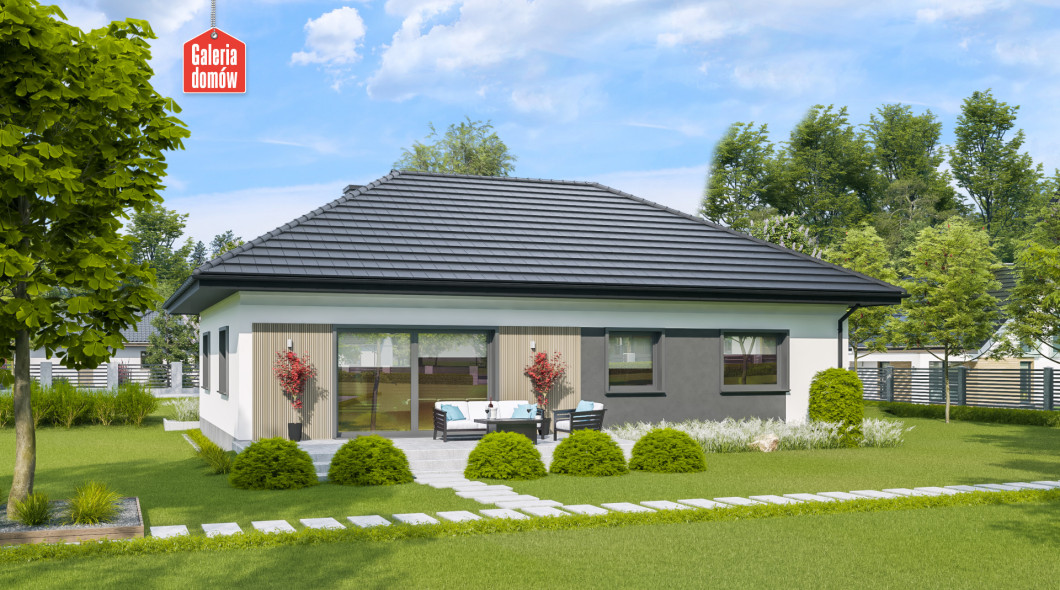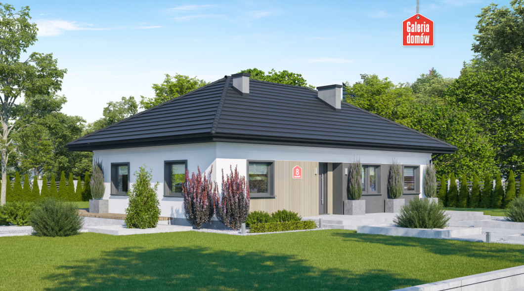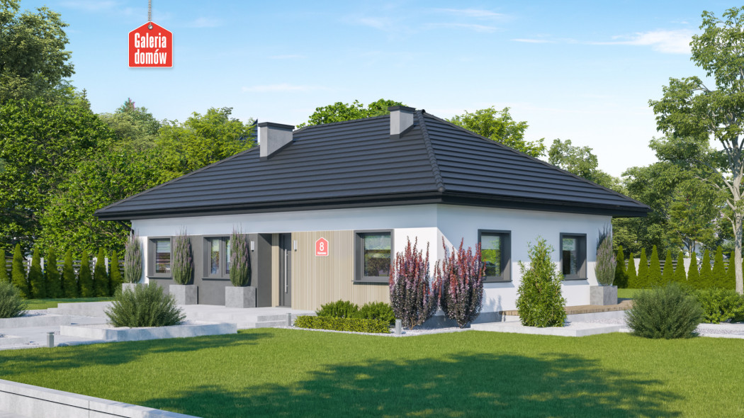 Dom przy Klonowej 8 to budynek parterowy, jednorodzinny, bez garażu. Dach dwuspadowy, symetryczny, o kalenicy równoległej do drogi. Projekt domu opracowany zgodnie z warunkami technicznymi WT 2021 oraz normami konstrukcyjnymi eurokod. Technologia murowana, więźba tradycyjna drewniana. W projekcie zastosowano ogrzewanie podłogowe pompą ciepła lub gazem oraz projekty energooszczędnych instalacji solarnych, fotowoltaicznych i wentylacji mechanicznej z rekuperacją.