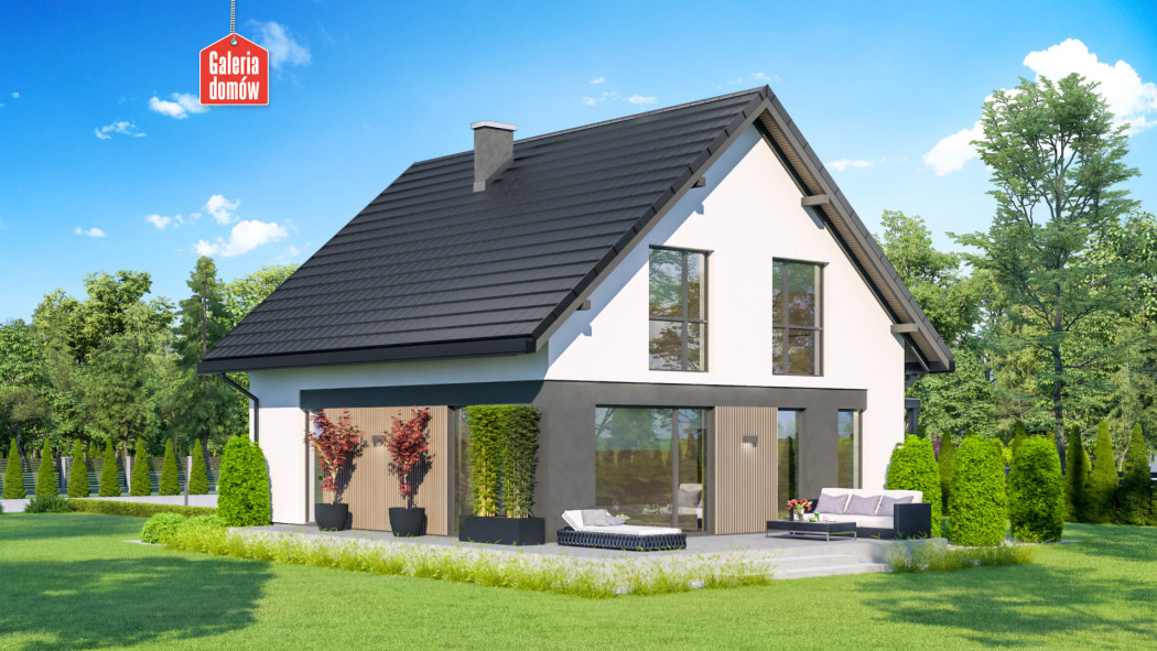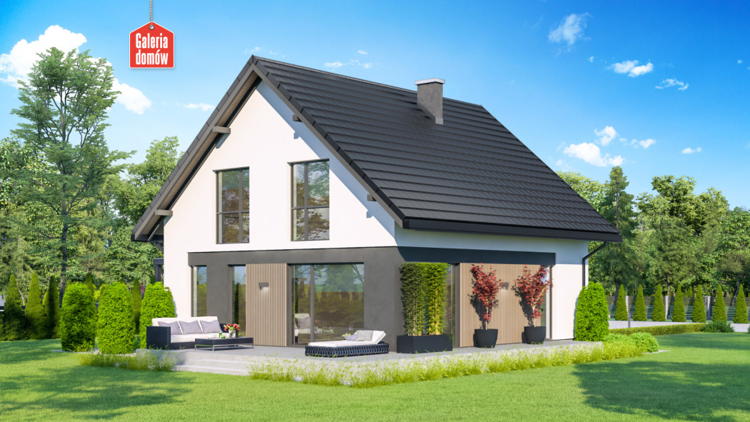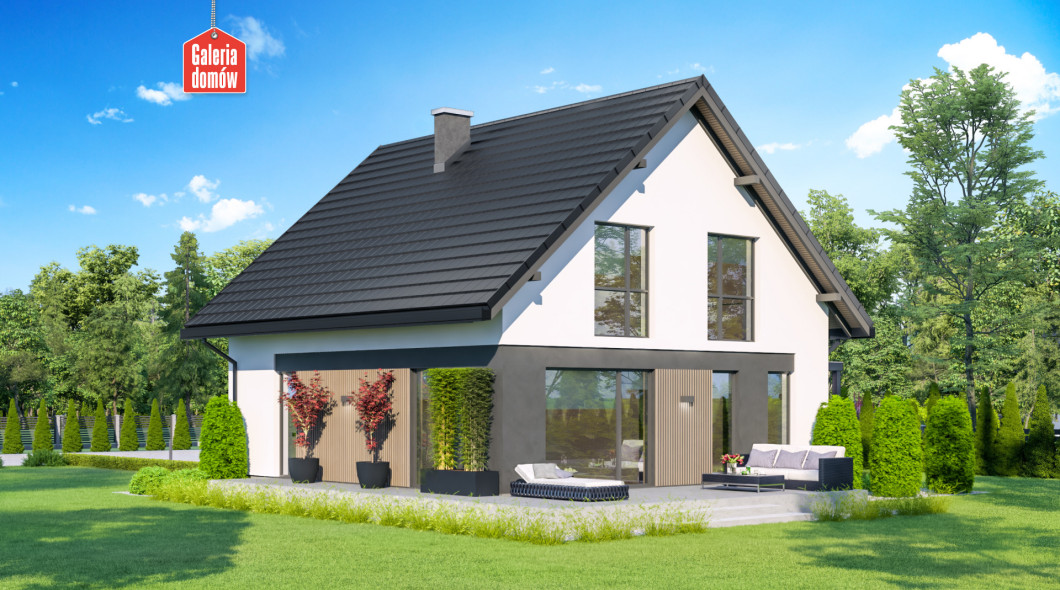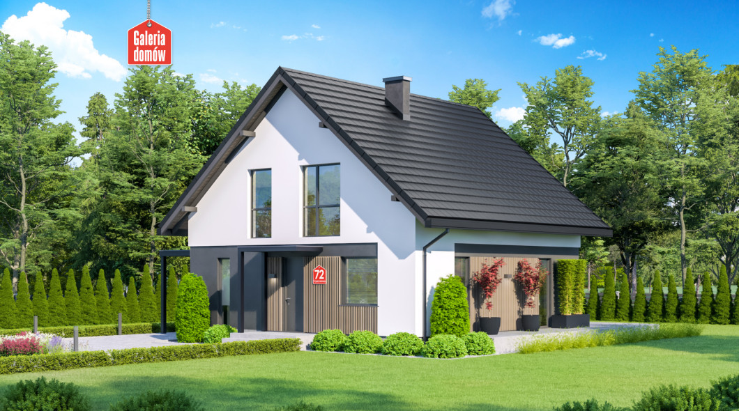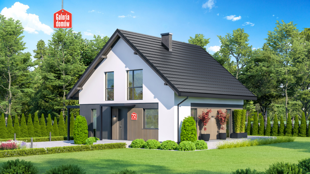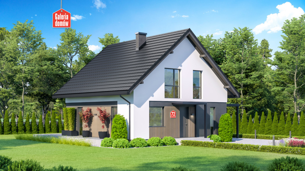 Dom przy Cyprysowej 72 to projekt nowoczesnego domu z poddaszem, o prostej bryle przykrytej dwuspadowym dachem, architekturą nawiązujący do modnych trendów współczesnej architektury jednorodzinnej. Dom z wiatą garażową zamiast tradycyjnego garażu. Liczne przeszklenia, stalowa kolorystyka stolarki, drewniana okładzina dekoracyjna i biała elewacja podkreślają oryginalny charakter domu. Komfort użytkowania zapewnia funkcjonalny podział wnętrza na strefę dzienną i nocną. Na parterze Cyprysowej 72 znajduje się słoneczny salon, z którego przesuwnymi drzwiami można wyjść na taras, duża kuchnia, łazienka i dodatkowy pokój. Na poddaszu zaprojektowano trzy przytulne sypialnie oraz główną łazienkę. Budynek o prostej konstrukcji i niskich kosztach realizacji. Dom został zaprojektowany z myślą o warunkach, jakie powinny w przyszłości spełniać projekty domów zeroemisyjnych.