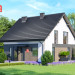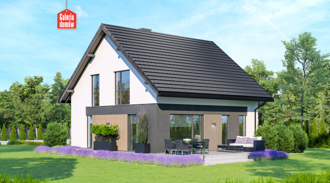 Gotowy projekt domu parterowego z poddaszem użytkowym i wiatą garażową o powierzchni 120 m². Parter, w części dziennej, tworzą; jasny salon oraz otwarta kuchnia. Poręcznym rozwiązaniem jest spiżarka wkomponowana w plan kuchni. Pozostałe elementy parteru to dodatkowy pokój, łazienka, pralnia zlokalizowana pod schodami i kotłownia.