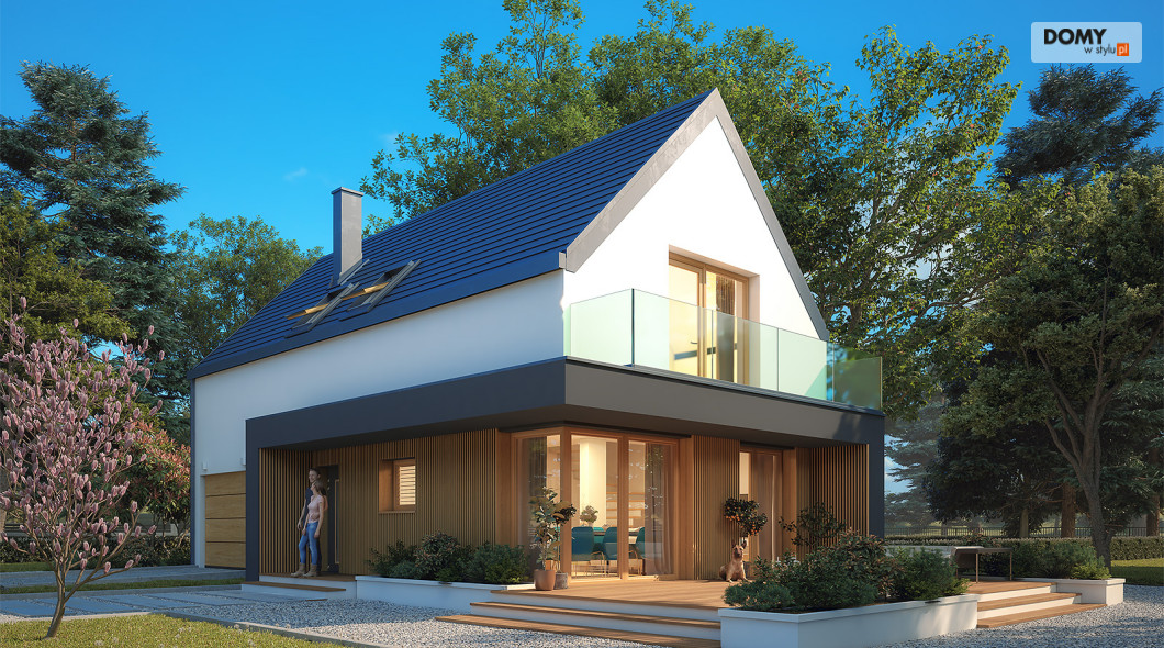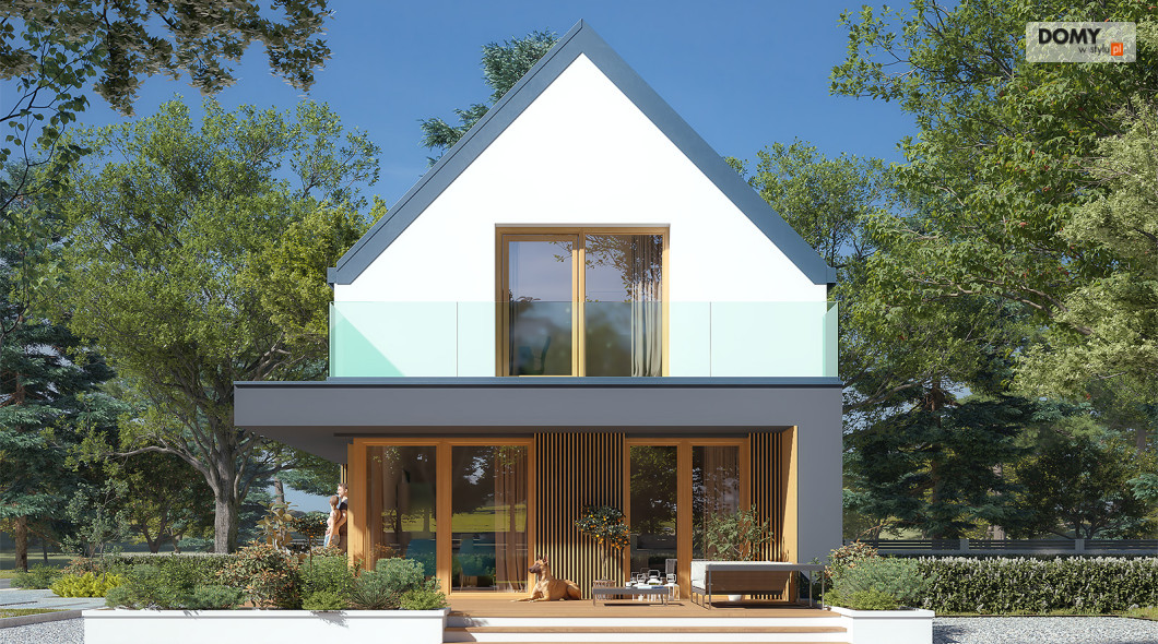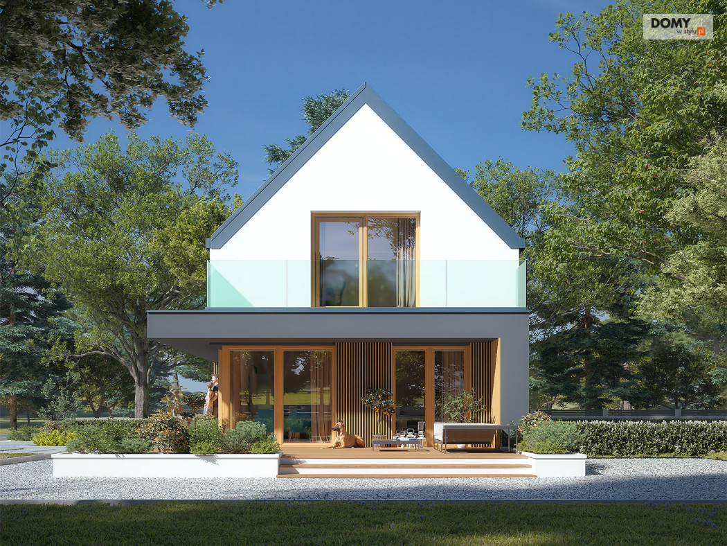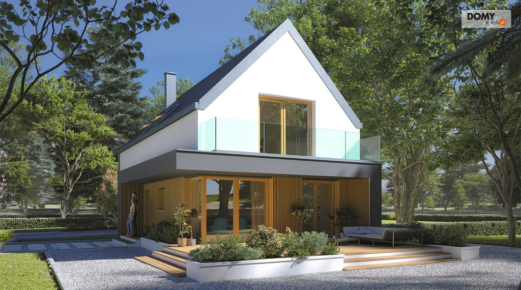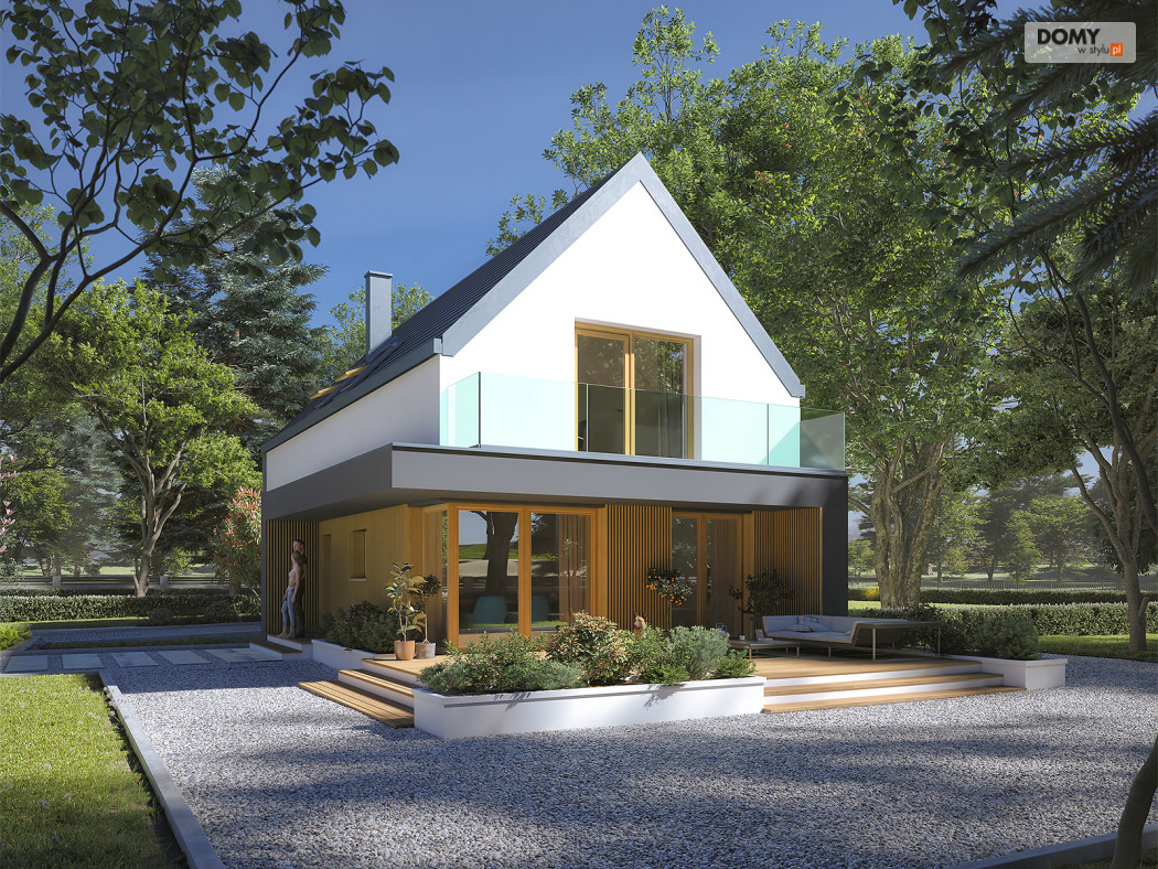 Okruszek to projekt domu z użytkowym poddaszem o powierzchni 111 m2. Dom idealnie wpisuje się w nurt współczesnej architektury. Minimalistyczna forma zainteresuje nie tylko zwolenników stylu tradycyjnego, ale również nowoczesnego. Dom posiada prostą bryłę, bezokapowy dach i liczne przeszklenia. Elewację zdobi drewniana szalówka oraz tynk w kolorze białym i szarym. Całość prezentuje się niezwykle oryginalnie.