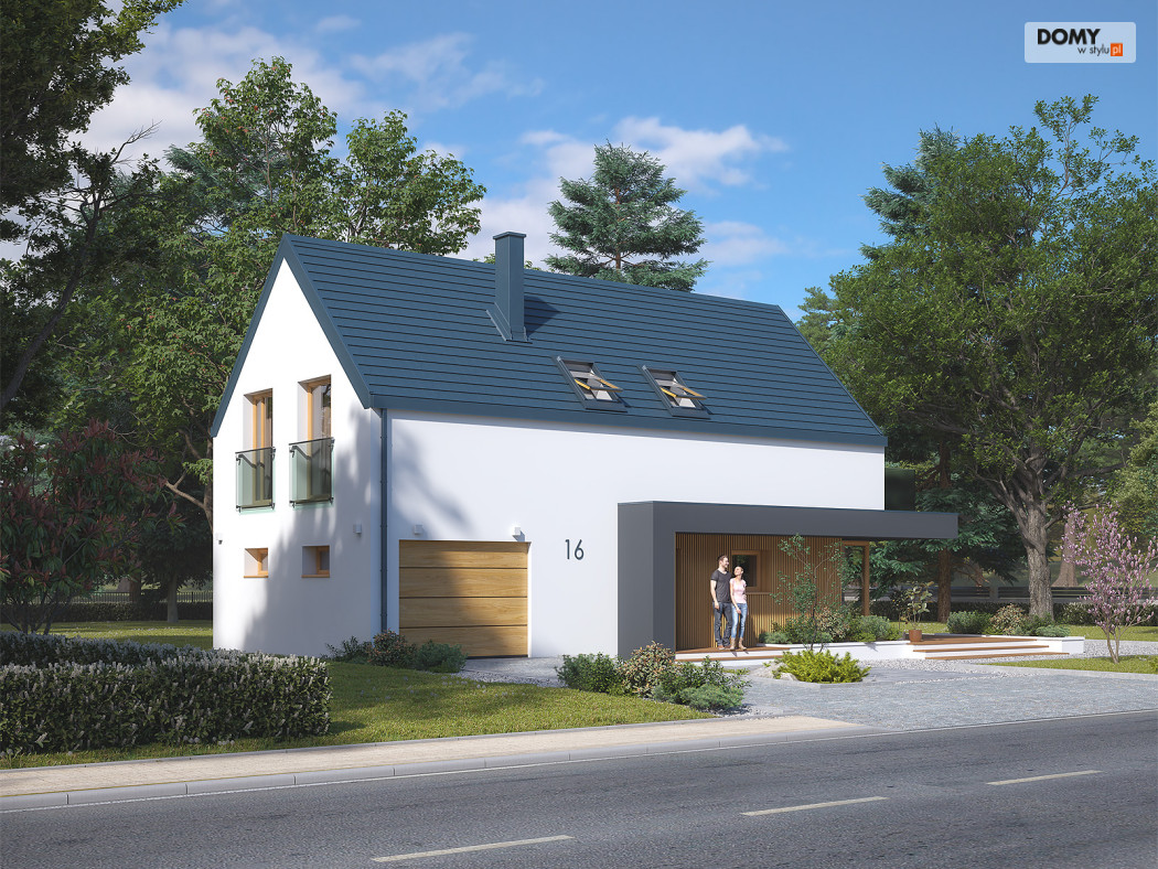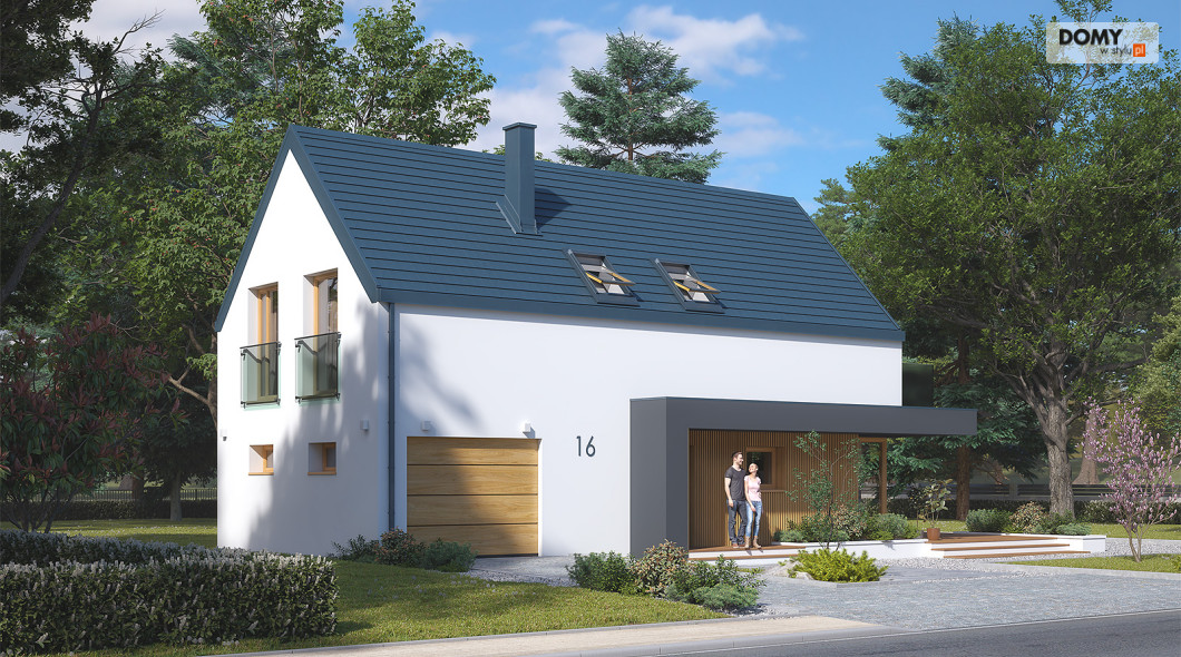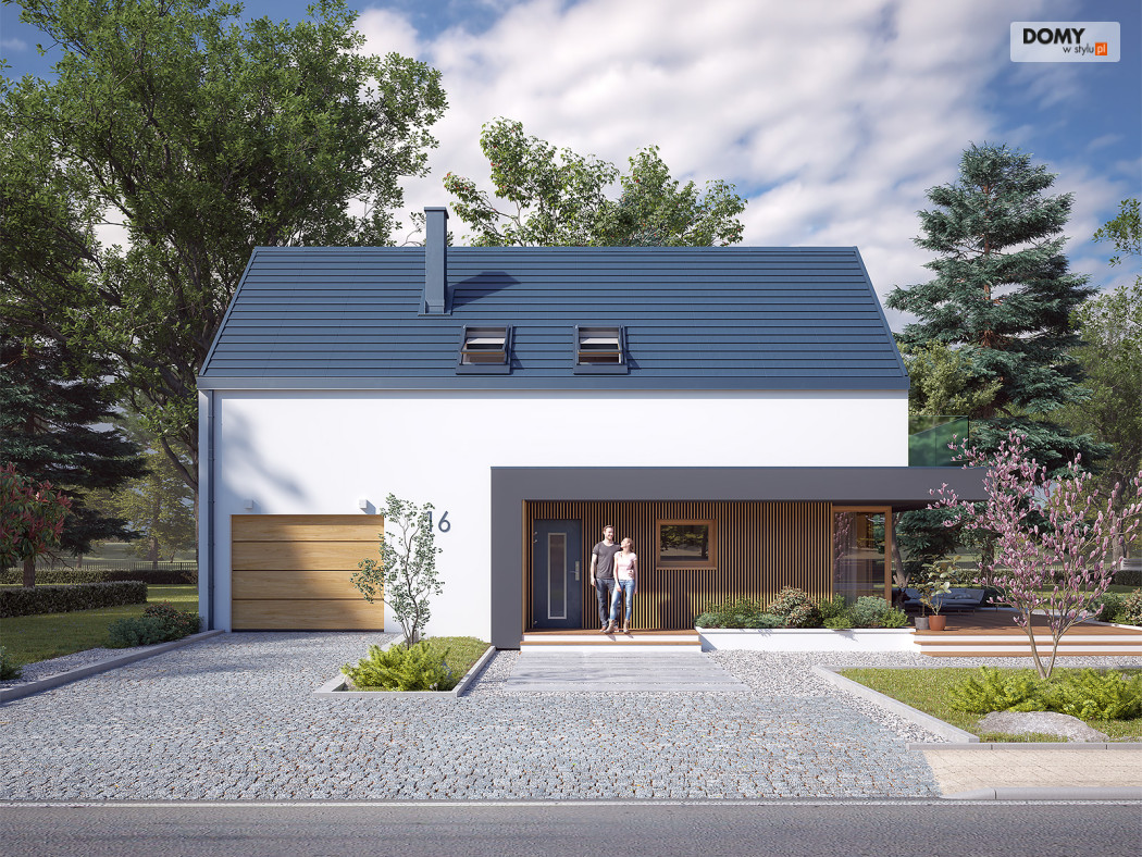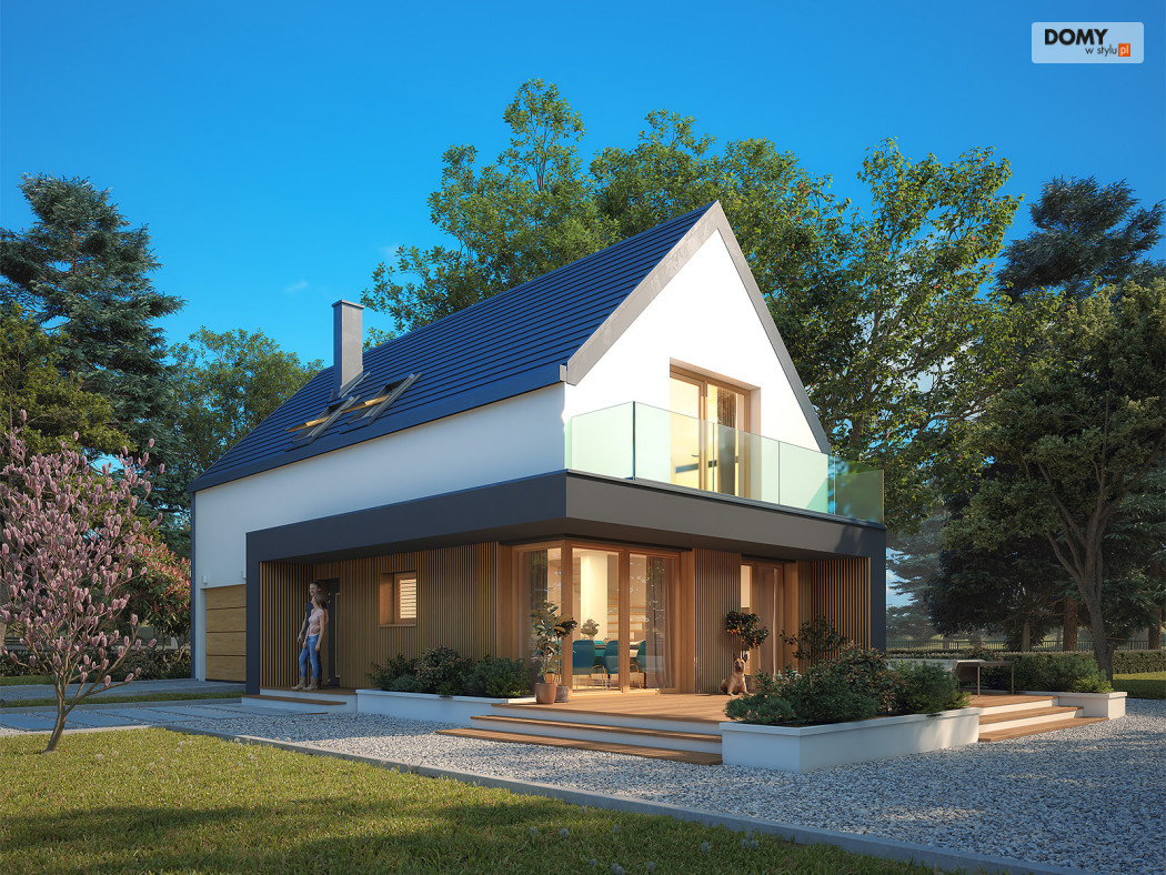 Okruszek to projekt domu z użytkowym poddaszem o powierzchni 111 m2. Dom idealnie wpisuje się w nurt współczesnej architektury. Minimalistyczna forma zainteresuje nie tylko zwolenników stylu tradycyjnego, ale również nowoczesnego. Dom posiada prostą bryłę, bezokapowy dach i liczne przeszklenia. Elewację zdobi drewniana szalówka oraz tynk w kolorze białym i szarym. Całość prezentuje się niezwykle oryginalnie.