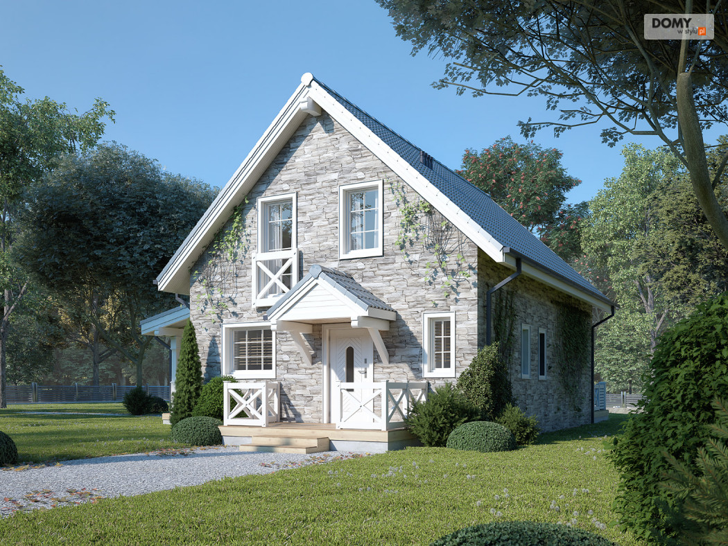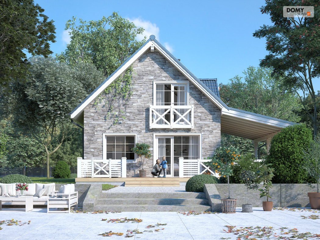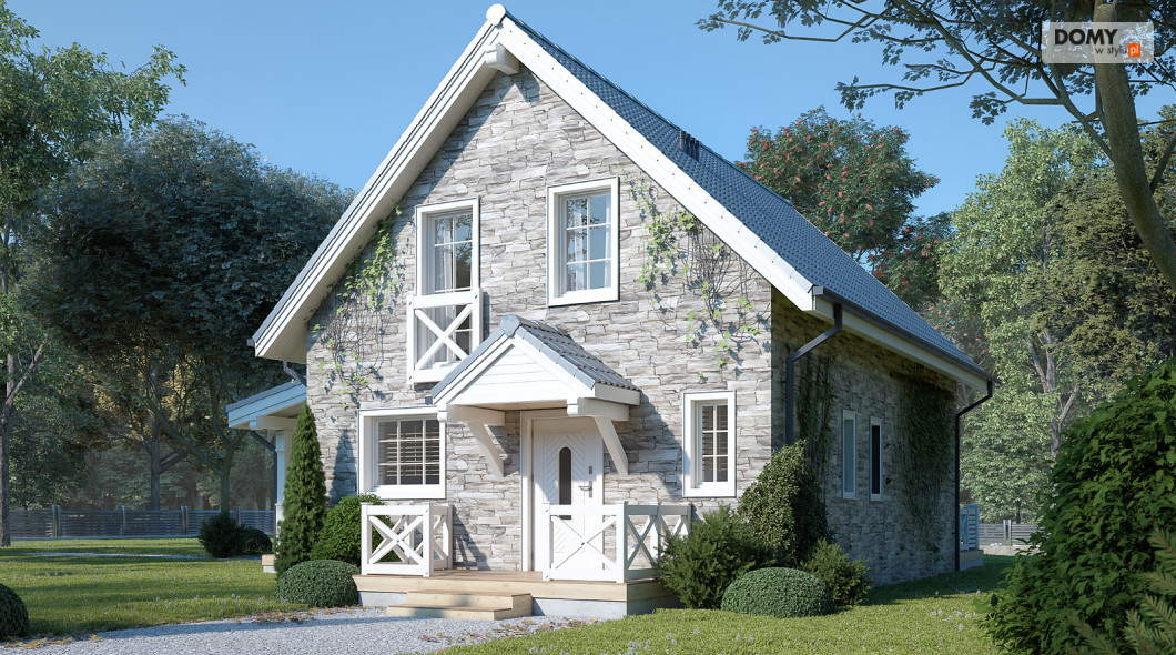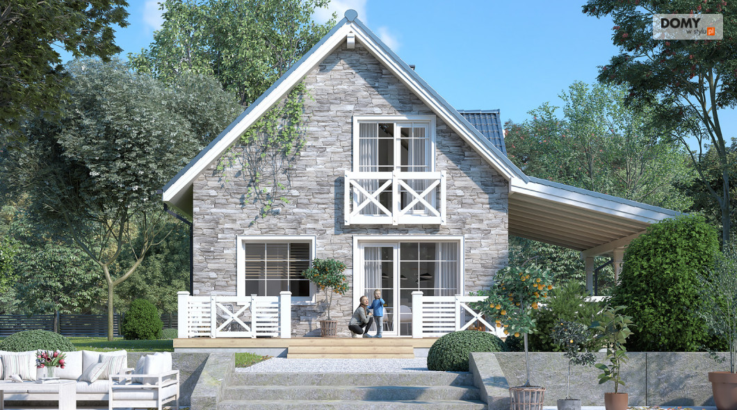 Aksamitka 3 to projekt domu z użytkowym poddaszem o powierzchni ok 112 m2. Prosta bryła została przykryta dwuspadowym dachem i wykończona w oryginalny sposób.