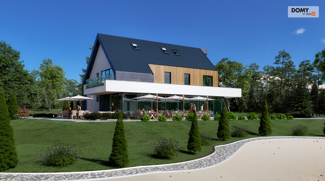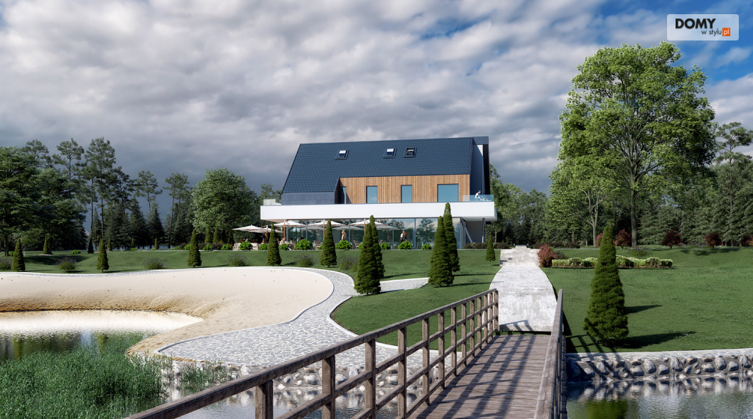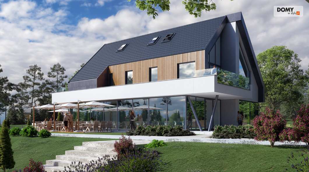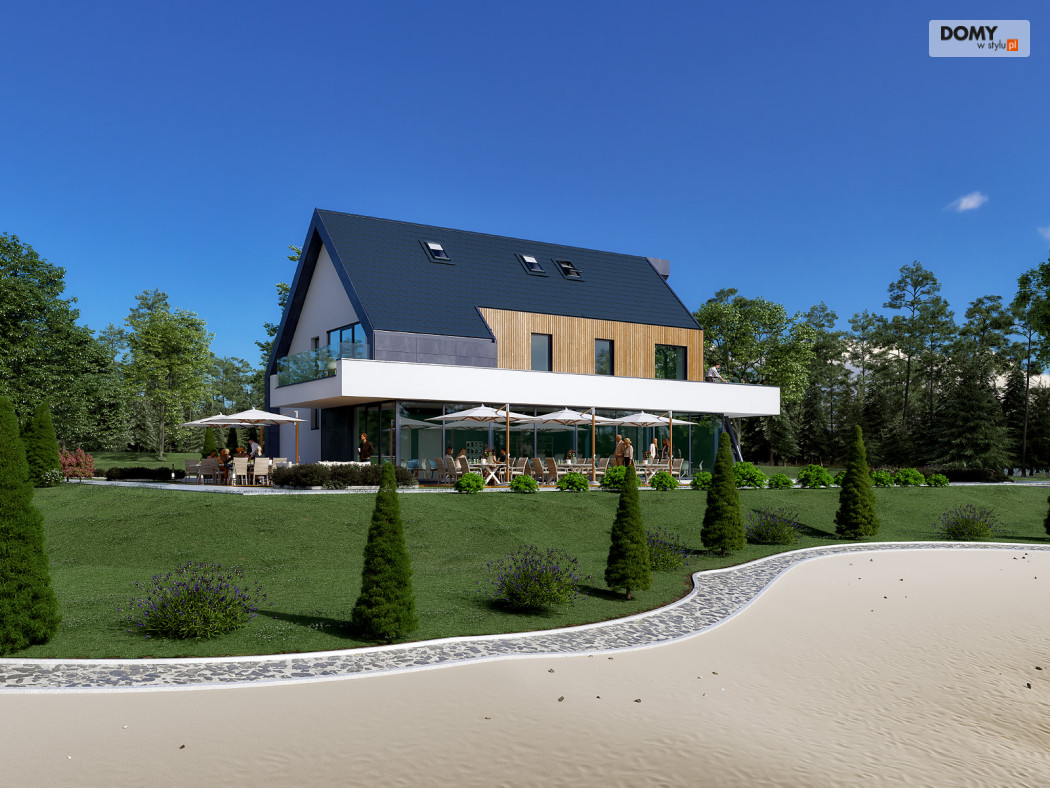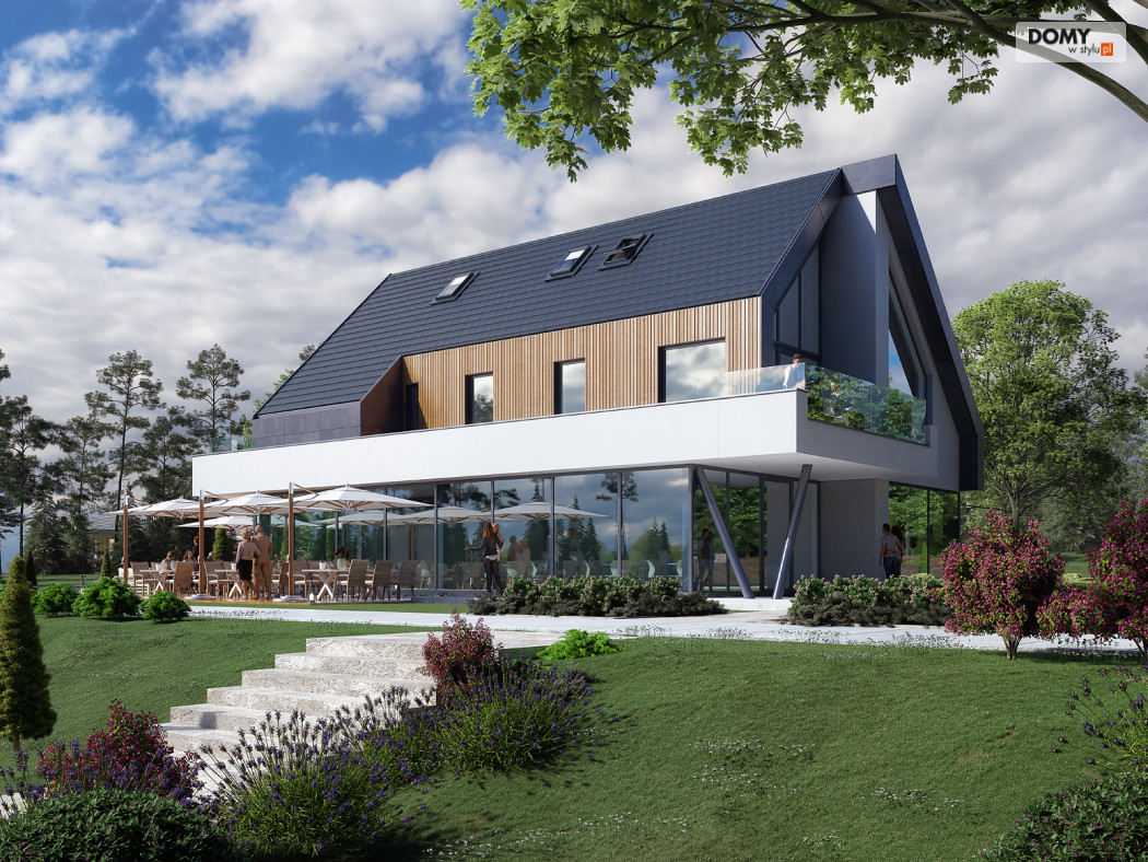 Kawiarnia to budynek usługowy z dwoma mieszkaniami. Projekt utrzymano w nowoczesnym stylu. Elewację zdobią drewniana szalówka, płyty elewacyjne oraz szklane balustrady. Parter budynku to część usługowa z zapleczem sanitarnym. Na poddaszu zaprojektowano dwa mieszania.