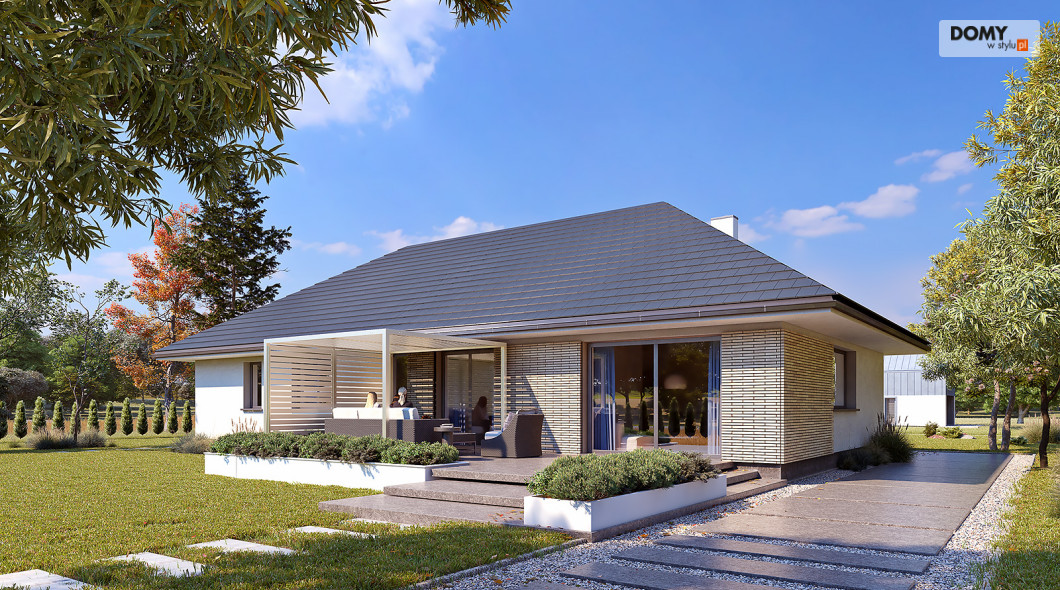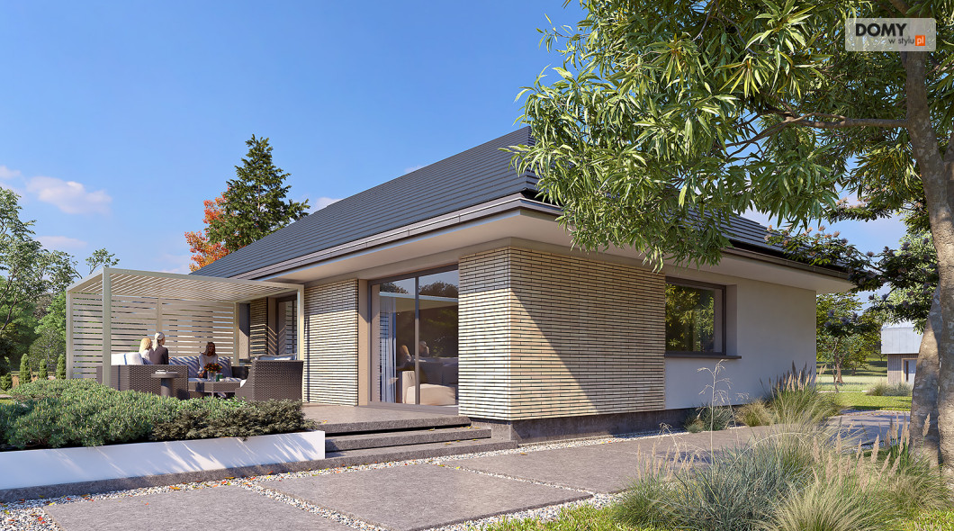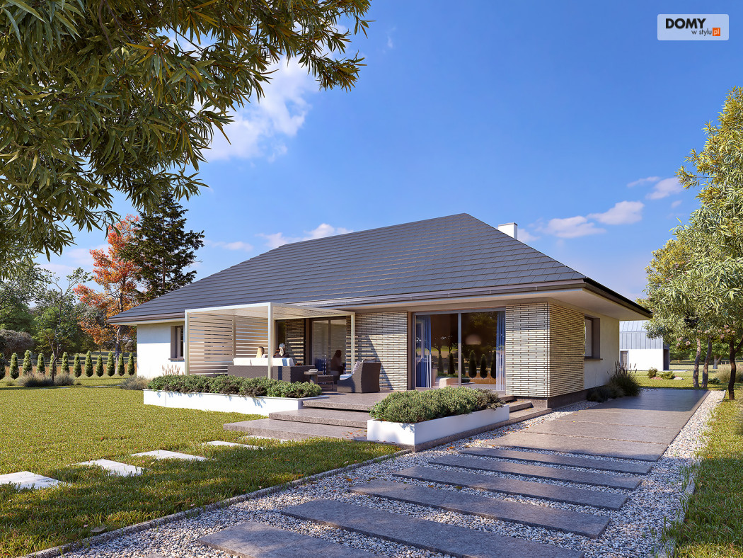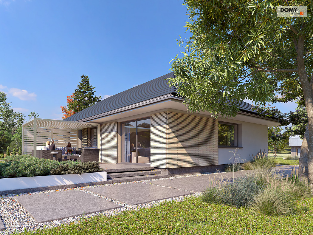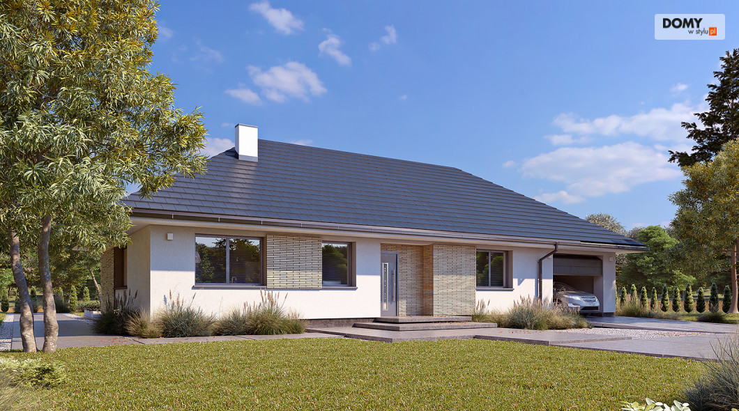 GWIAZDKA 6 to projekt domu parterowego o 114m2 powierzchni. Przykryty został dachem czterospadowym wykończonym ciemną dachówką ceramiczną. Elewacja składa się z dużych przeszkleń, białego tynku oraz jasnych płytek klinkierowych. Całość budynku charakteryzuje elegancki, minimalistyczny oraz nowoczesny styl. Pokoje zostały rozplanowane po obu stronach komunikacji. Salon połączono z kuchnią i jadalnią, oraz zapewniono wyjście na taras. Oprócz trzech sypialni i łazienki z wanną oraz prysznicem zaprojektowano również WC, kotłownie i garaż jednostanowiskowy.