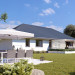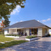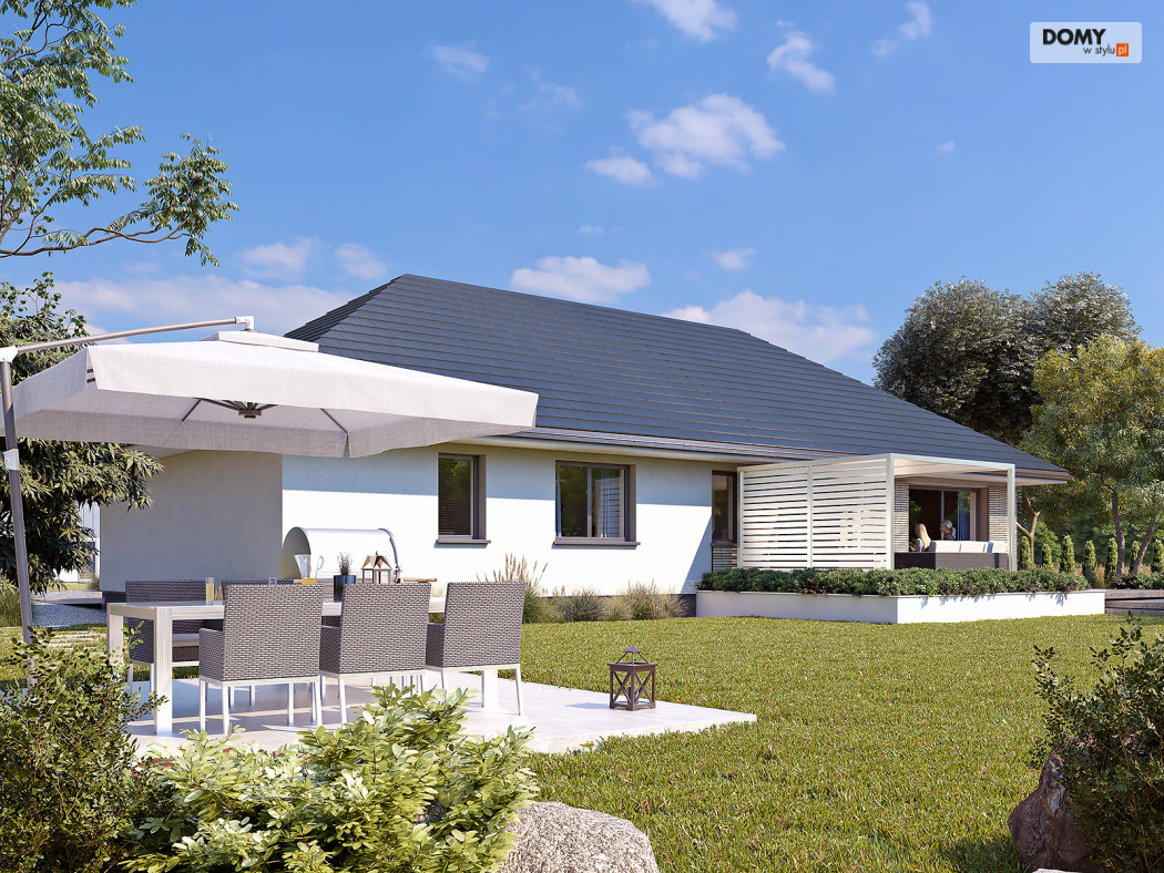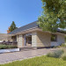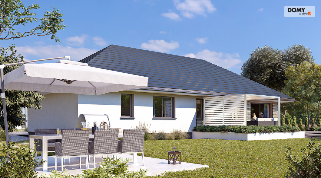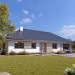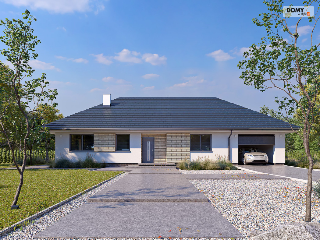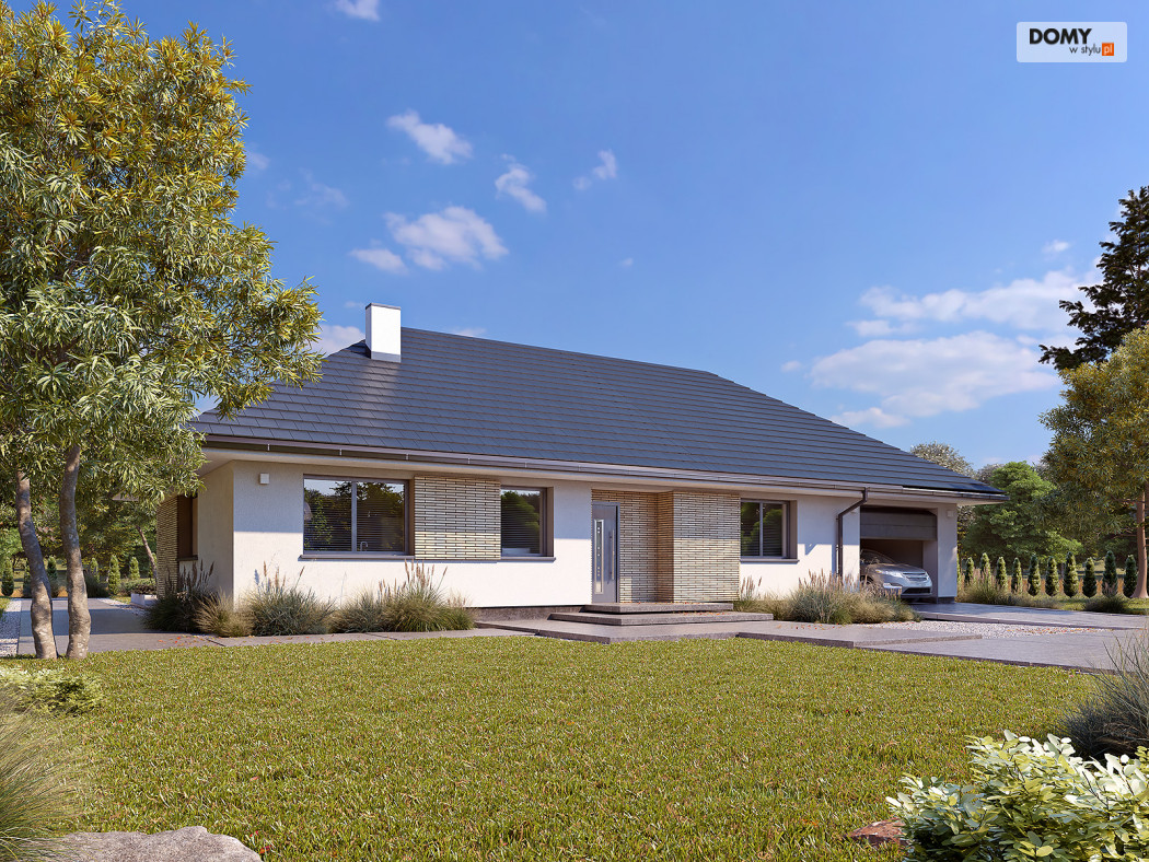 GWIAZDKA 6 to projekt domu parterowego o 114m2 powierzchni. Przykryty został dachem czterospadowym wykończonym ciemną dachówką ceramiczną. Elewacja składa się z dużych przeszkleń, białego tynku oraz jasnych płytek klinkierowych. Całość budynku charakteryzuje elegancki, minimalistyczny oraz nowoczesny styl. Pokoje zostały rozplanowane po obu stronach komunikacji. Salon połączono z kuchnią i jadalnią, oraz zapewniono wyjście na taras. Oprócz trzech sypialni i łazienki z wanną oraz prysznicem zaprojektowano również WC, kotłownie i garaż jednostanowiskowy.