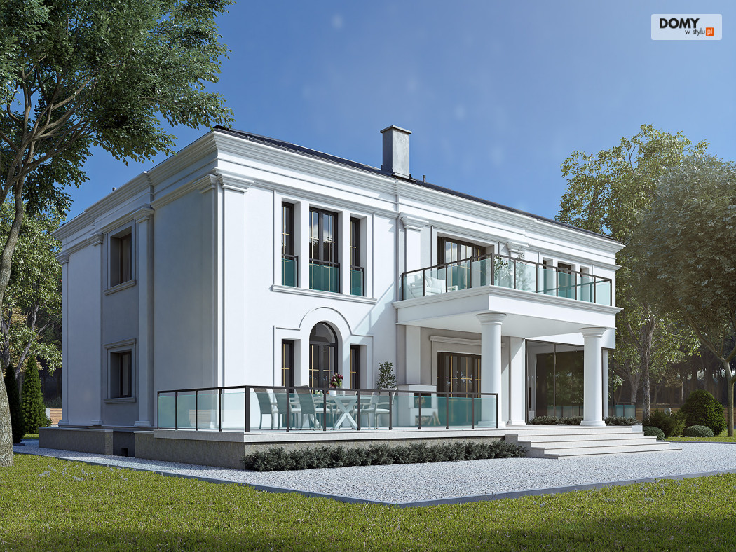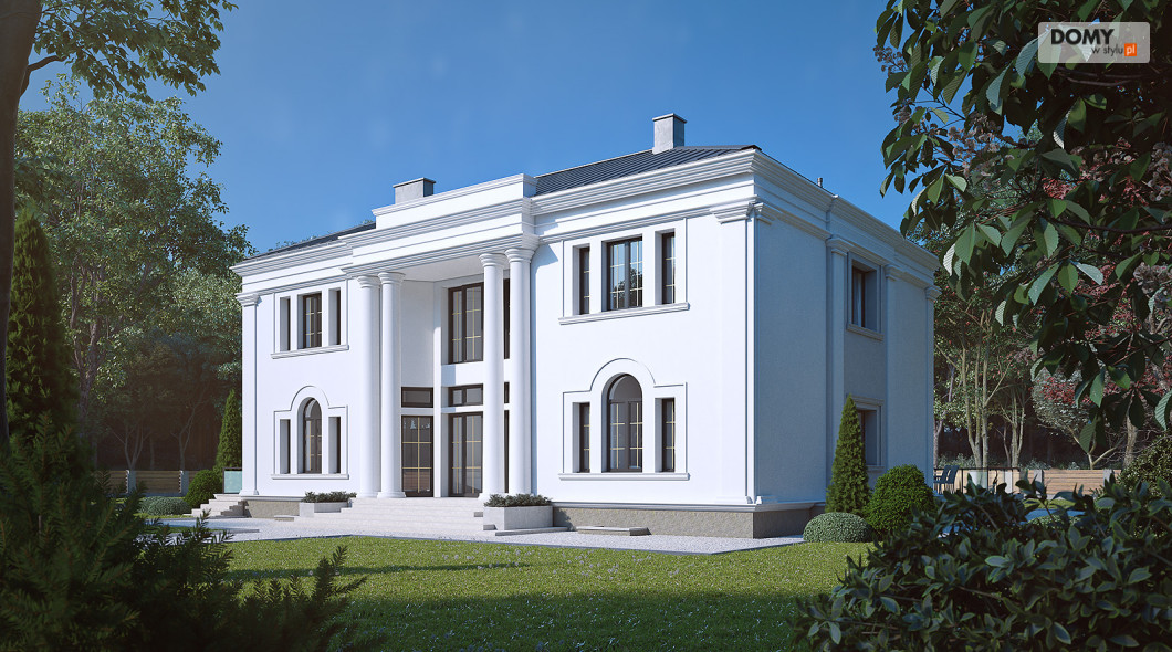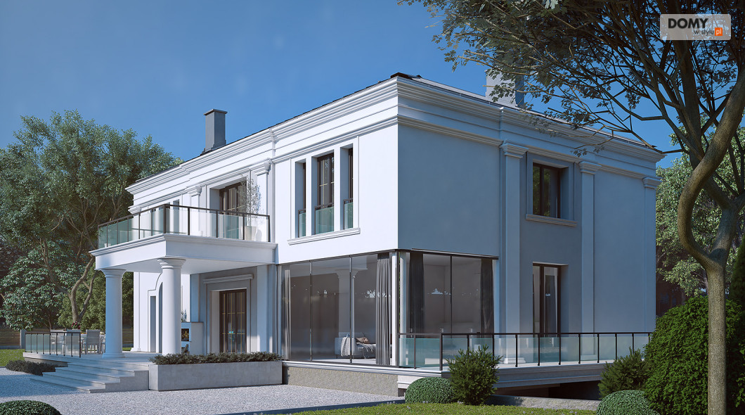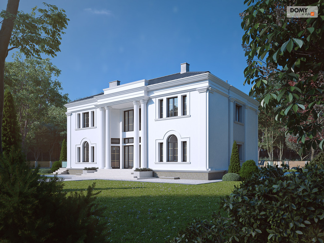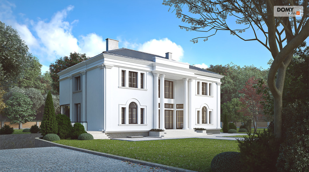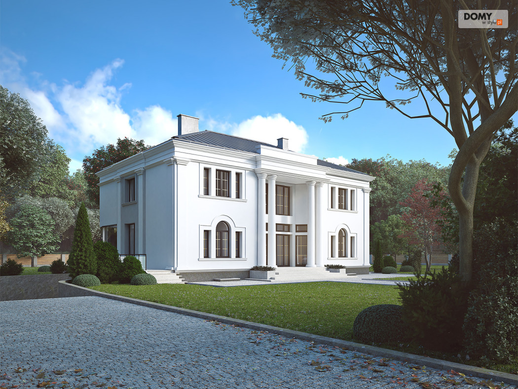 Amadeusz 2 to projekt domu w stylu nowoczesnej rezydencji. Elegancka i prestiżowa elewacja została ozdobiona licznymi gzymsami oraz pilastrami. Garaż umiejscowiono w piwnicy dostępnej za pomocą krętego zjazdu. Parter o otwartym charakterze cechuje się widokiem na taras oraz obszernym oknem narożnym. Kuchnia znajduje się w bardzo bliskiej odległości od kuchni. Na poddaszu zaprojektowano 4 wygodne pokoje, z czego jeden z dużą garderobą. Dodatkowo na tym piętrze znajdują się również w łazienki oraz WC
