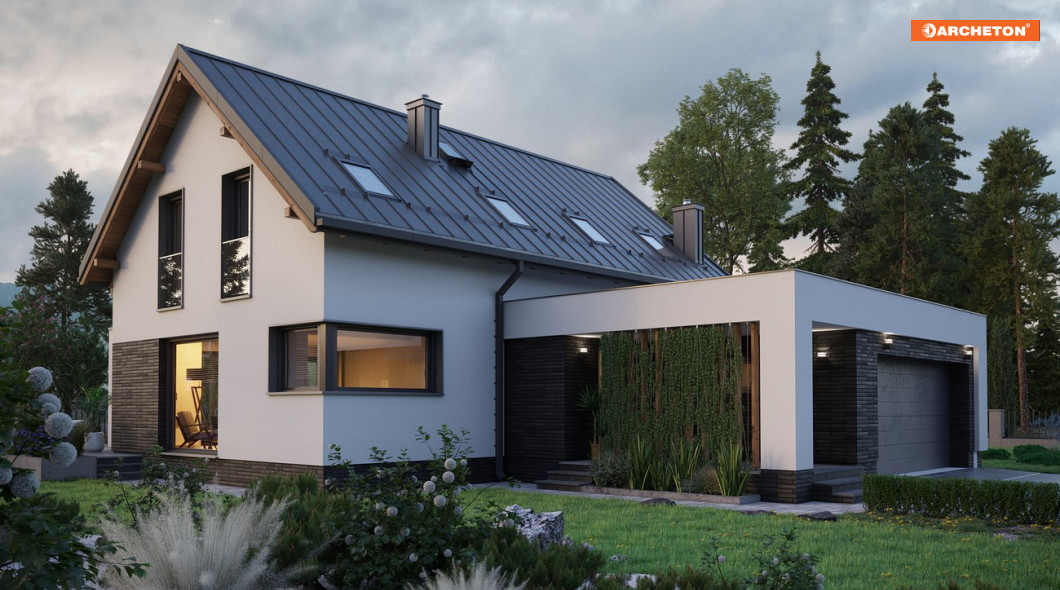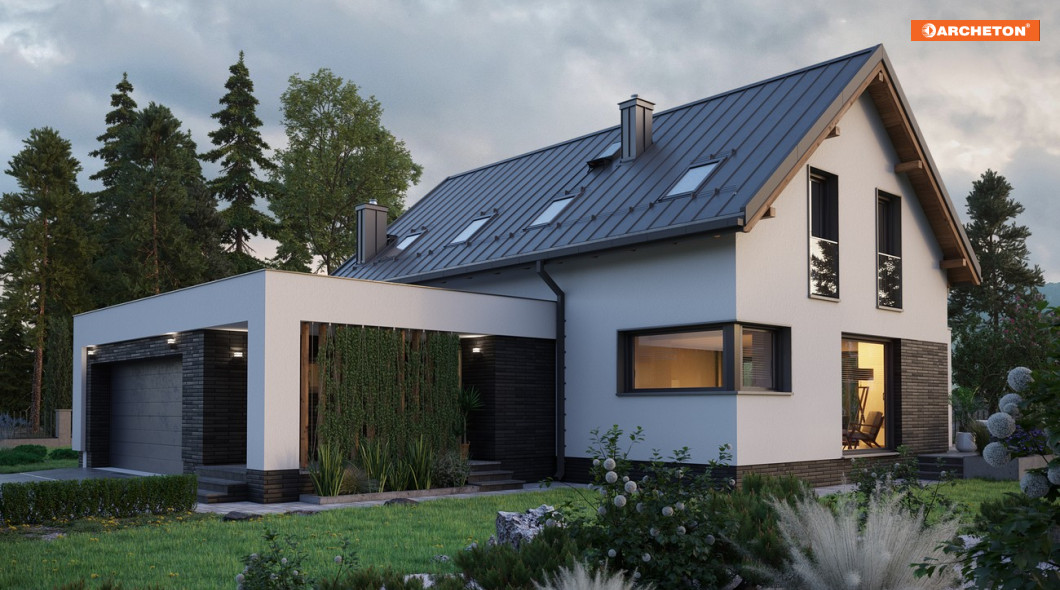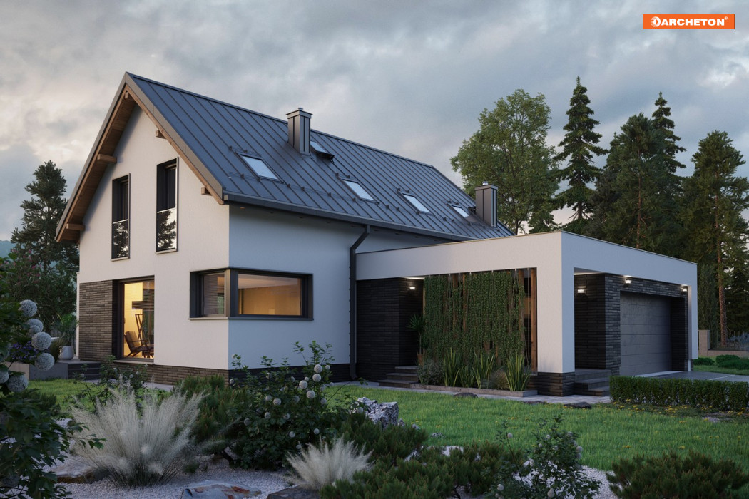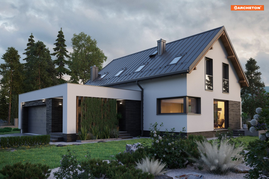 Jednorodzinny dom z poddaszem użytkowym Elza Beta ma 138 m² przestrzeni, która jest dobrze doświetlona dzięki dużym oknom. Dwustanowiskowy garaż jest wysunięty do przodu budynku, a jego zadaszenie przesunięte jest na prawo aż nad wejście główne, dla którego stanowi osłonę. Od strony ogrodu mieszkańcy mają do dyspozycji taras, który jest częściowo osłonięty pionową pergolą – daje to poczucie prywatności oraz chroni przed wiatrem.