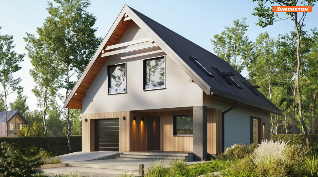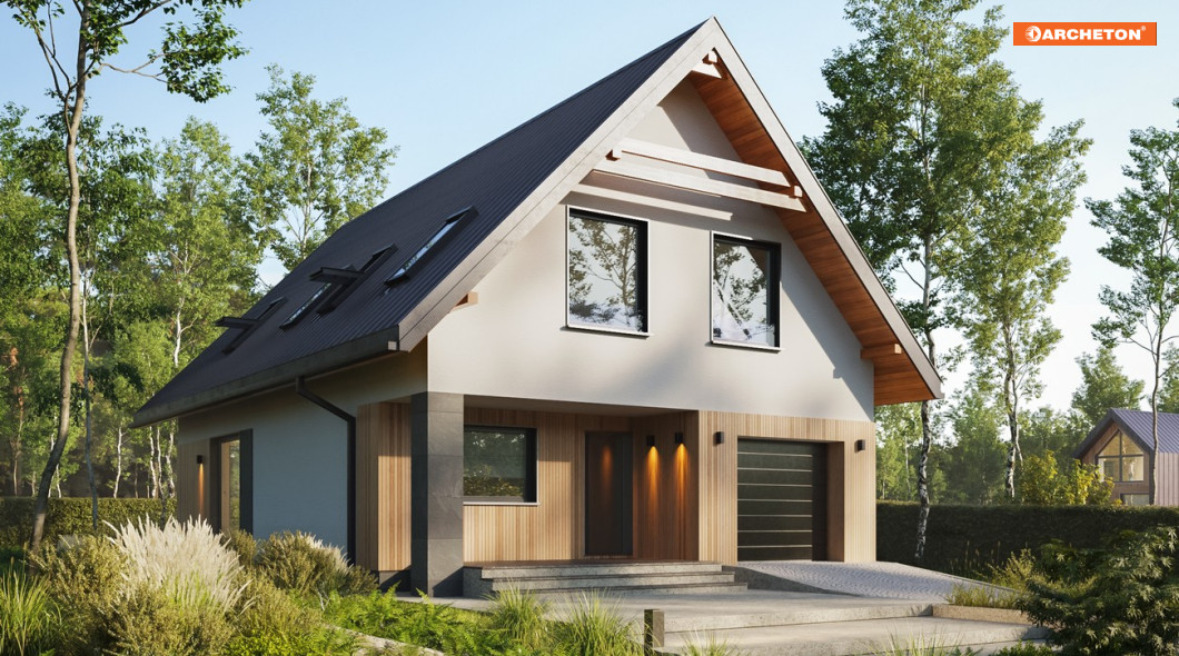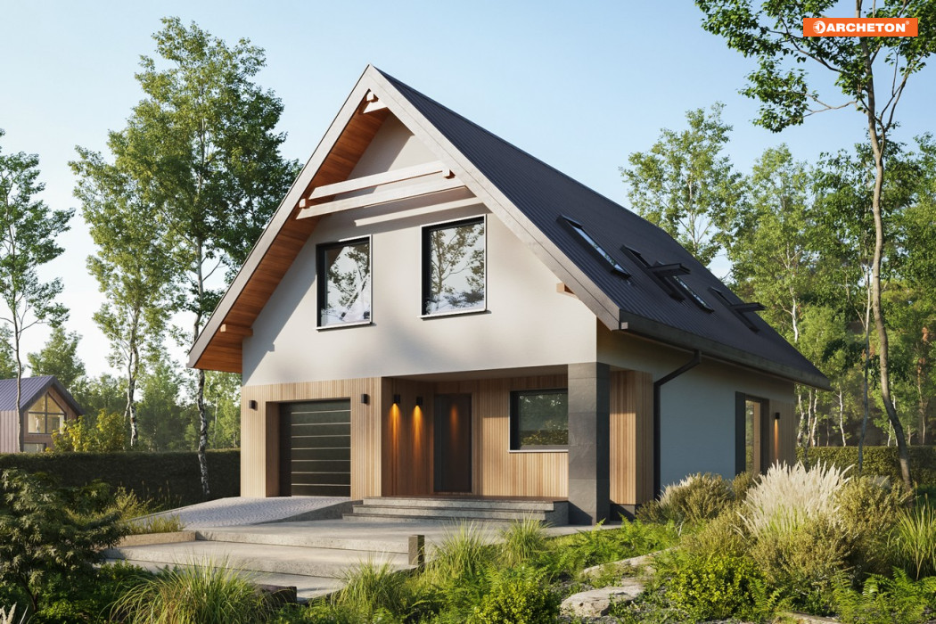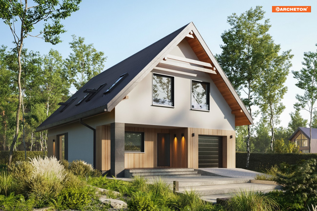Zaprojektowany na potrzeby pięcioosobowej rodziny Dominik Prima to liczący 114 m² dom z poddaszem użytkowym i garażem w bryle budynku. Przemyślane rozwiązania konstrukcyjne sprawiają, że szczególnie docenią go miłośnicy dobrze doświetlonych przestrzeni, którzy lubią spędzać dużo czasu na świeżym powietrzu.</p><p>Dominik Prima to dom, który ma 114 m² - taki metraż sprawia, że komfortowo może w nim żyć pięcioosobowa rodzina. Na użytkowym poddaszu znajdują się aż cztery pokoje, a na parterze oprócz salonu zmieścił się jeszcze gabinet (który może pełnić funkcję pokoju gościnnego). Nie brakuje też pomieszczeń do magazynowania i prac gospodarczych – są tu spiżarnia, pralnia, wiatrołap, kotłownia i schowek, a także dodatkowe WC (oprócz łazienki na poddaszu). W projekcie tego liczącego 114 m² domu ciekawym architektonicznie pomysłem jest balkon. Dzięki temu, że jest on cofnięty w głąb budynku, znajdujący się nad nim dach osłania go od góry i od boków. Dzięki temu można na nim wypoczywać również w niepogodę