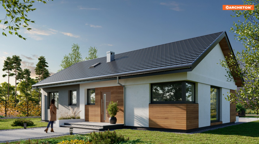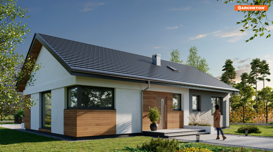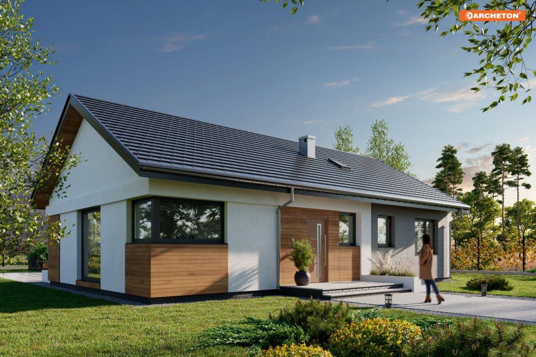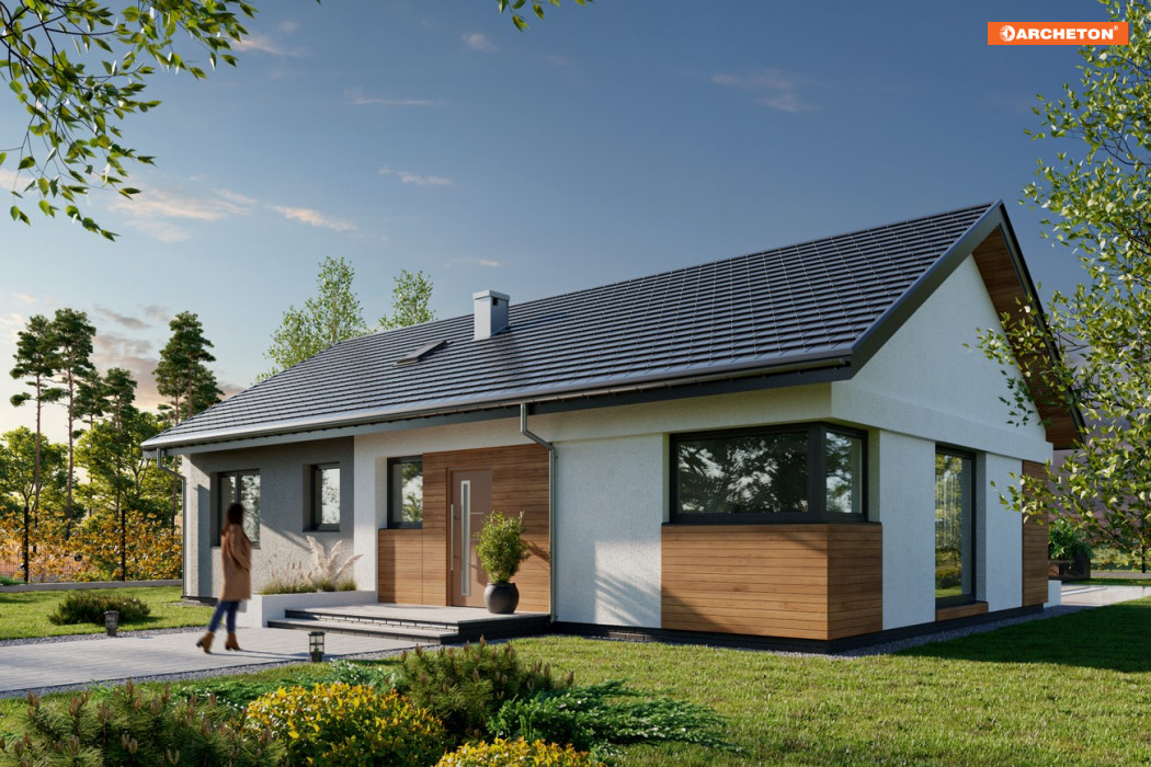 Ten prostokątny, parterowy dom pozbawiony jest wykuszy, balkonów i lukarn. Jego zwarta bryła przyciąga jednak wzrok dzięki nietypowo rozwiązanej elewacji, która dzieli ścianę frontową na dwie części. Lewą pokryto modnym, szarym tynkiem, natomiast prawą zdominowała biel przełamana wstawkami w odcieniach ciepłego drewna.