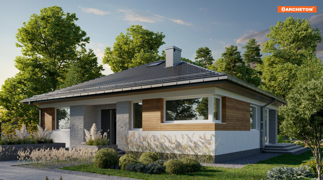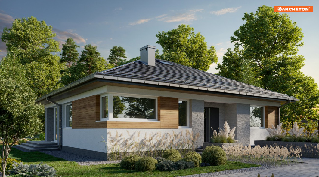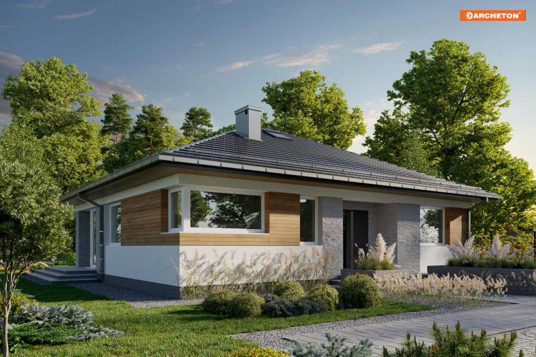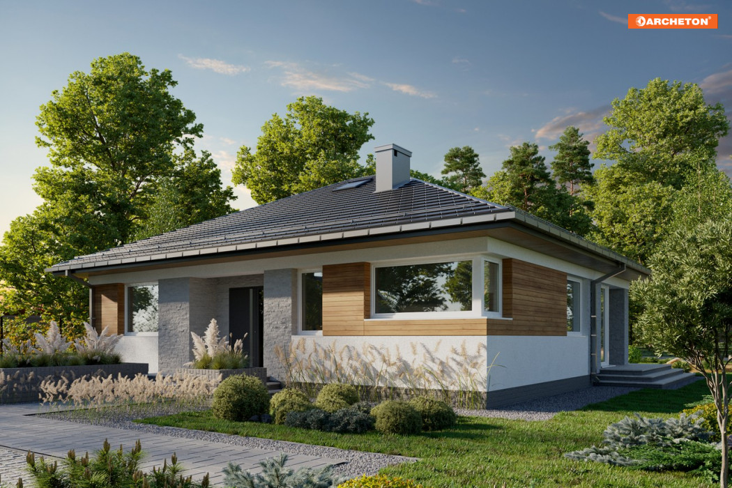 Duża ilość okien sprawia, że przestrzeń mieszkalna jest doskonale doświetlona, a bryła kwadratowego domu z dachem kopertowym nabiera lekkości.