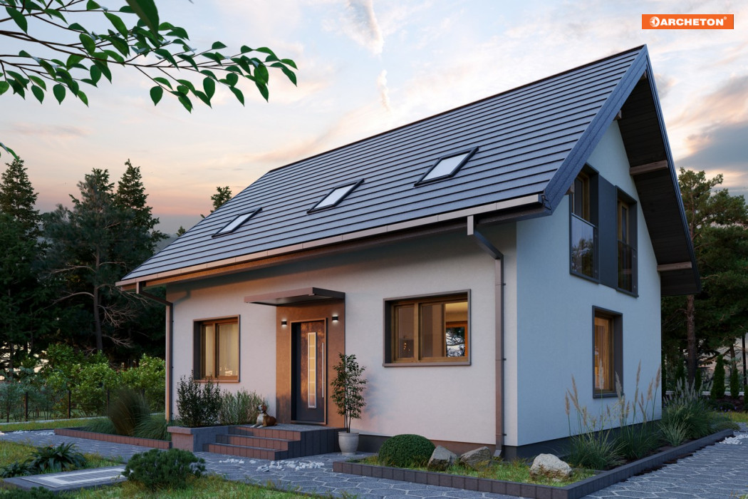 Na poddaszu tego prostego domu z dachem dwuspadowym znajdują się trzy ustawne pokoje. Dzięki portfenetrom są one bardzo dobrze doświetlone światłem dziennym.