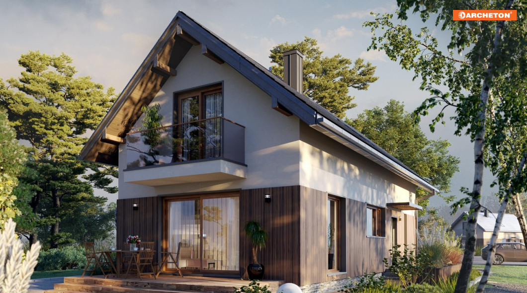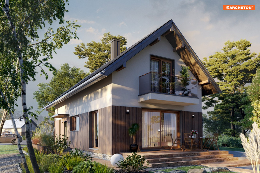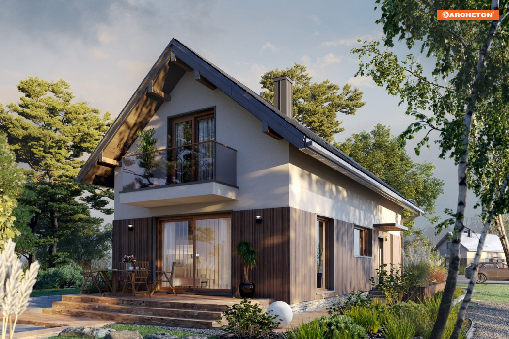 Jak przystało na zaprojektowany dla 5-osobowej rodziny mały dom o nieco rustykalnym stylu, w usytuowanym na parterze salonie znajduje się kominek, współtworzący wrażenie przytulności. Latem dostępna powierzchnia powiększa się o duży taras, na który wychodzi się bezpośrednio z salonu. Na parterze znajduje się jeszcze kotłownia oraz dodatkowy pokój z przylegającą do niego łazienką i sporą garderobą z oknem. Na piętrze są trzy przestronne, ustawne pokoje. Z każdego z nich można wyjść na jeden z dwóch balkonów, które są symetrycznie umieszczone na ścianach szczytowych i osłonięte przez okap szczytowy.