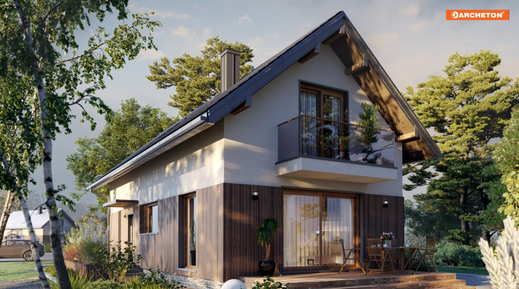 Longinus Prima to mały dom dla 5-osobowej rodziny – idealny na wąską działkę. Z zewnątrz uwagę przykuwa pięknie zaprojektowana elewacja, gdzie ciepły odcień drewnopodobnej okładziny kontrastuje z białym tynkiem okalającym górną kondygnację. Takie połączenie nadaje budynkowi nieco rustykalny rys.