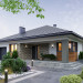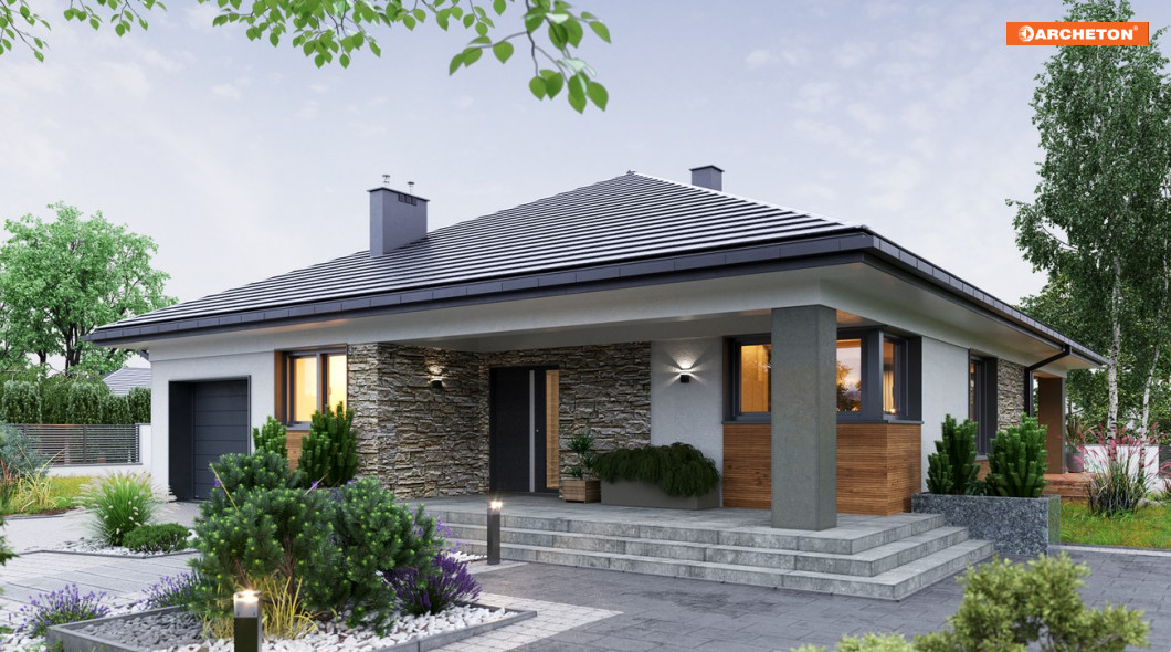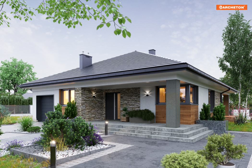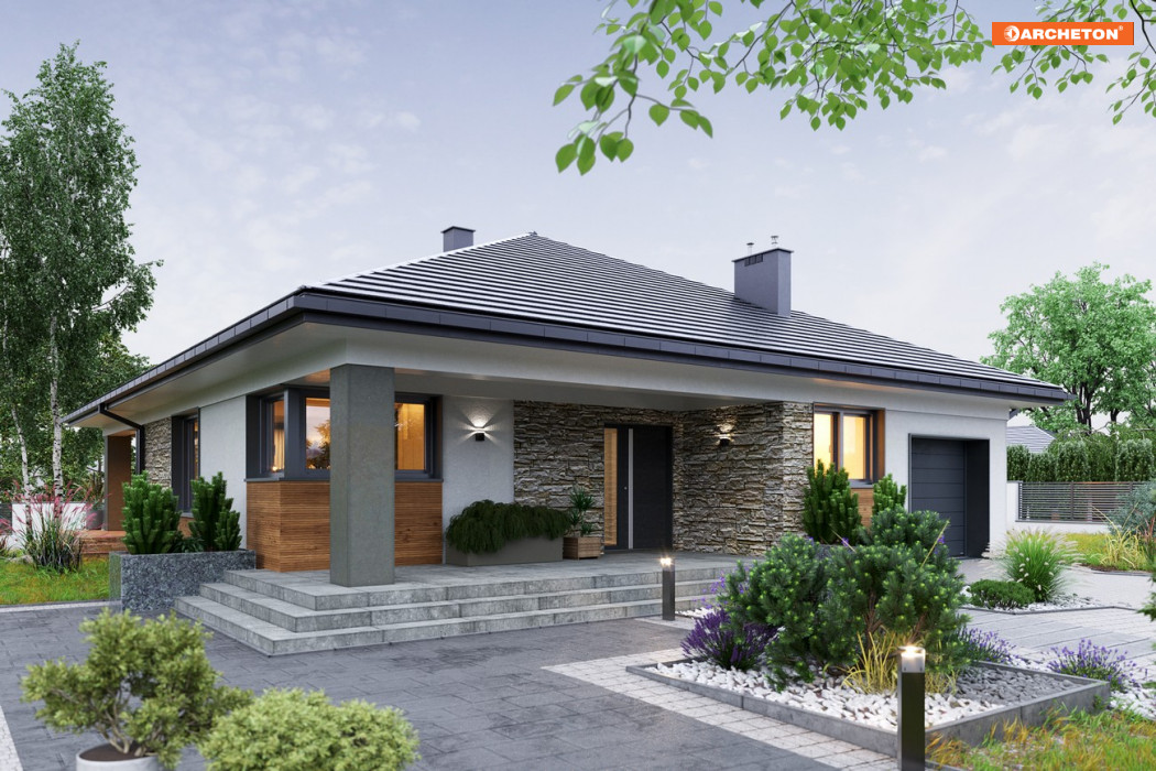 Przykryty czterospadowym dachem, parterowy budynek ma strefę wejściową oraz taras usytuowany w podcieniu, co pozwala na korzystanie z tych przestrzeni w każdą pogodę. Do bocznej ściany domu przylega jednostanowiskowy garaż, z którego można bezpośrednio dostać się do środka przez obszerną pralnię połączoną z kotłownią. Po lewej stronie od wejścia znajduje się kuchnia połączona z pokojem dziennym i jadalną, skąd można wyjść na taras.
