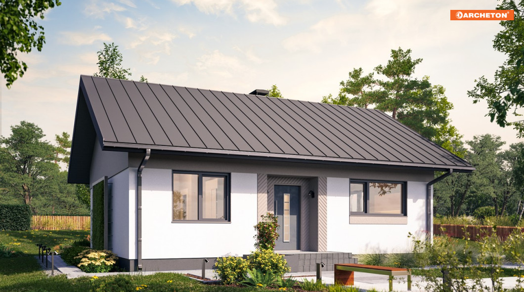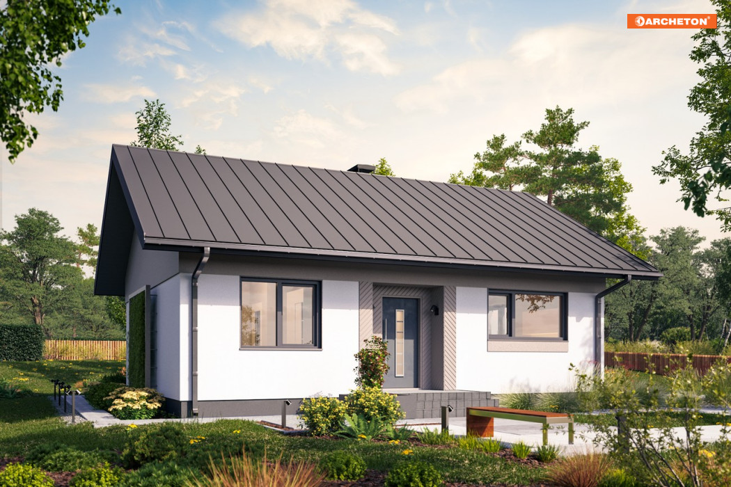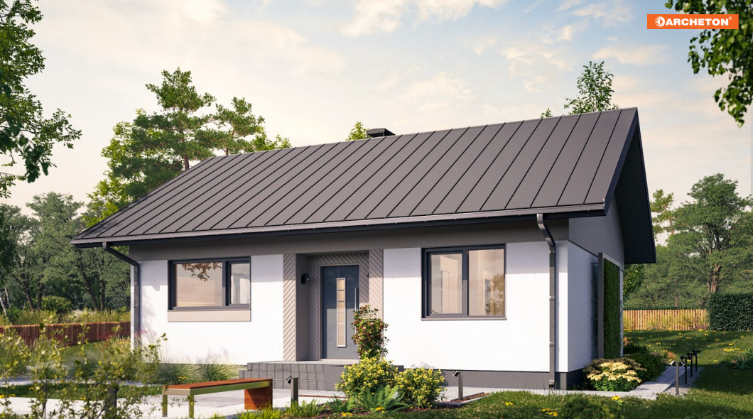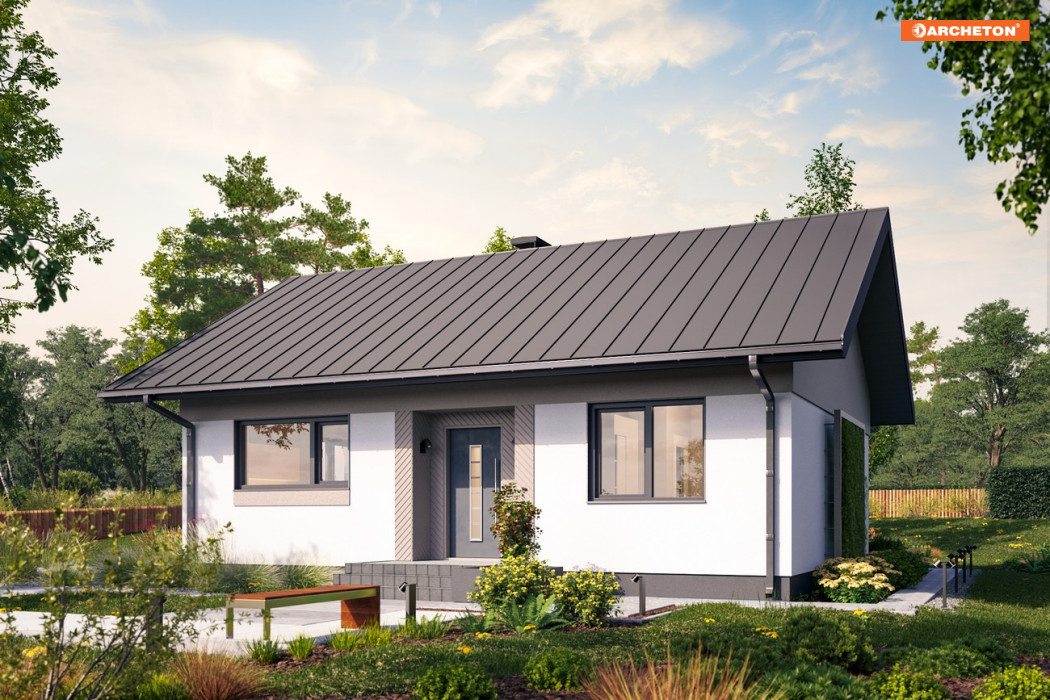 Antek Meta to parterowy dom dla 3-osobowej rodziny, o powierzchni użytkowej 69 m². Prosta bryła z dwuspadowym dachem prezentuje się efektownie dzięki pokrytej jasnym tynkiem elewacji, która podkreślona jest szarymi detalami i ciemnym pokryciem dachowym.