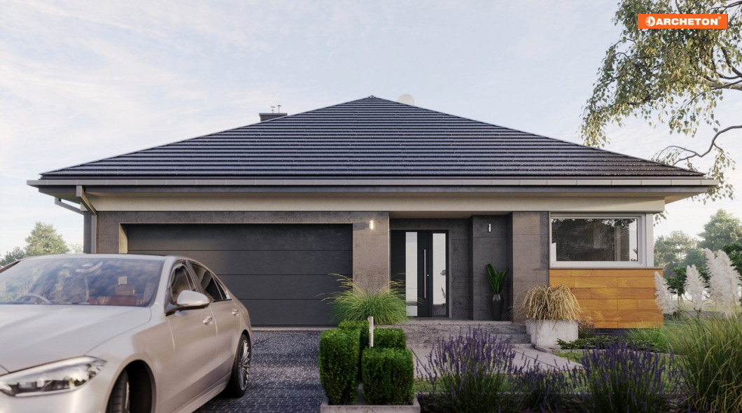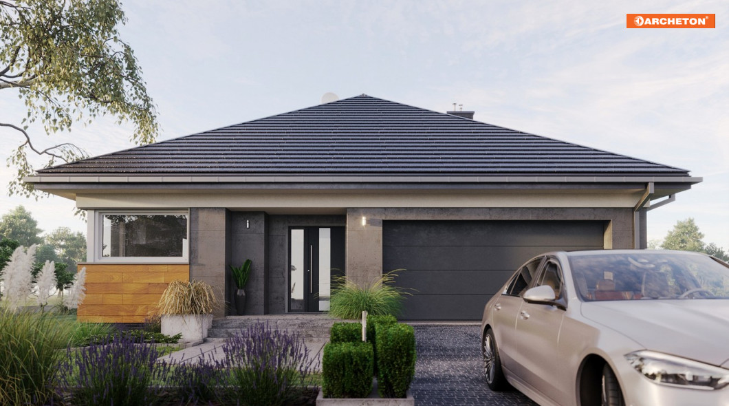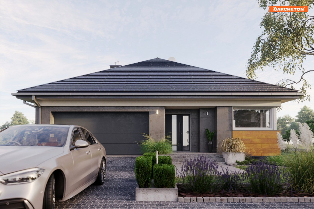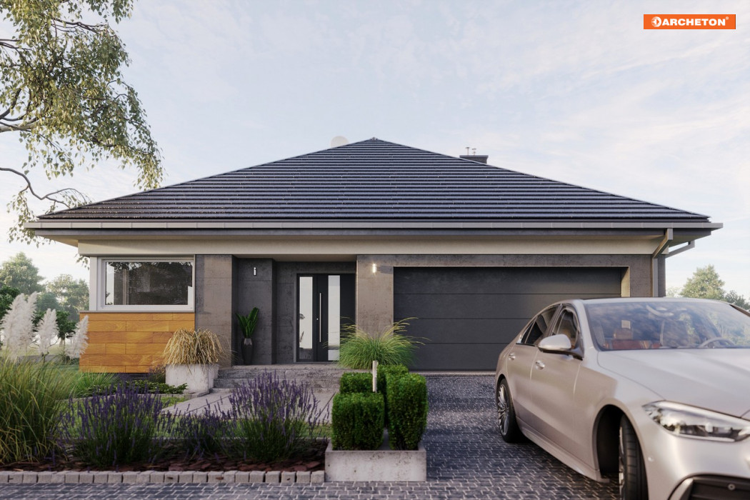 Dom parterowy z garażem w bryle budynku Adela zachwyca przemyślanym projektem i atrakcyjnym wyglądem. Czterospadowy dach wieńczy prostą bryłę, której uroku dodają drewniana okładzina i tynk o strukturze betonu. Dwustanowiskowy garaż wkomponowany w budynek zapewnia wygodę, a szybkie przejście przez wiatrołap ułatwia codzienne funkcjonowanie.