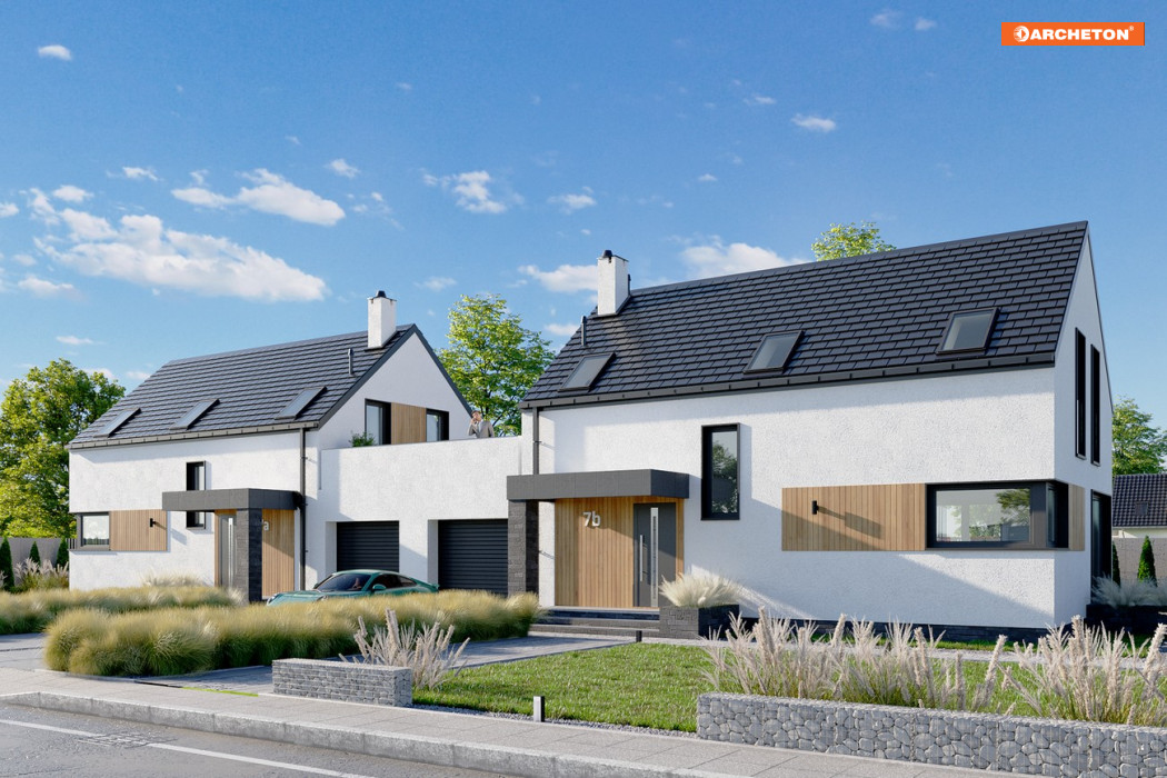 Połączone garażami z płaskim dachem budynki są przykryte dachami dwuspadowymi, których kalenice usytuowane są równolegle do drogi dojazdowej. Ta nieoczywista gra geometrią form daje bardzo ciekawy architektonicznie efekt. Wnętrze każdego z domów bliźniaków połączonych garażem to z kolei cała gama sprawdzonych i cenionych w tego typu budownictwie rozwiązań. Na parterze znajduje się wspólna przestrzeń: obszerny pokój dzienny z kuchnią i jadalnią, a także łazienka i dodatkowy pokój. Po schodach, które doświetlone są światłem dziennym, wchodzi się na wyższą kondygnację. Znajdują się tu trzy pokoje (w tym jeden połączony z garderobą) oraz duża łazienka. Wszystkie pomieszczenia są bardzo dobrze doświetlone dzięki portfenetrom oraz oknom dachowym.