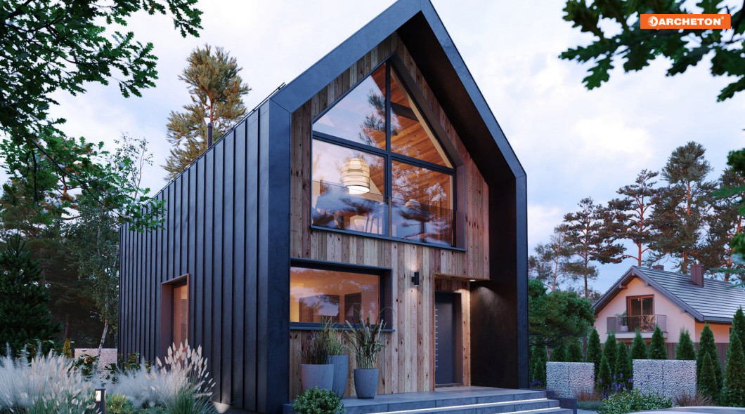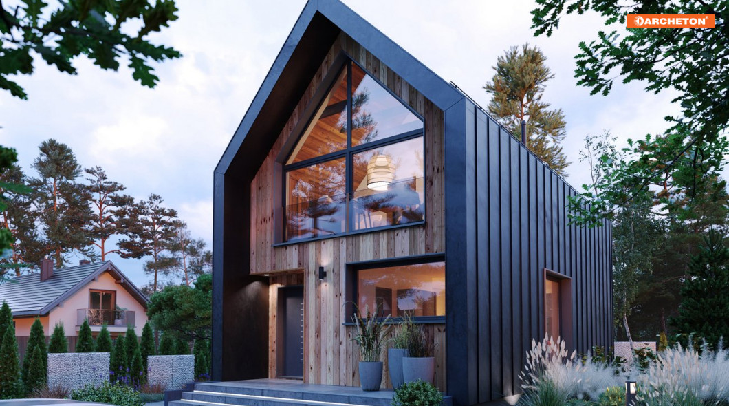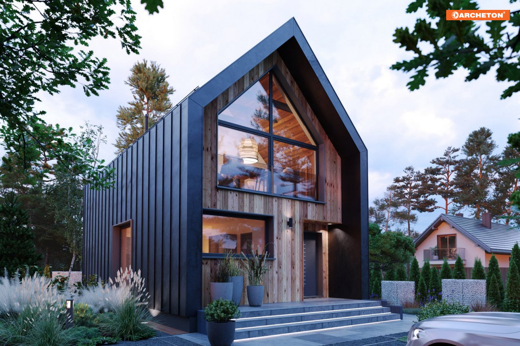 Ara 81 to całoroczny dom w typie nowoczesnej stodoły z poddaszem użytkowym. Ponad 71 m² rozplanowano w taki sposób, aby mogła tu wygodnie mieszkać czteroosobowa rodzina. Prosta, a zarazem bardzo oryginalna bryła, dwuspadowy dach bez okapów, drewnopodobna, ciemna elewacja i doskonale doświetlające wnętrze, duże przeszklenia na ścianach szczytowych – to cechy sprawiające, że trudno nie zwrócić na ten projekt uwagi.