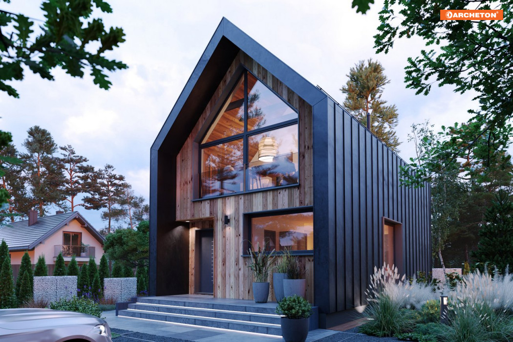 Z uwagi na swój kształt, dom Ara 81 idealnie sprawdzi się na wąskich działkach. Wejście do domu znajduje się w podcieniu, a lekko wysunięty poza obrys budynku dach nad ścianami szczytowymi tworzy dodatkową osłonę przed deszczem i śniegiem, zabezpieczając drzwi frontowe i taras.