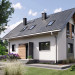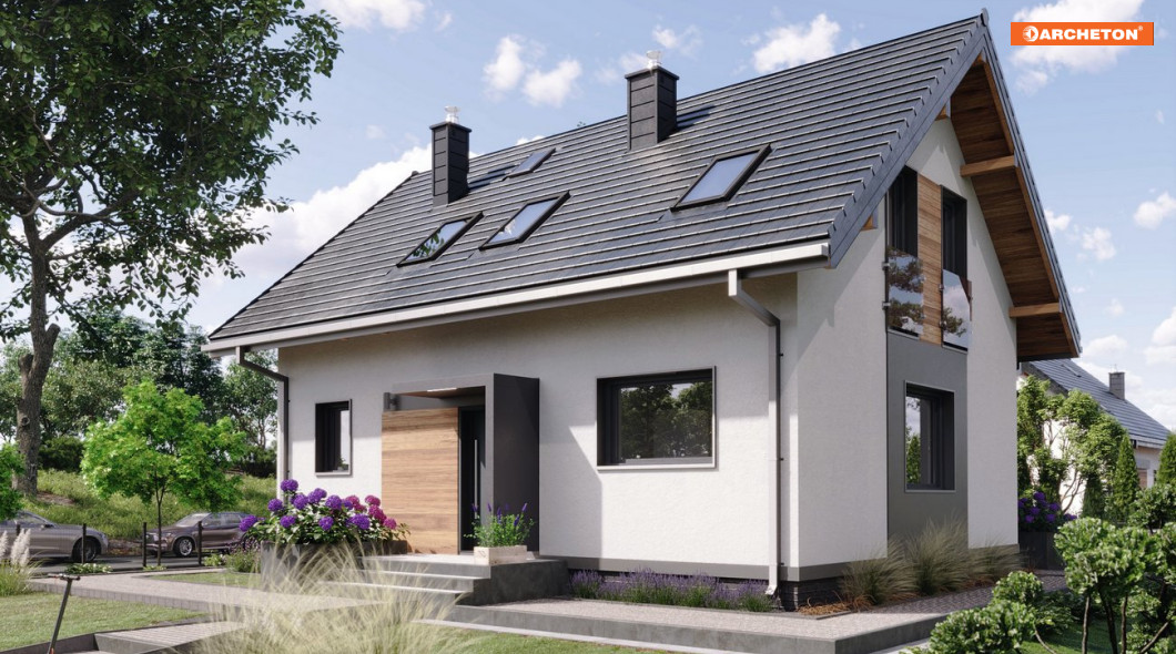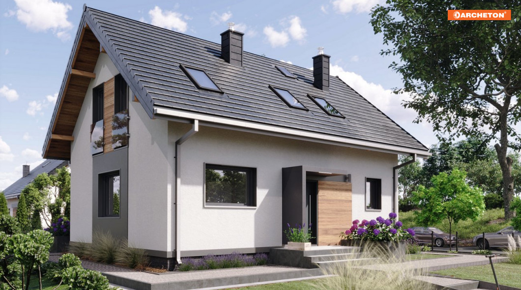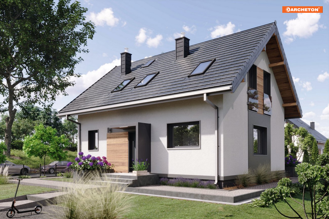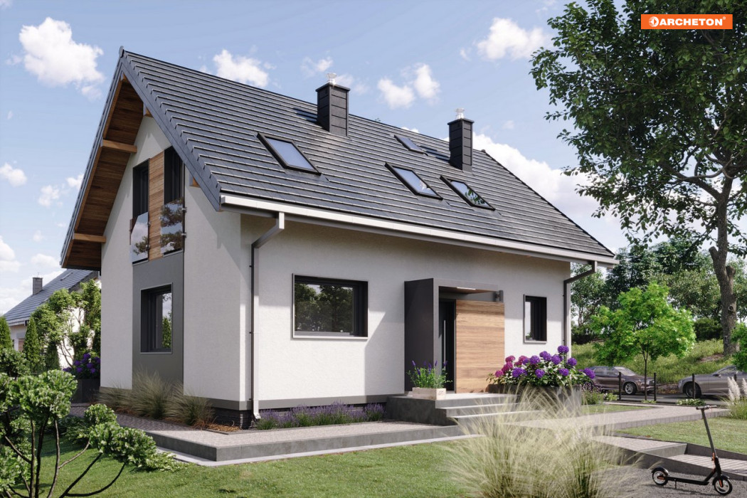 Kwintesencją projektu jest prosta bryła przykryta dachem dwuspadowym, z kalenicą równoległą do drogi dojazdowej. Z zewnątrz budynek nawiązuje do nowoczesnej stylistyki, której wyznacznikami jest biała elewacja przełamana szarymi akcentami. Całość ocieplają okładziny drewniane w strefie wejściowej, tarasowej oraz przy oknach, przez co projekt nabiera dynamiki.
