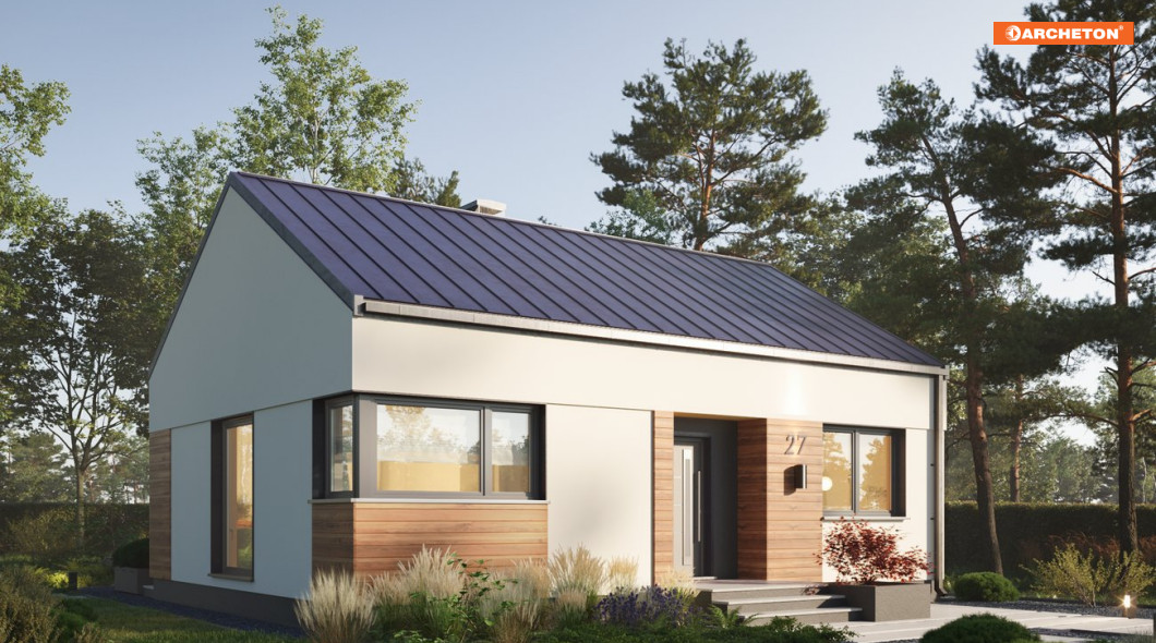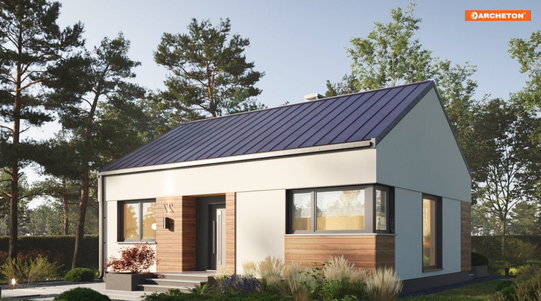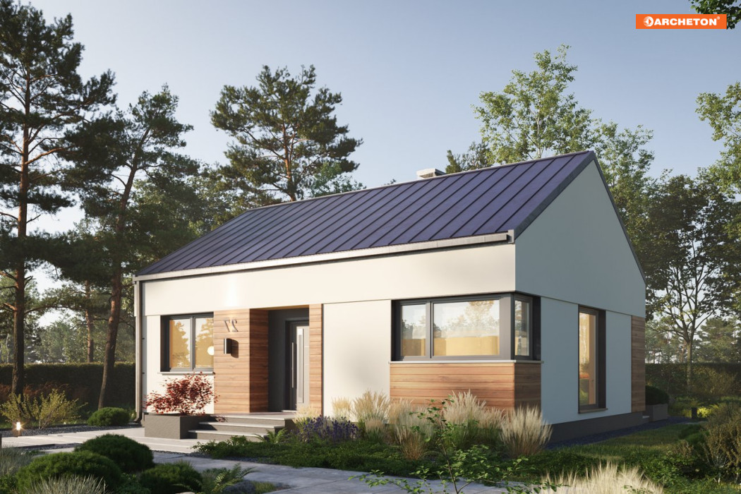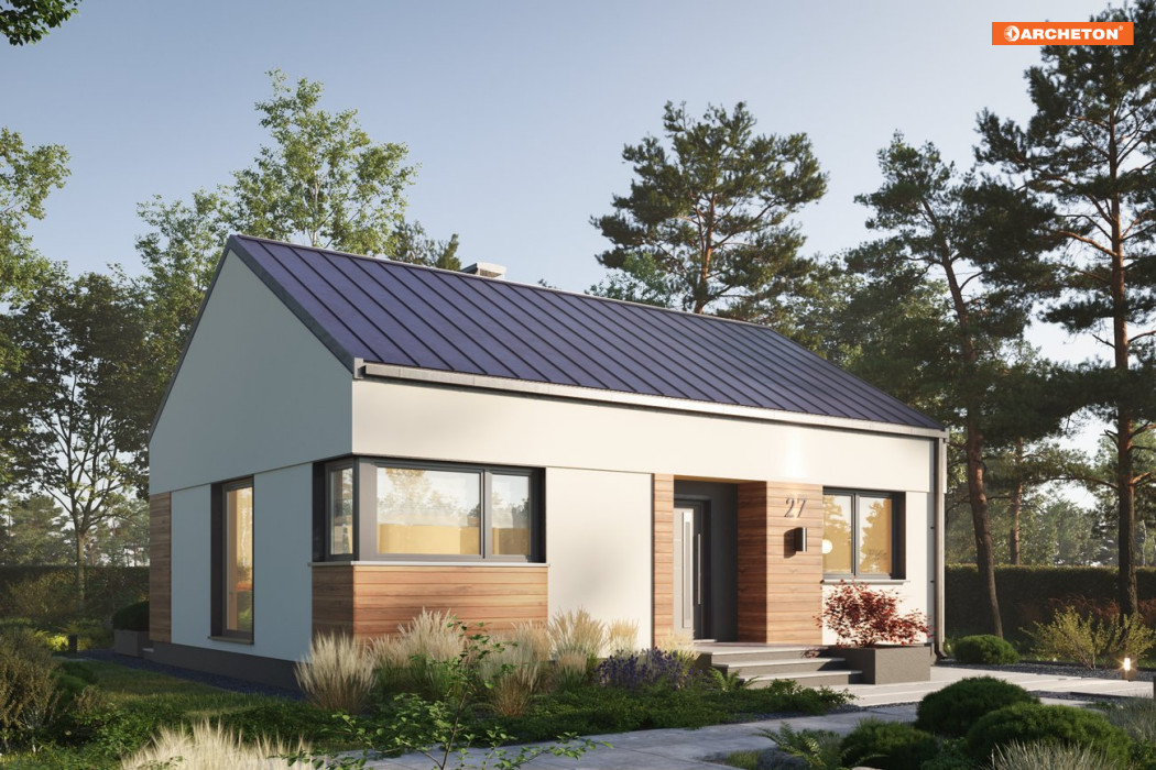 Bryła tego domu została przykryta dwuspadowym dachem, w którym zrezygnowano z okapów. Dzięki temu całość wygląda nowocześnie. Drzwi wejściowe zlokalizowano na dłuższej ścianie zewnętrznej w środkowej części budynku. Niewielki podcień osłania strefę wejściową, pozwalając komfortowo otworzyć zamek w drzwiach nawet podczas opadów deszczu. Narożne okno zlokalizowane w kuchni zapewnia szeroki widok na teren przed domem. Od strony elewacji ogrodowej znajduje się taras o szerokości bliskiej szerokości domu. Dostęp na niego jest możliwy z salonu i jednej z sypialni.
