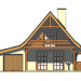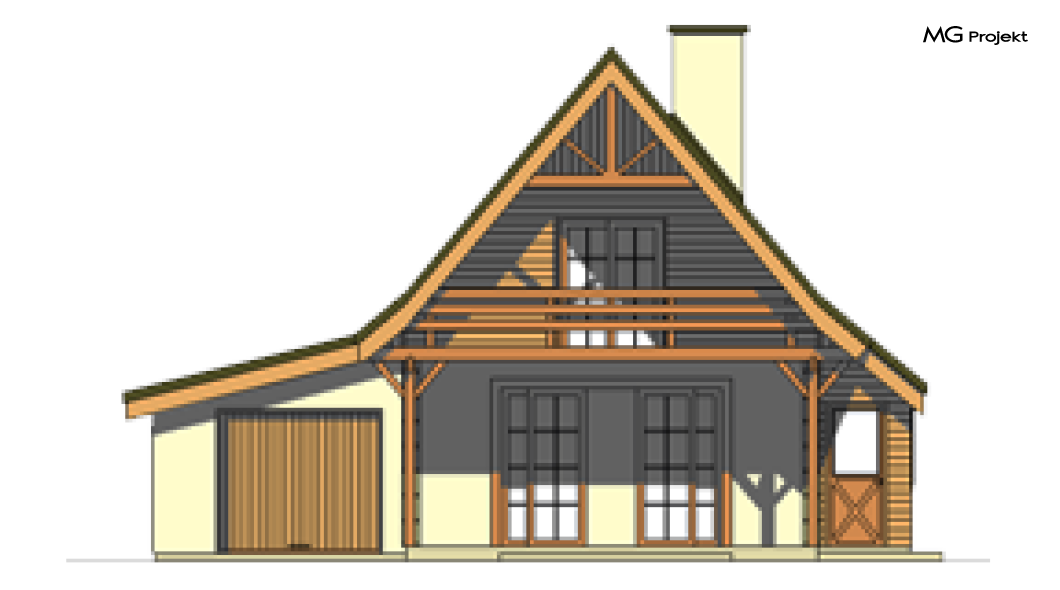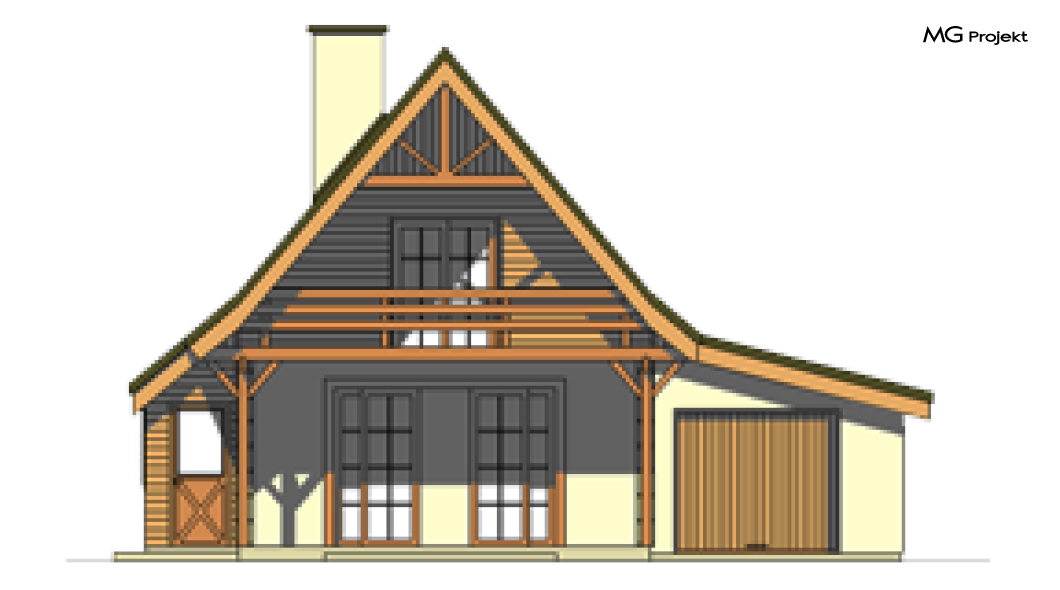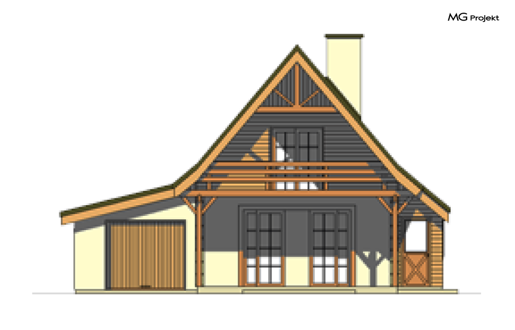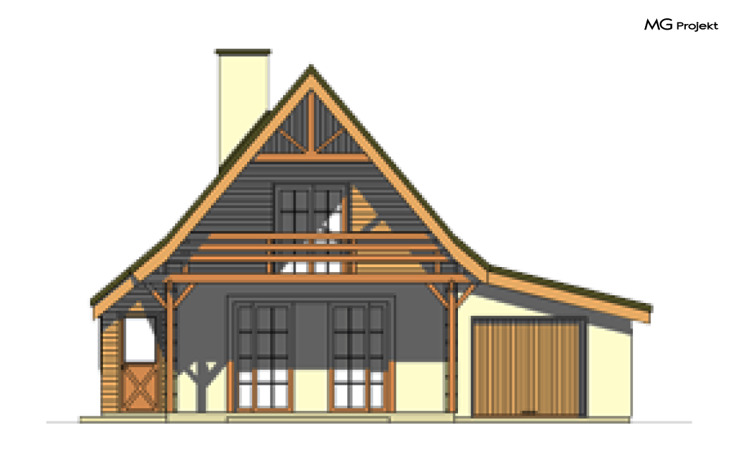 Wariant z dobudowanym garażem od strony elewacji bocznej, przy kuchni. Wjazd do garażu zaprojektowano od strony tarasu.
