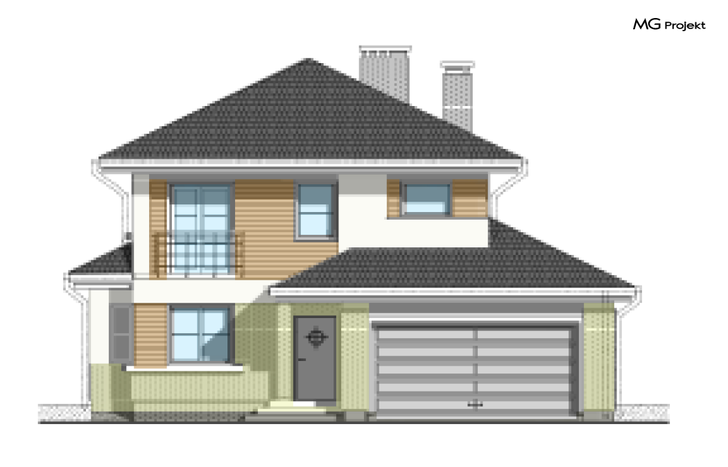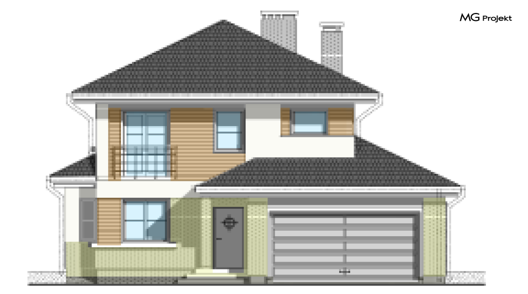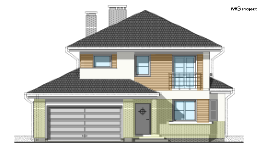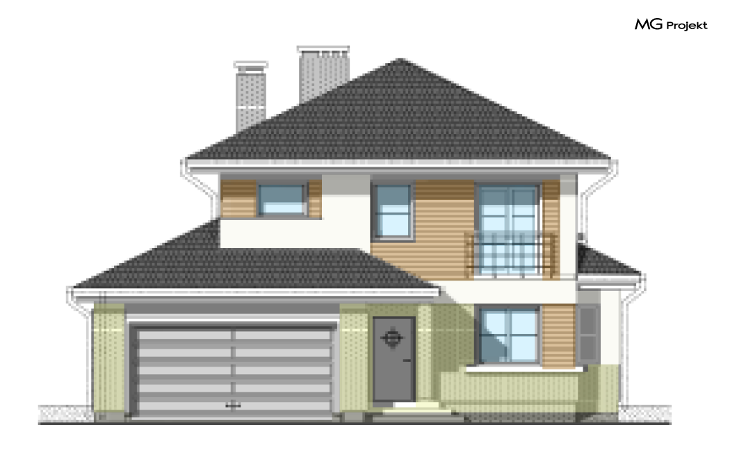 Wariant projektu ze stropem żelbetowym, z powiększonym wiatrołapem, ze zlikwidowanym uskokiem i podcieniem. Zadaszenie wejścia, dach na słupie.