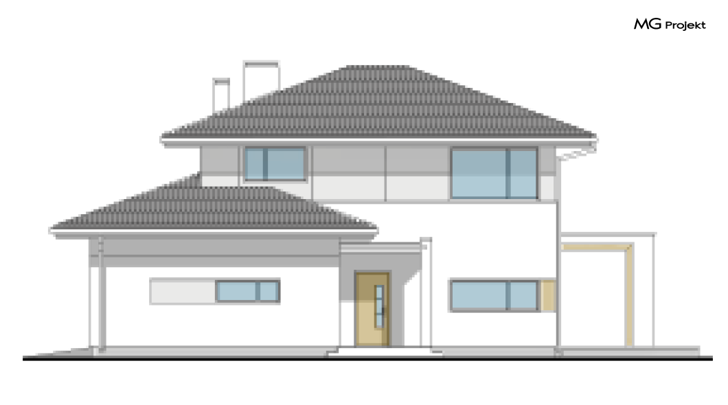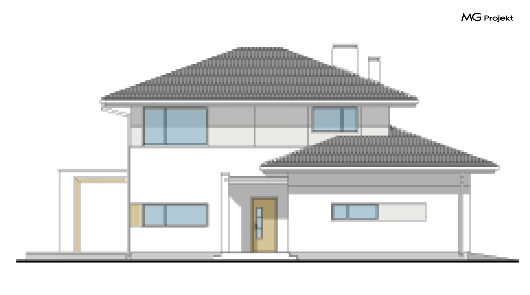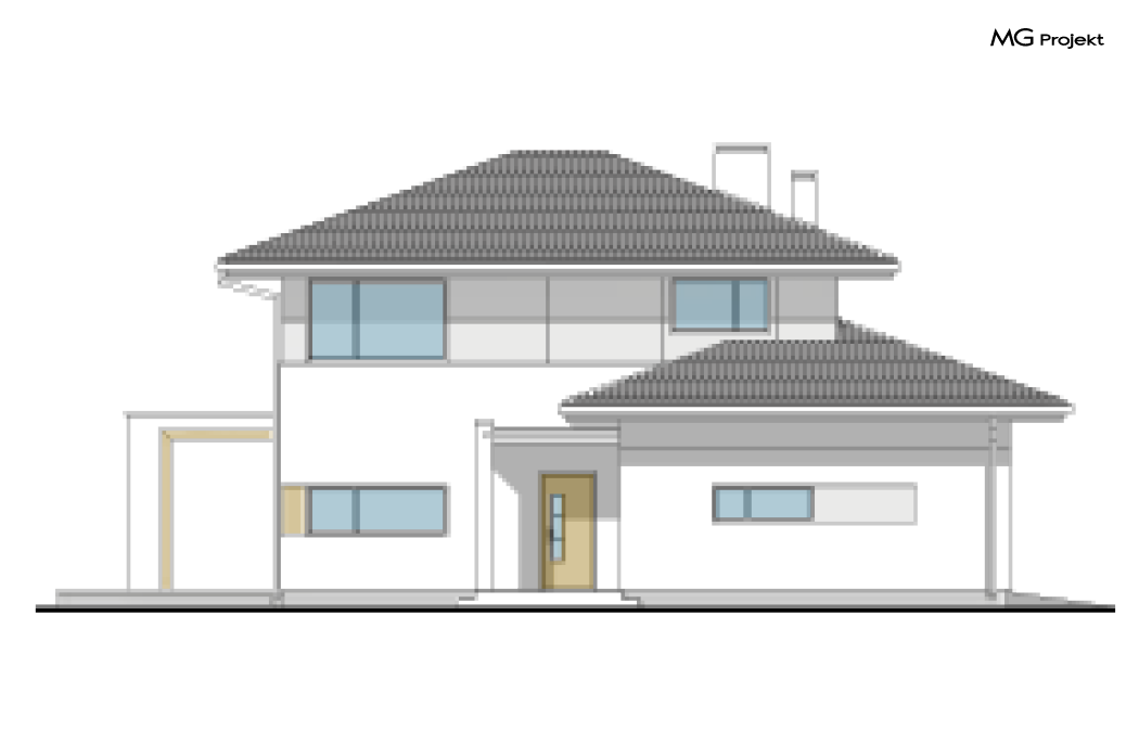 Wariant domu z garażem od strony elewacji bocznej oraz innym układem pomieszczeń na parterze i piętrze.
