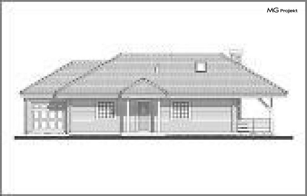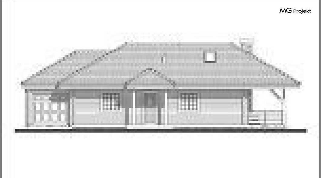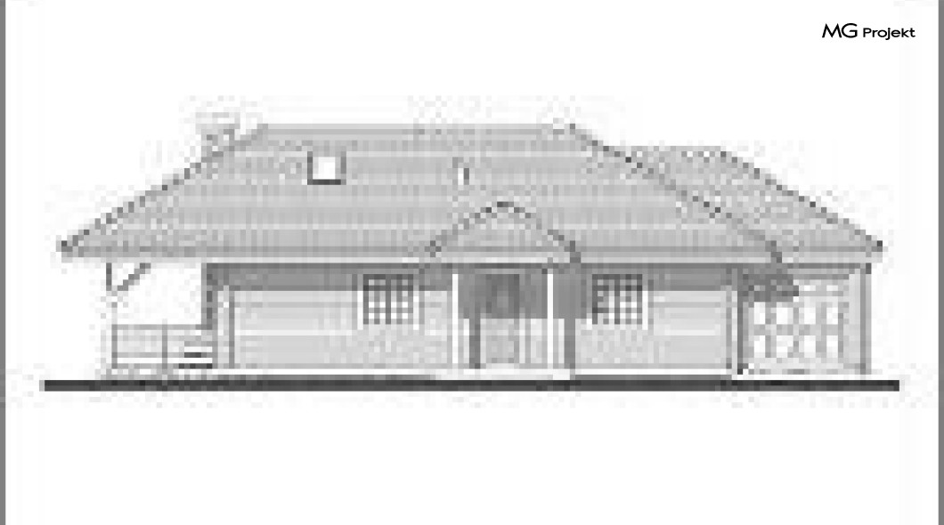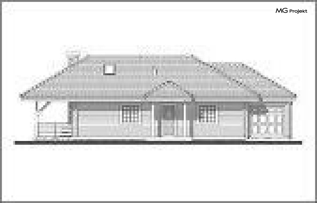 Większa wersja drewniana z bali z wiatą garażową i pomieszczeniem gospodarczym.