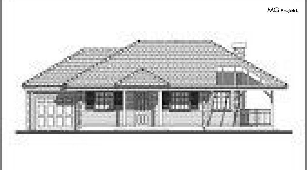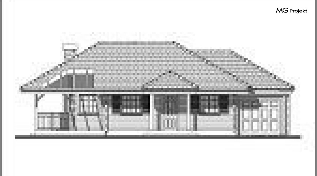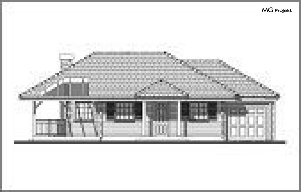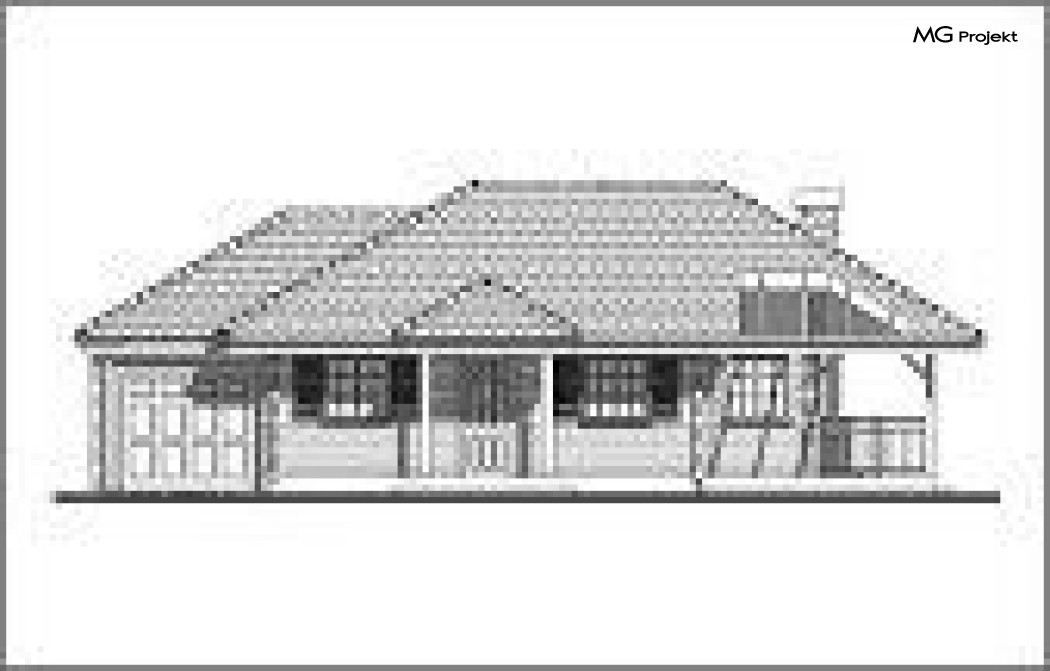 Wersja drewniana z bali z gankiem wejściowym, garażem i pom. gospodarczym.