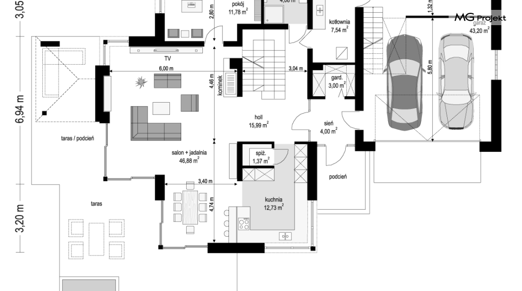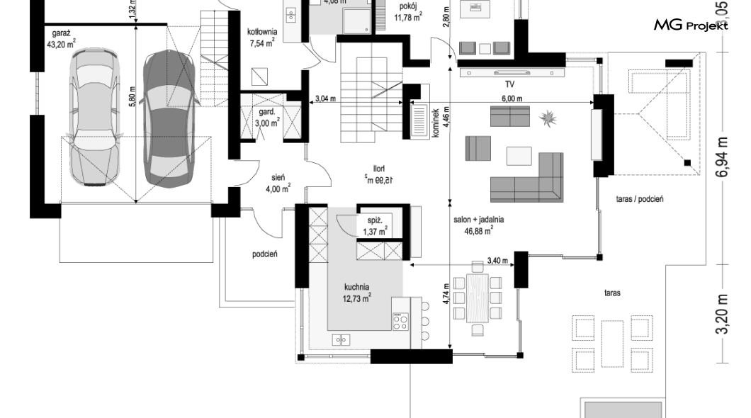 Wariant projektu ze zmianami: likwidacja pustki, dodatkowy pokój