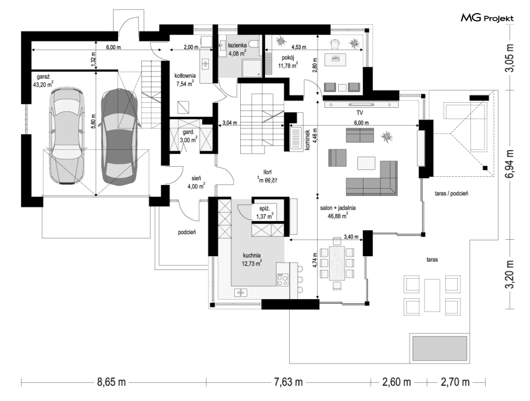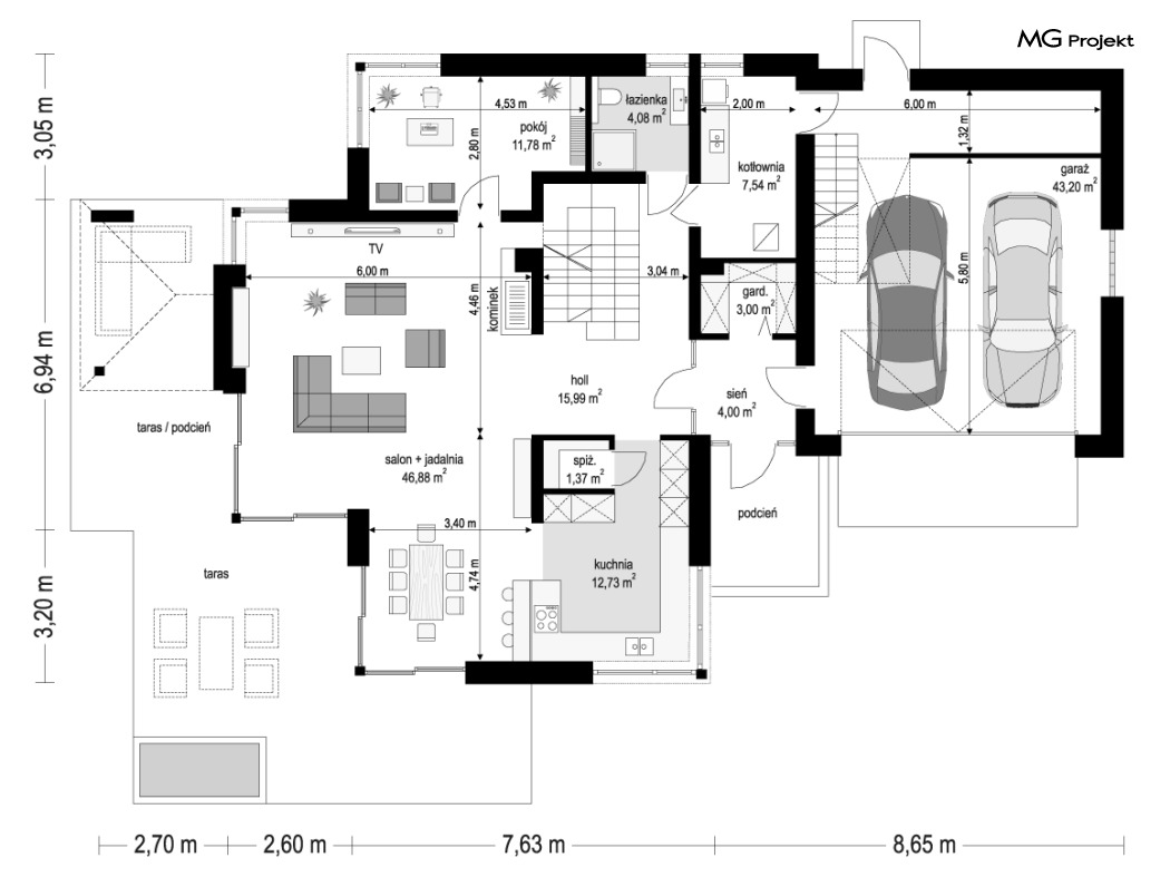Obejmuje koszt wszystkich robót stanu surowego, wykonania instalacji wewnętrznych oraz robót wykończeniowych.
