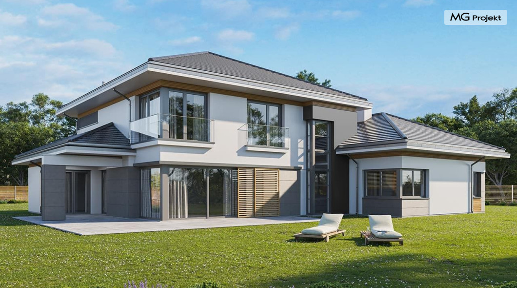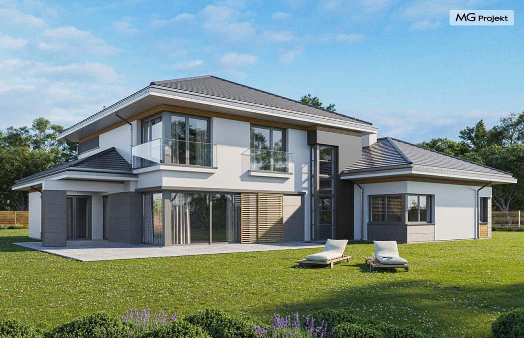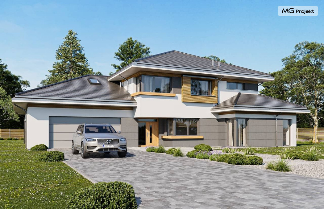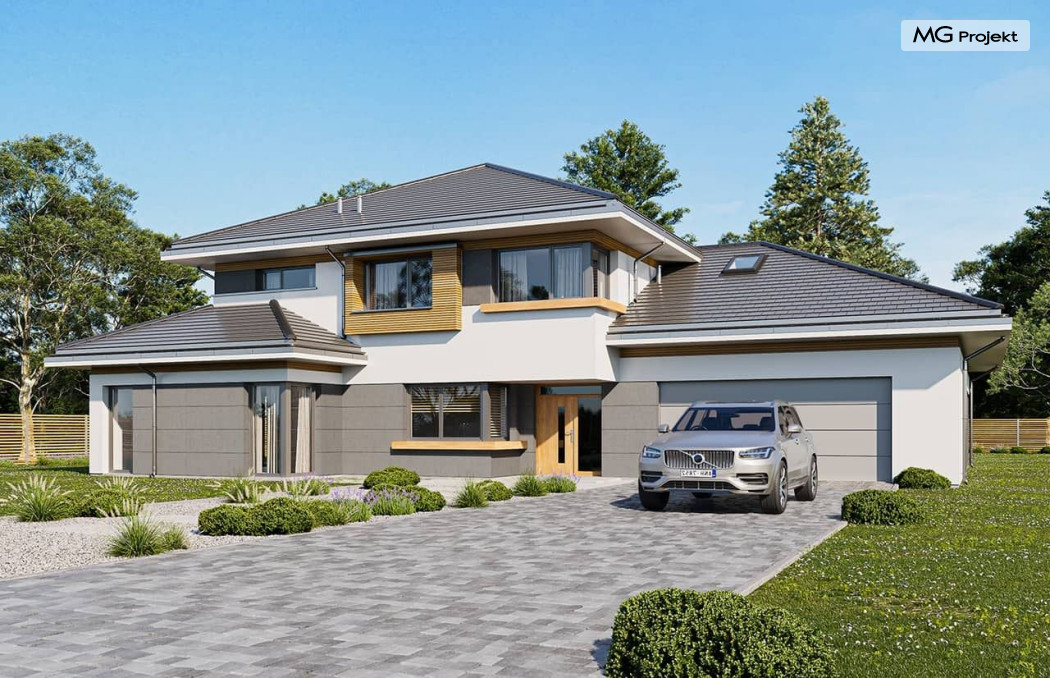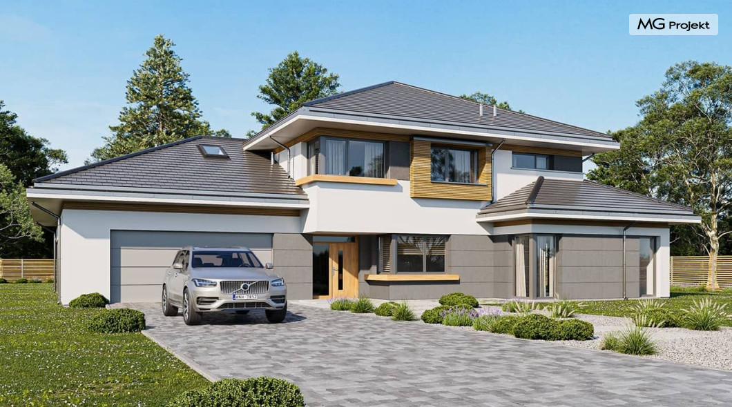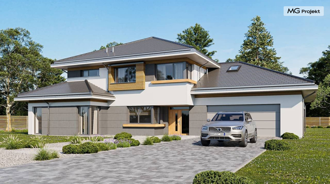 Wariant z 3 miejscami garażowymi, zlikwidowany kominek i zmiana układu pomieszczeń, dostosowany do standardu NF40 w zakresie projektu architektoniczno-budowlanego.