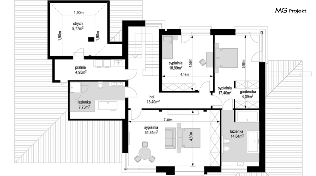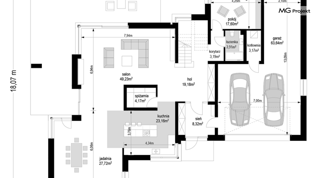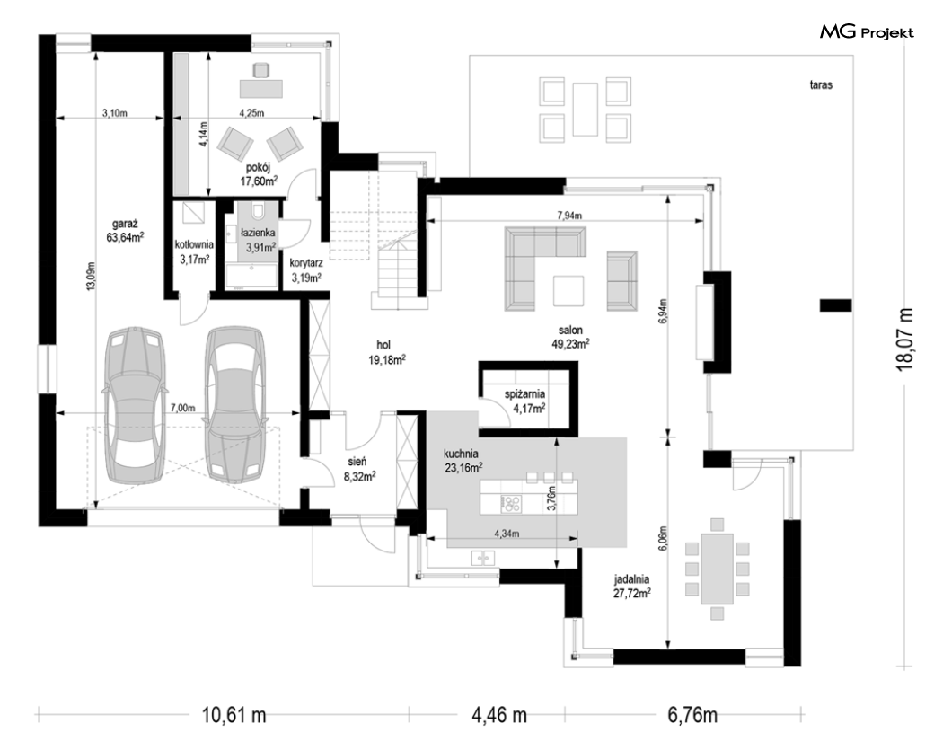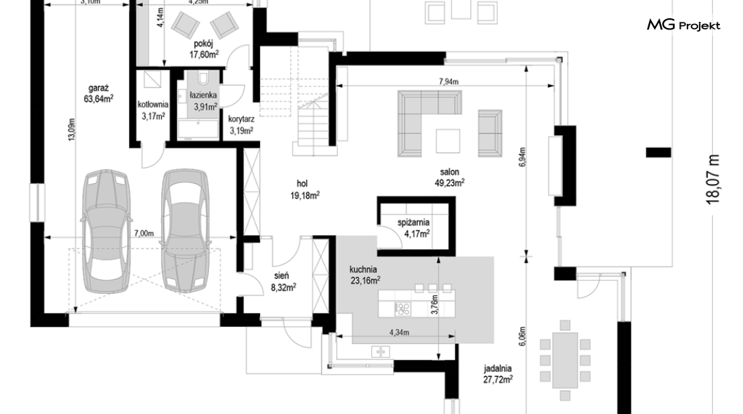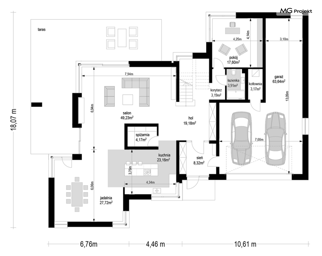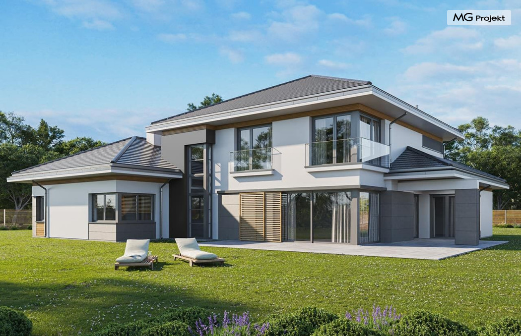 Wariant z 3 miejscami garażowymi, zlikwidowany kominek i zmiana układu pomieszczeń, dostosowany do standardu NF40 w zakresie projektu architektoniczno-budowlanego.