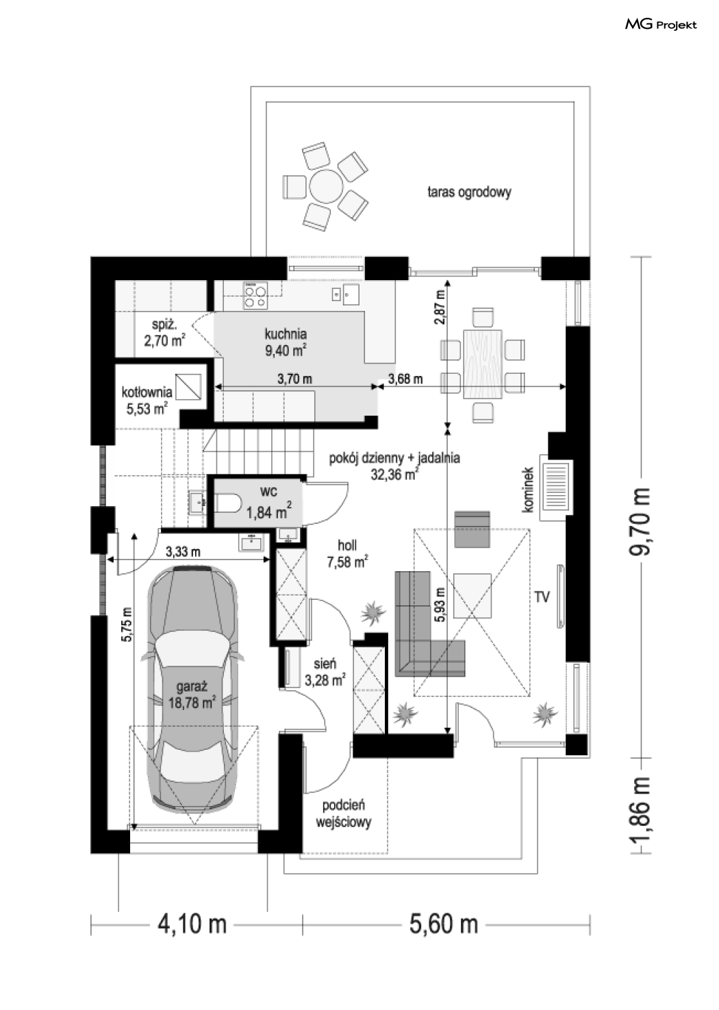 Wysokość wyznaczona od poziomu terenu do najwyżej położonej części dachu (np. kalenicy), zwykle bez uwzględnienia kominów.