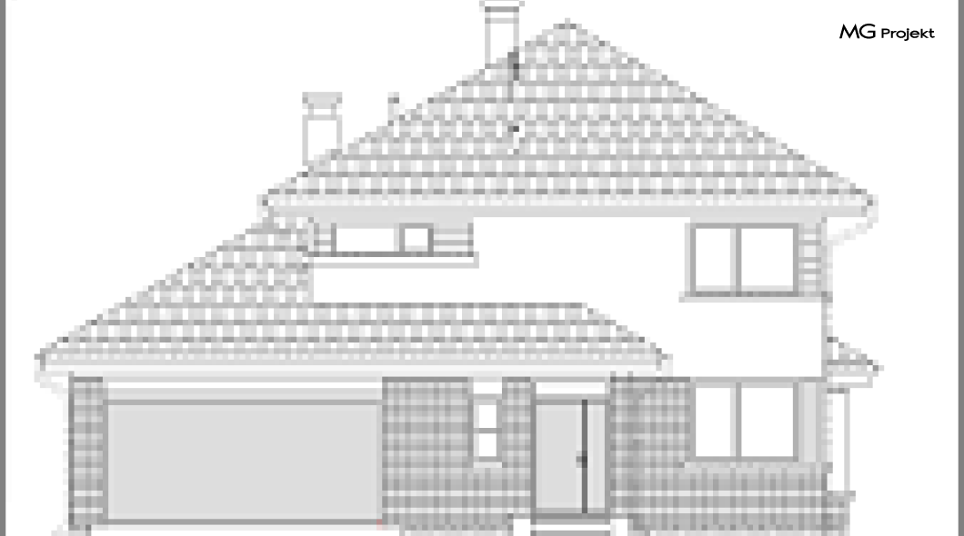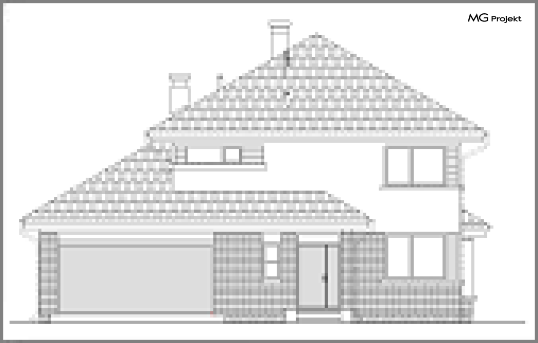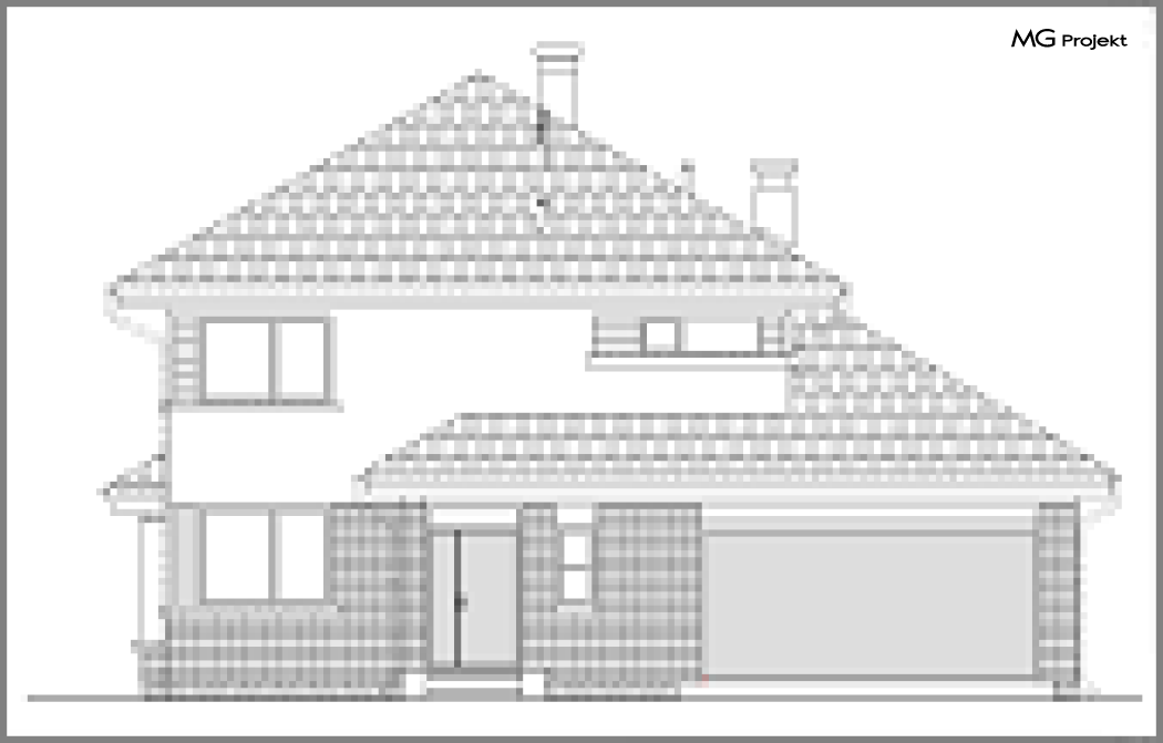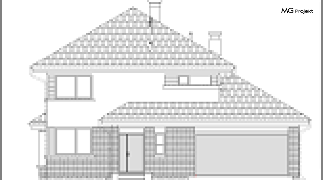 Wariant E projektu ze zwiększonym garażem, zmianą lokalizacji kotłowni i komina, innym układem pomieszczeń na parterze, wykusz w jadalni i całe piętro jak w wersji klasycznej heliosa.